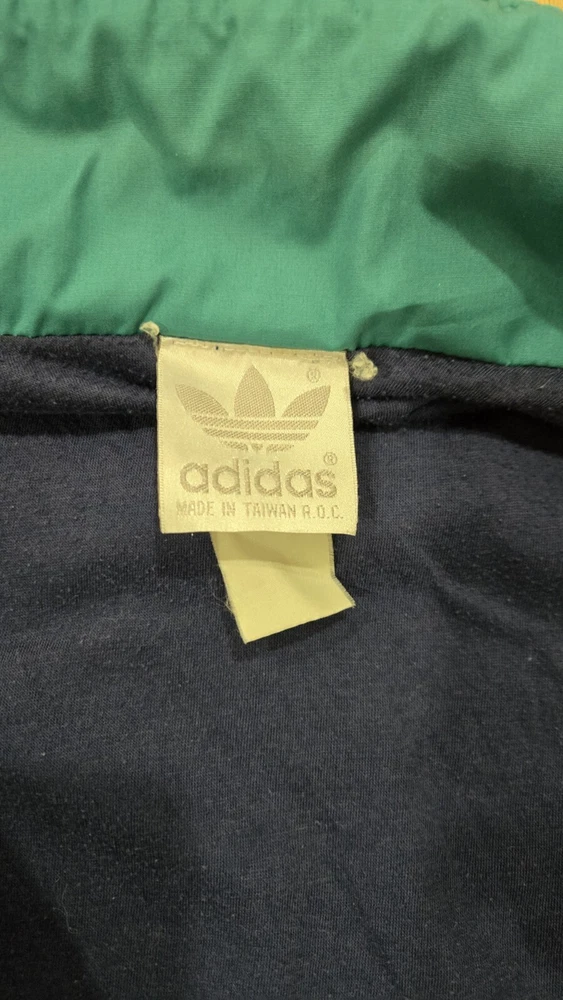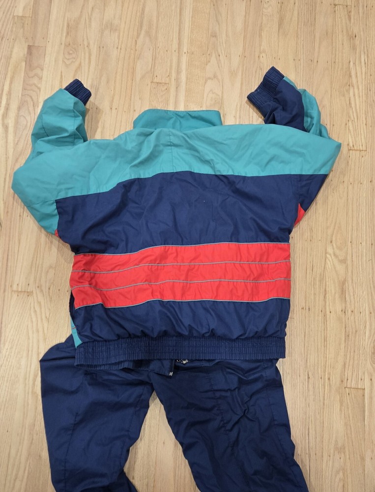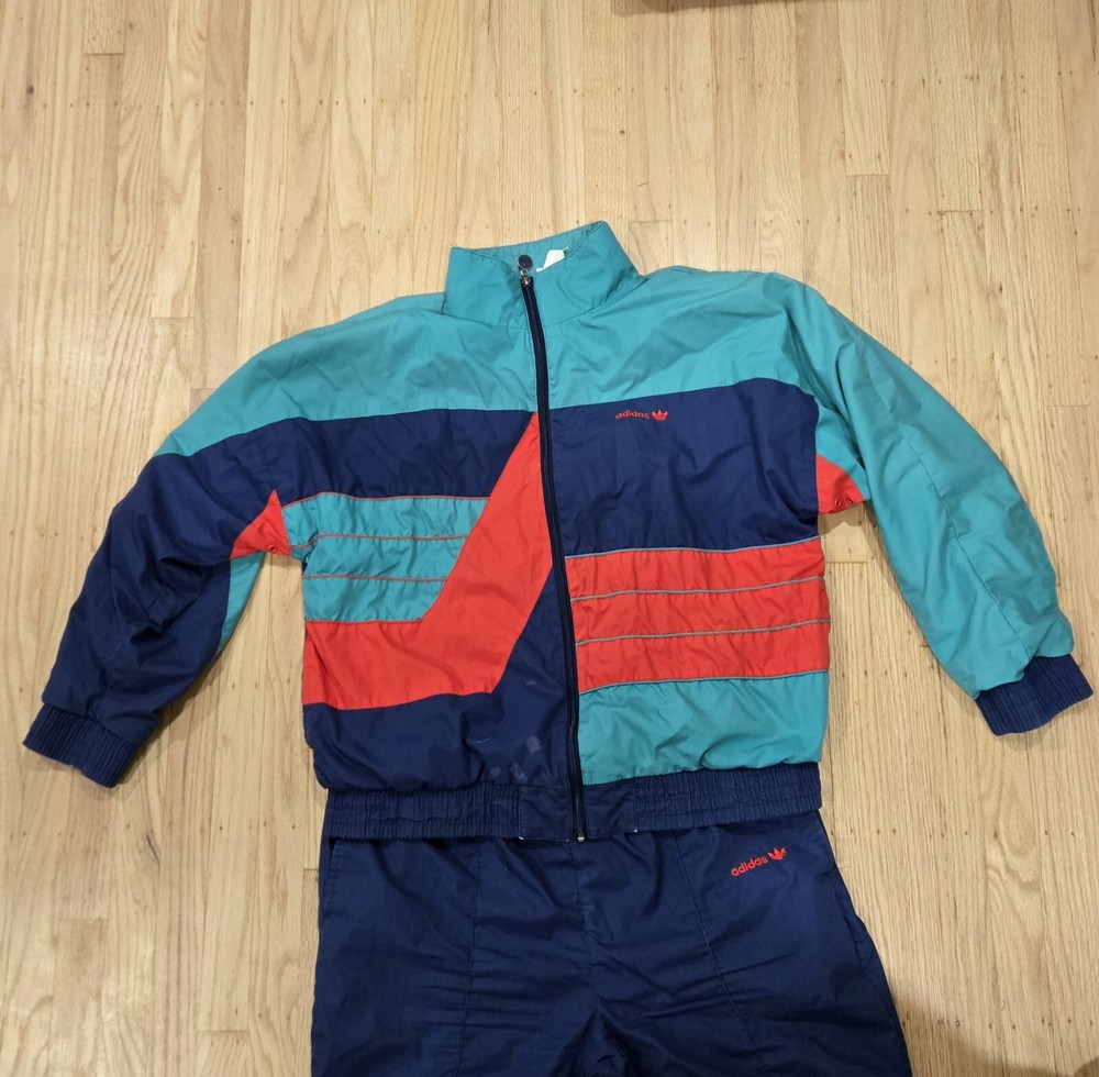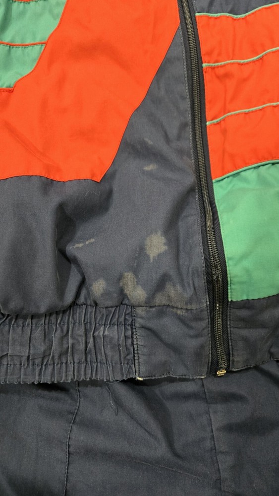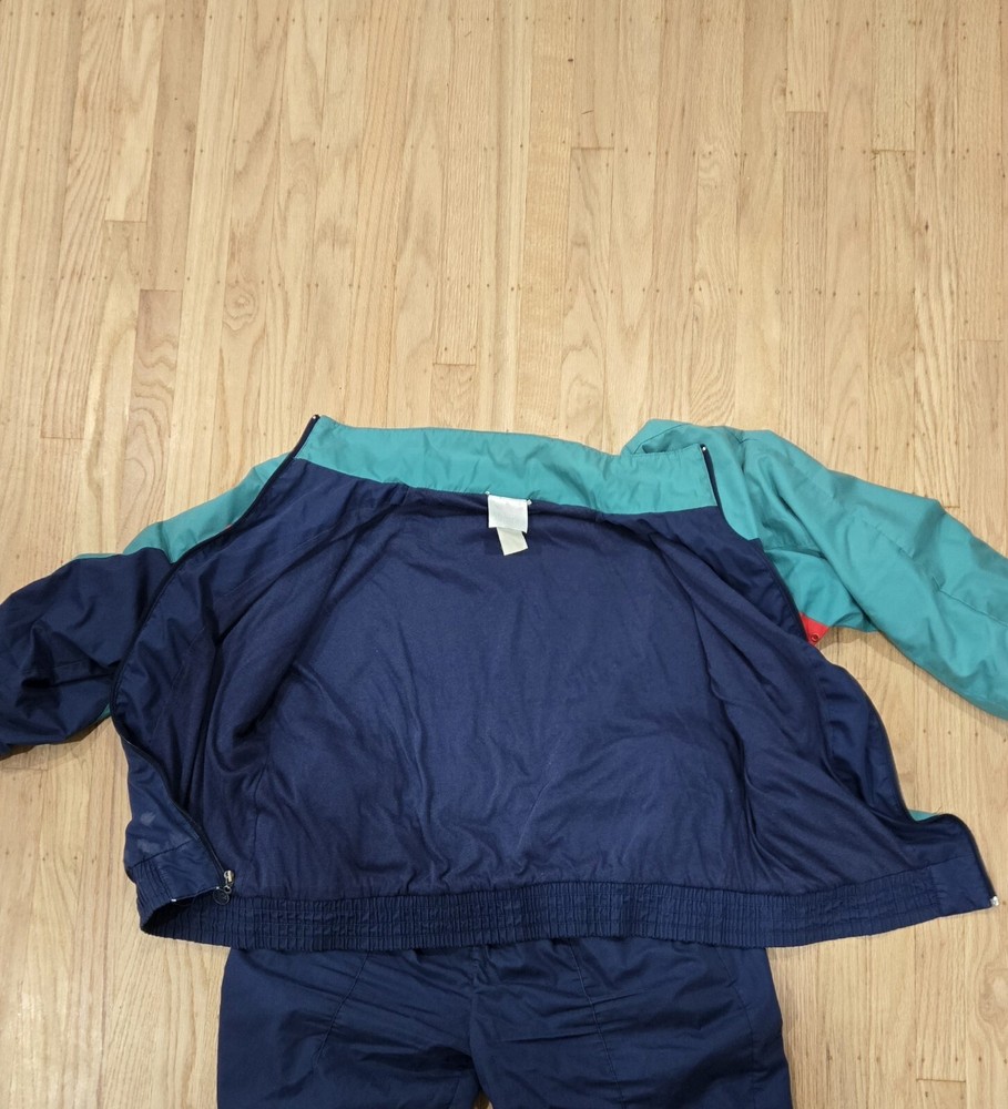 Stain on front of jacket. Rear pants seam is showing wear. This vintage Adidas track suit is perfect for men who want to add a touch of retro style to their wardrobe. The two-piece set includes a red, blue, and green colorblock track jacket and track pants with a tapered leg style. The jacket and pants are made of lightweight and wind-resistant nylon material, making them suitable for all seasons, whether it's summer, fall, or spring. The track suit features a regular fit and long sleeves, with the Adidas logo as an accent. It has pockets for added convenience and is machine washable for easy care. Ideal for gym and training, walking, running, and jogging, this tracksuit is perfect for athletic activities. It is also suitable for casual wear and travel, making it a versatile addition to any wardrobe.