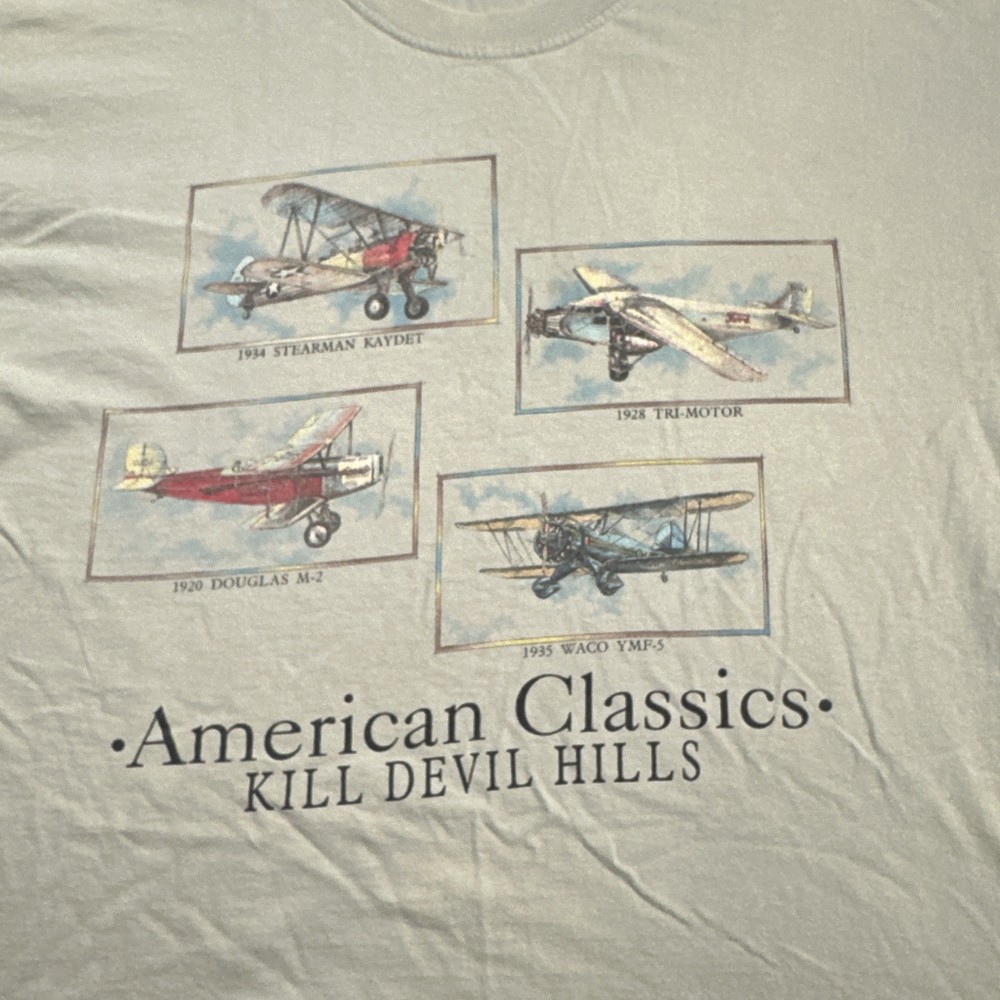 Vintage American Classics Planes Kill Devil Hills T-Shirt Size: LARGE Color: Pistachio HIGHWIND tag Made in USA 23” x 29” Has some discoloration and pinholes shown in pics....