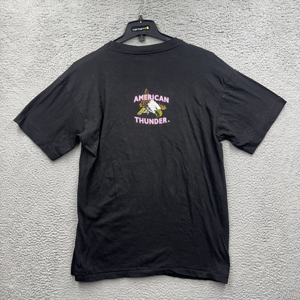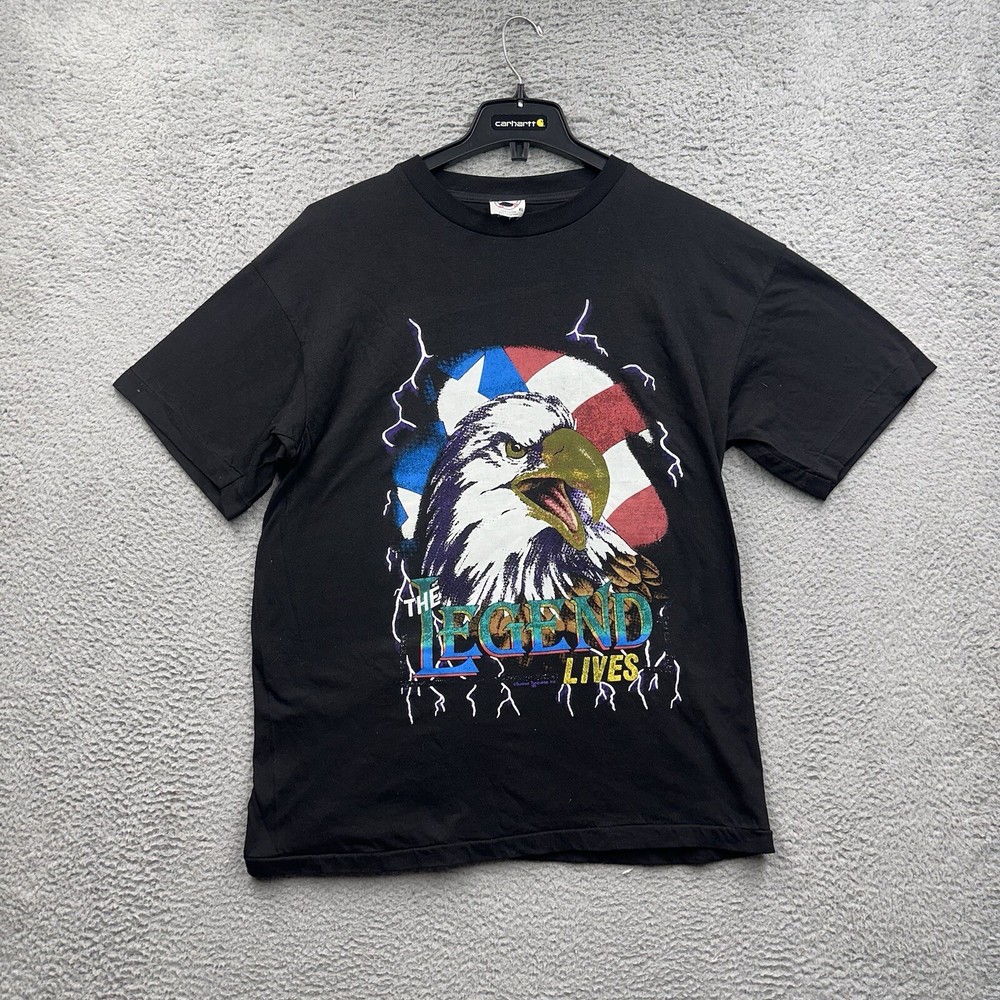 We Accept All Returns On Any Orders. All Flaws, Damage, Fading Is Shown In The Images Above Along With The Measurements. (Please Compare To Your Favorite Garment For A Correct Fit) We Do Bulk Shipping For Orders On Multiple Items 8.99 On The First Item 5.99 On Any Additional. We Are Open To Any Reasonable Offers And Are Here To Answer ANY Questions. Please Shop With Confidence We Look Forward To Your Offers/Messages. Thank You For The Time Spent Reading This. This American Vintage men's t-shirt is a must-have for any fan of Kanye West's Thunderwear collection. The shirt features a unique graphic print with an eagle and lighting bolts, perfect for those who love the USA and all things 90s. Made from comfortable and lightweight cotton material, this shirt is easy to care for and can be machine washed. The shirt has a regular fit with a round neckline and short sleeves, making it a great choice for any season. It also features an embroidered logo on the front and is double-sided, adding to its overall value. Don't miss out on this rare piece from the 1990s that is sure to turn heads.