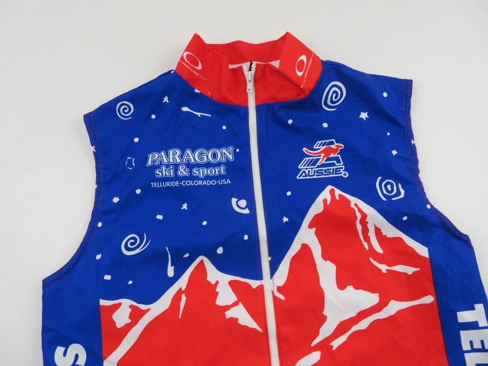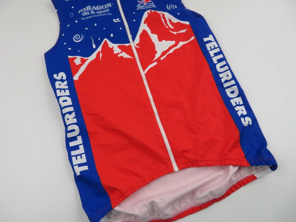 Up for sale is a very nice made in USA Aussie ripstop wind shelled vest. As summer approaches its time to grab some new jerseys to hit the road or trial. This jersey has tons of awesome features including comfy polyester, full zip front, and wind water resistant shell. Show this off on race day or your next group ride to turn heads. Comes professionally washed, ready to wear and ships within 24 hours! Model is 5' 8" 140 pounds medium build and the jersey fits perfect on the model. Measurements: Tagged small may fit more like a medium, confirm fit below Pit to pit across 19 inches Top to bottom in front 25 inches Top to bottom in back 28 inches Excellent mint condition with no rips, holes or stains and looks barely worn. Please check out my store & continue shopping!