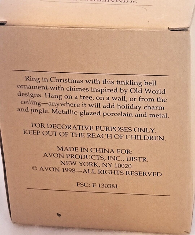 Add a touch of festive cheer to your home with the Vintage Avon Christmas Porcelain Shimmering Bell Santa Wind Chime from 1998. Crafted with care, this charming piece features a Santa Claus design, complete with a string of six porcelain bells that will jingle delightfully in the wind. The multi-color scheme brings the holiday spirit to life, and the contemporary style ensures it hangs beautifully in any space. Whether it's for your own collection or as a special holiday decoration, this Avon wind chime is a delightful nod to Christmas past. * PLEASE SEE PICS FOR DETAILS * PLEASE ASK FOR MEASUREMENTS OR ANY OTHER QUESTIONS CONCERNING THE ITEM *PRIOR* TO PURCHASING We strive to document any flaws or damages and notate them in the pictures and description We will combine shipping on multiple orders if all items fit in 1 packaging safely Items that will fit safely in a poly bag will shipped in one We recycle packaging material in order to keep shipping cost down Fragile items require additional packing for safe arrival Any item that includes non-removable batteries or liquid must be shipped ground shipping ONLY Any item that has removable batteries will NOT include batteries Colors may slightly vary due to lighting and/or computer settings Please message for questions about an item prior to purchasing We encourage our customers to shop our other items for great deals! Please contact us prior to posting less than 5 Star feedback We take pride in offering quality products, packaging, fast shipping, and customer service. Please understand that we are HUMAN. There is video on file of ALL items being packed and shipped. International Buyers Not using GPS shipping Please note: Import duties, taxes, and custom charges are not included in the item price. These charges are the buyer's responsibility. Please check with you country's customs office to determine what these additional costs will be prior to bidding or buying *Please note that our handling time is 5 business days, In most cases we are able to ship out Next business day! Happy Shopping and Have a wonderful day!! Any stands, bookends, or easels used in photos are not included | I reserve the right to upgrade to a faster USPS service or to use FedEx or UPS services at my discretion and at no additional cost to you when I believe it will provide a better experience ****Please remember that the shipping is a service provided by a company and I have absolutely NO control over pricing and delivery times.**** *I appreciate your business, please take time to look at the other items in my store as I add new items daily!!