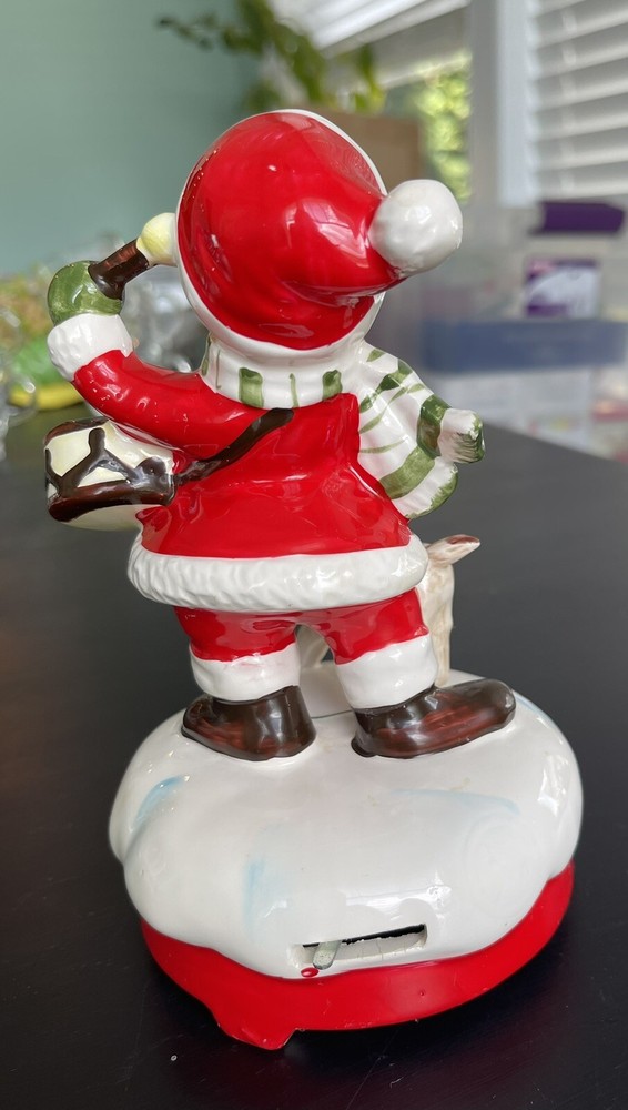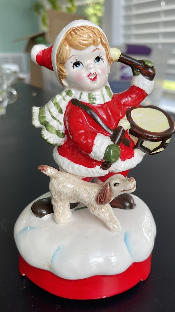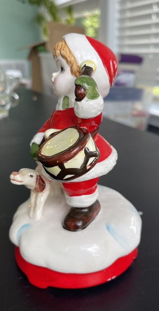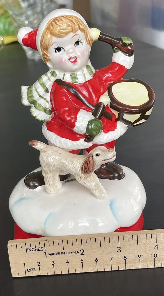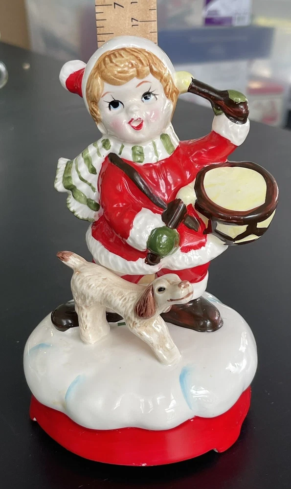 Vintage (1970s) wind up Christmas figure with B&A logo on base. Features boy with drum wearing a Santa outfit with scarf and his dog. Base has on/off switch lever built in and wind mechanism works and plays “Little Drummer Boy” I ship quickly from a non smoking house and can combine shipping to save costs so please look at other items for sale. Thanks!