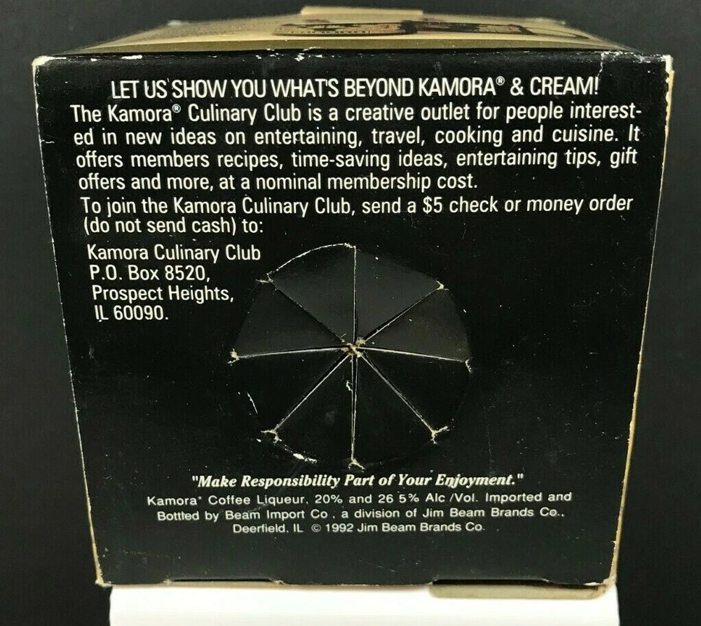 The Vintage Beam Import Kamora Coffee Liqueur Designer Coffee Mug in Original Box is New Old Stock. Great Vintage Kamora Coffee Liqueur Designer Piece! Awesome Addition to Your Vintage Coffee Mug Collection! Beam Import Co. is a Division of Jim Beam Brands Co.! Vintage Beam Import Kamora Coffee Liqueur Designer Coffee Mug Measurement: 3.75"h x 3.25"w You receive the Vintage Beam Import Kamora Coffee Liqueur Designer Coffee Mug in Original Box in the photos above. Please be sure to check out the stores other items! New items listed on a daily basis! If you have any questions please feel free to email any time. Items will be shipped the next business day after payment has been made. Thanks for Shopping at Yobles & Please Come Back Soon! S C-30 Comes from a smoke-free and pet-free home .