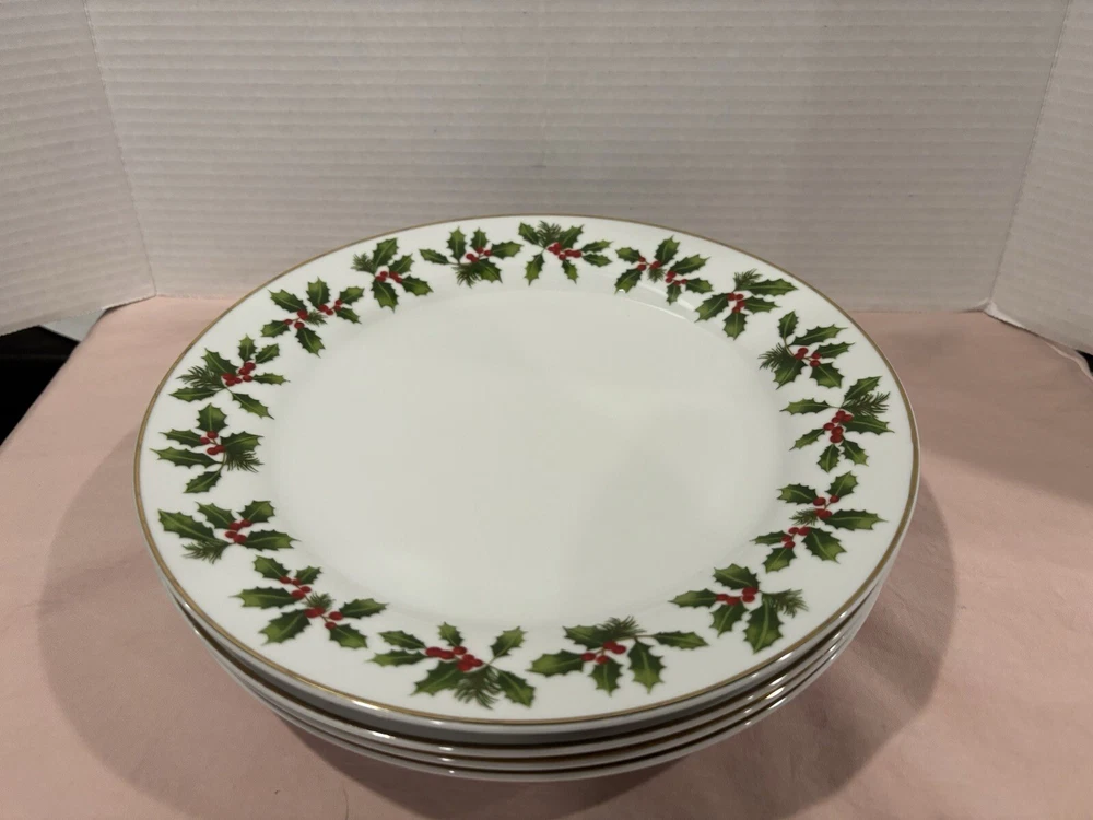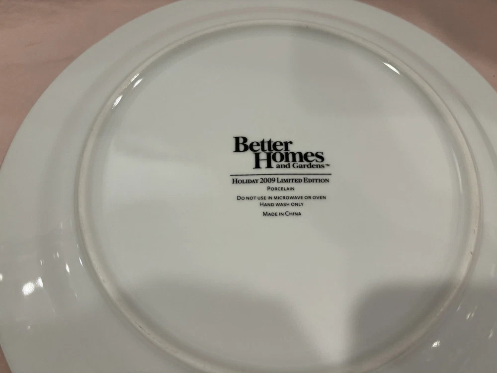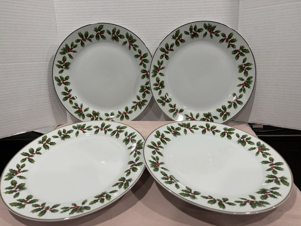 These are vintage Better Homes & Gardens Christmas plates featuring a holly pattern. The set includes 4 dinner plates. Made of porcelain and ceramic, these original plates were manufactured in the 21st century using art pottery production style. They are from the years 2000-2009 and were made in China. The plates have a printed backstamp and are not handmade.