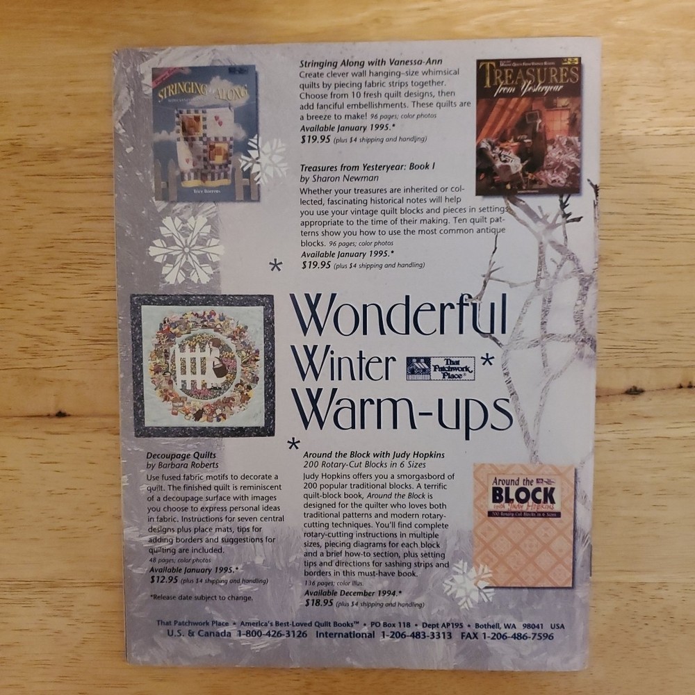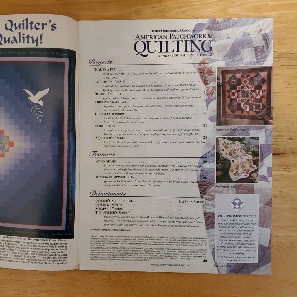 The Better Homes and Gardens American Patchwork & Quilting Magazine February 1995 issue provides a wealth of inspiration and guidance for quilt enthusiasts. Featuring a mix of projects, instructions, and pattern templates, this bimonthly publication covers a range of topics within the home and garden, hobbies and crafts, and quilting genres. With a focus on art, craft books, sewing, and quilting, this issue from the United States offers readers a glimpse into the world of quilting through projects and tutorials. Whether you are a beginner or an experienced quilter, this magazine provides valuable insights and creative ideas to enhance your quilting journey. Combined Shipping Discount Policy: $3 shipping on each additional item you add to your order. Shipping Description: Items with tracking number available. Monday - Friday 8am to 5pm and Saturday 8am to 12pm. Shipping varies due to USPS holidays. 30 Day Return Policy: We accept any item returned within 30 days of the original purchase date for a full cash refund, minus the original shipping cost. The buyer is responsible for all return shipping costs. All returns must be received in the same condition as shipped before the refund is initiated. If the returned item is not received in the same condition as shipped, a partial or no refund will be issued, depending on the condition of the returned item.