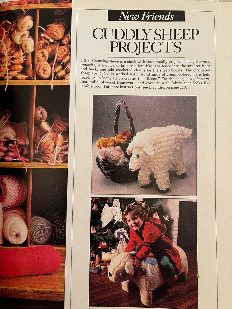 The only flaw is inside pages are yellowing ( I think; could be the actual color back in the Eighties but not sure) Pictures, binding, writing is perfect Vintage Better Homes And Gardens Creative Ideas Holiday Crafts Magazine August 1983. Table of Contents Special Features Do's and don'ts of dyeing Basic embroidery stitches Basic needlepoint stitches Basic crochet stitches Basic knitting stitches How to enlarge and transfer a design Handmade Gifts - Best-ever gifts for everyone on your list Ceramic Greetings - Ceramic gifts to make yourself New Friends - More members of our cover family, plus sheep projects Adventures in Crafts - Step-by-step how-to fro bargello, applique, basketry, and printing Scrap Yarn Sweaters - Family-style warmers for a fall weekend A Crafty Trio - Lovable dolls to stitch and stuff Quick-As-A-Wink Trims - Cards, wraps and ornaments to make in a flash Jumping Jack - A jovial fellow to trace, paint, and assemble Jewelry - Neckwear for kids plus adult creations Cozy Covers - A quilt and bedspread made for cuddling Prairie Rug - Classic folk art creation updated in felt Gifts For Special Kids - Learning toys for handicapped children Collectors' Dolls - Heirloom ladies to make and dress Holiday Workshop - A collection of projects to brighten your holiday home Shopping Buying guide Information worth writing for How to order material from the Magazine Shopping Editor's Choice