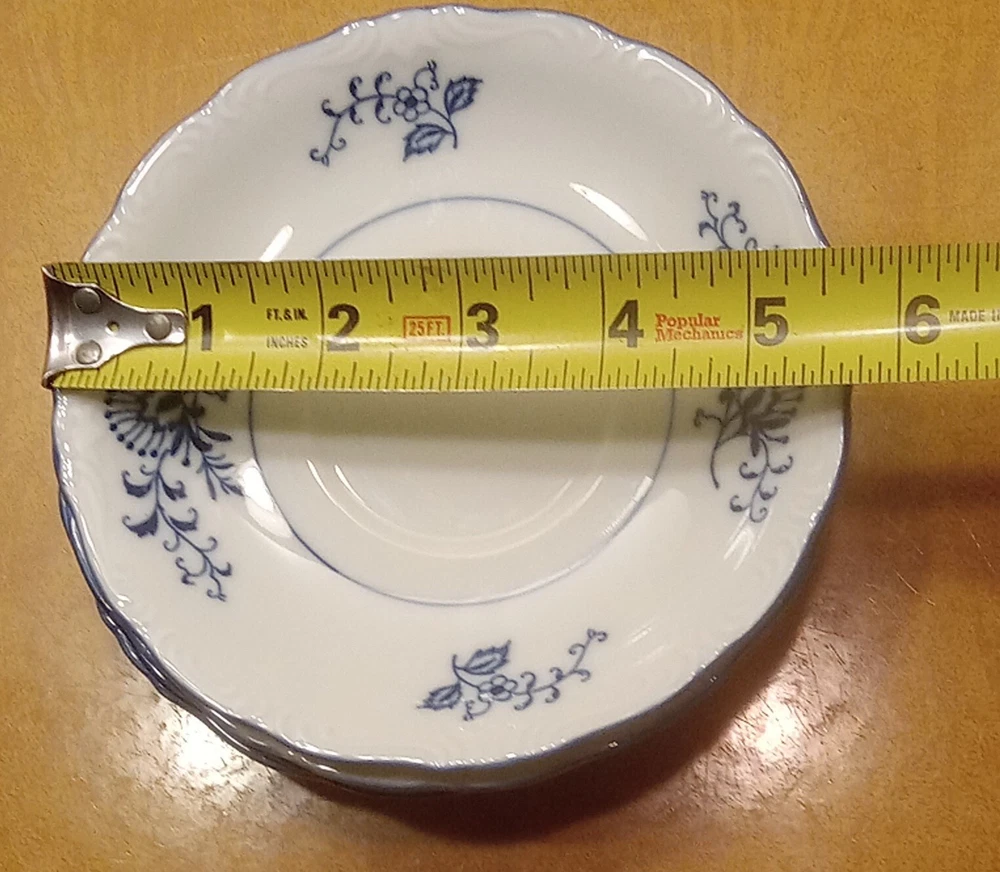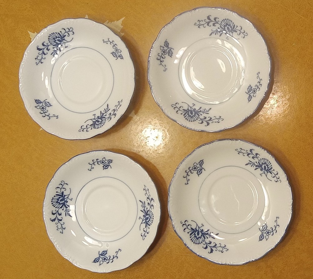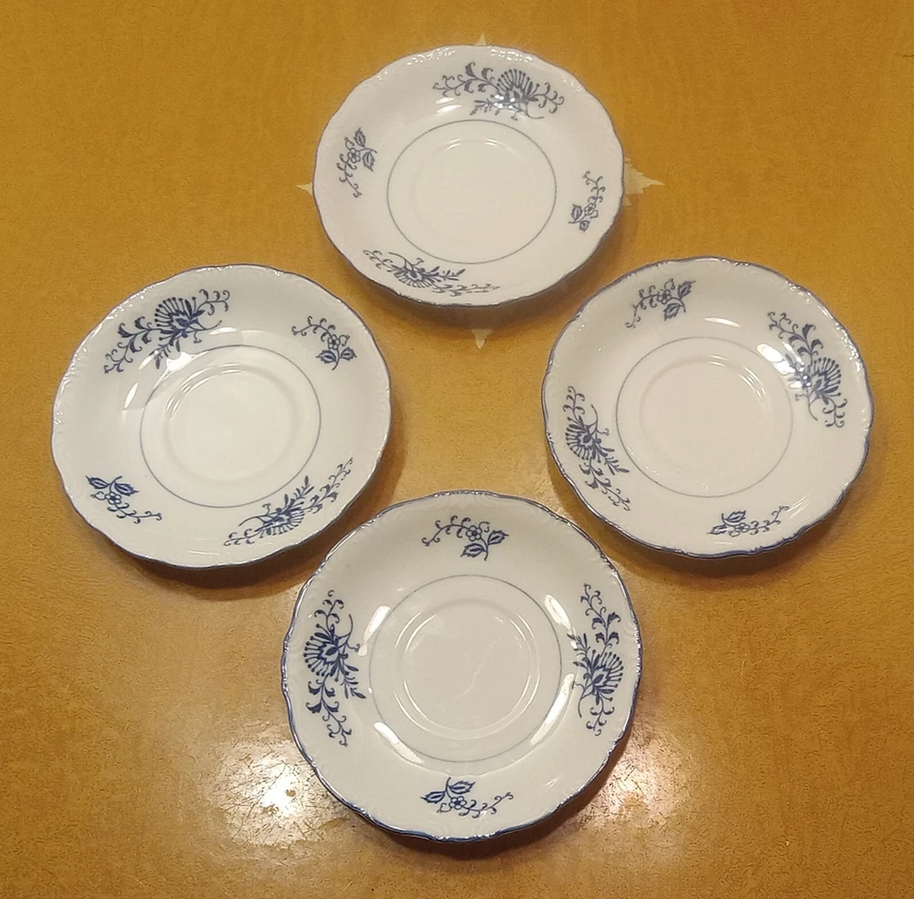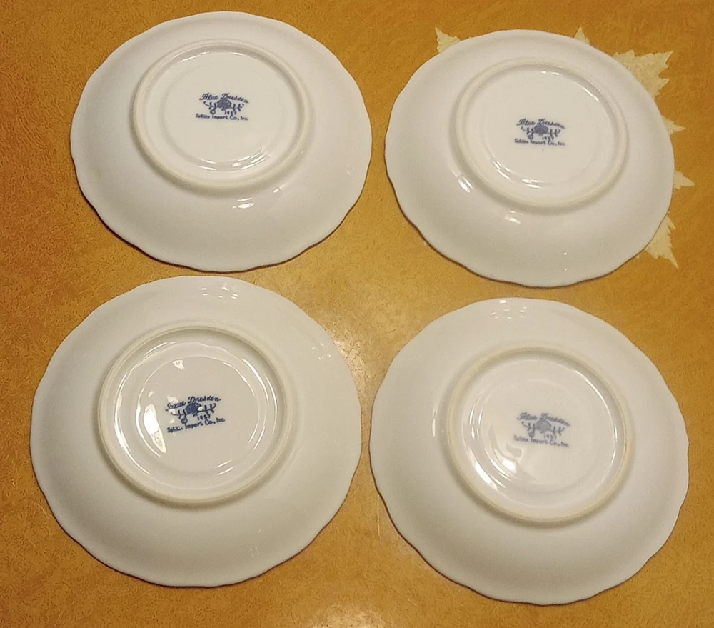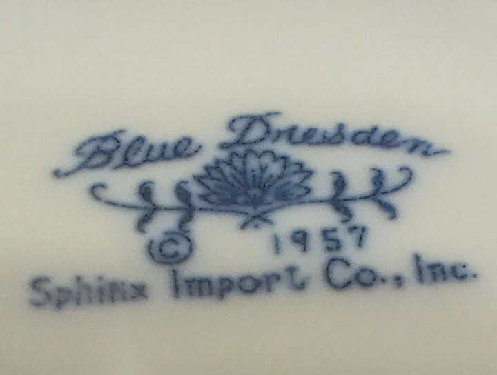 Add a touch of vintage charm to your gallery wall or china rack display with this set of 4 Blue Dresden saucers. Made of delicate porcelain, these saucers feature a beautiful floral theme and a retro style, perfect for all occasions. Manufactured in 1957 by Sphinx Import Co., these saucers have a printed backstamp. The saucers come in a lovely combination of blue and white, making them a great addition to any collection or as standalone decorative pieces. Each saucer measures 5.75Inches, and are a must-have for porcelain or blue and white china enthusiasts. In overall good used condition, without chips or cracks, please see pictures and zoom in for a closer look.