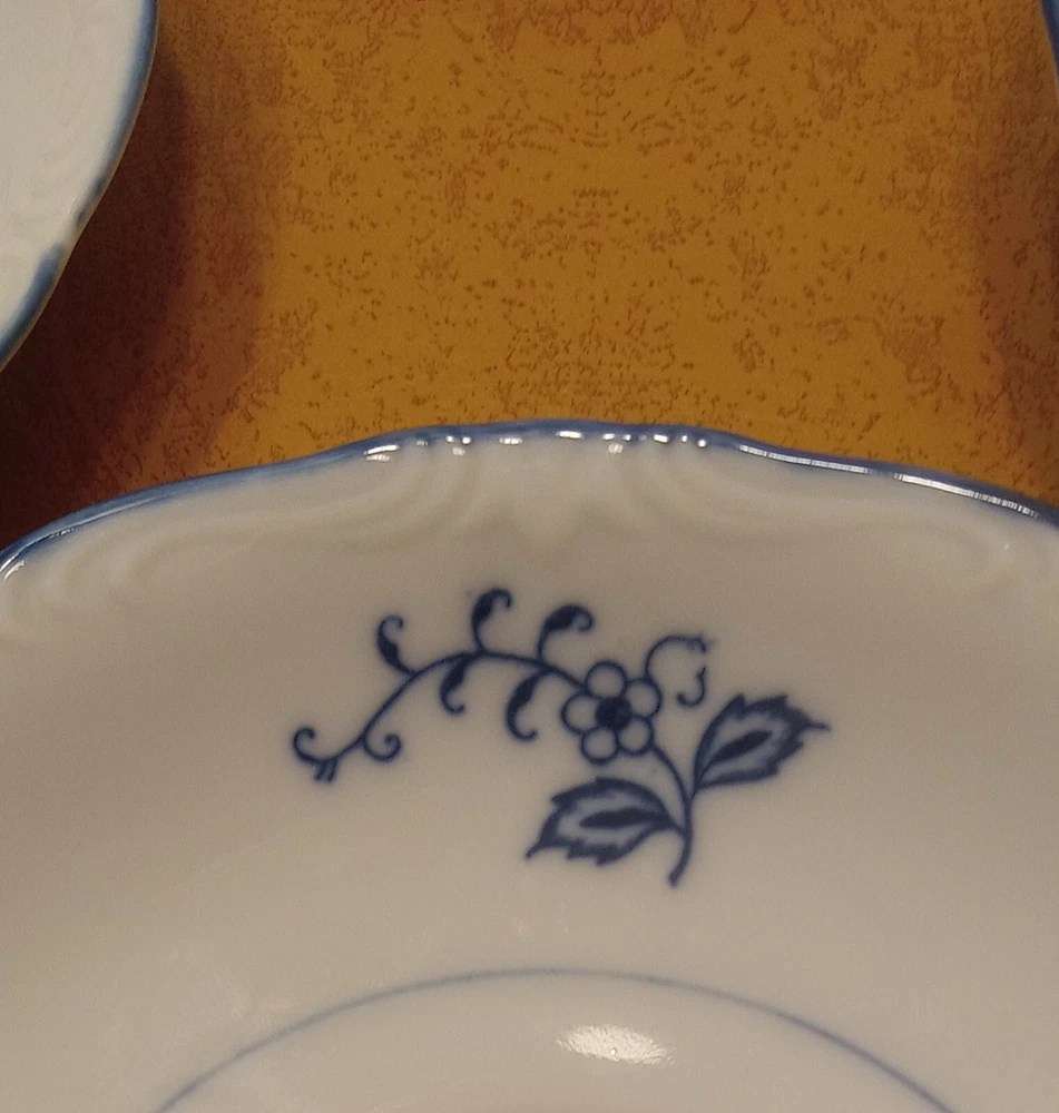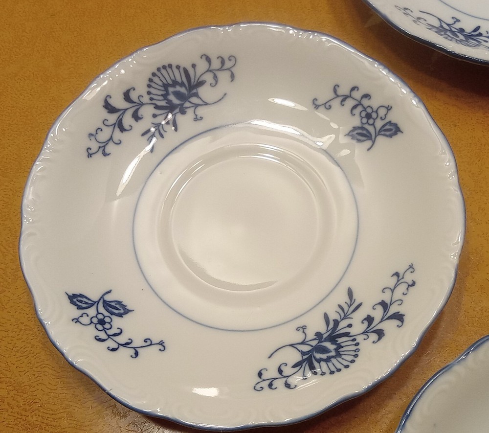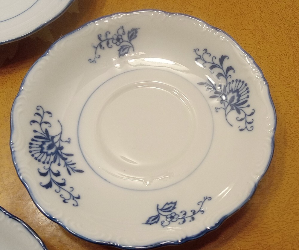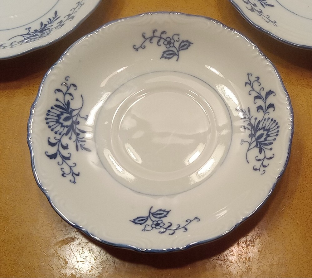 Add a touch of vintage charm to your gallery wall or china rack display with this set of 4 Blue Dresden saucers. Made of delicate porcelain, these saucers feature a beautiful floral theme and a retro style, perfect for all occasions. Manufactured in 1957 by Sphinx Import Co., these saucers have a printed backstamp. The saucers come in a lovely combination of blue and white, making them a great addition to any collection or as standalone decorative pieces. Each saucer measures 5.75Inches, and are a must-have for porcelain or blue and white china enthusiasts. In overall good used condition, without chips or cracks, please see pictures and zoom in for a closer look.