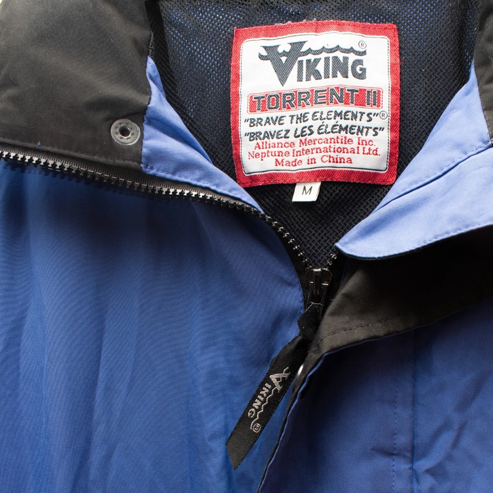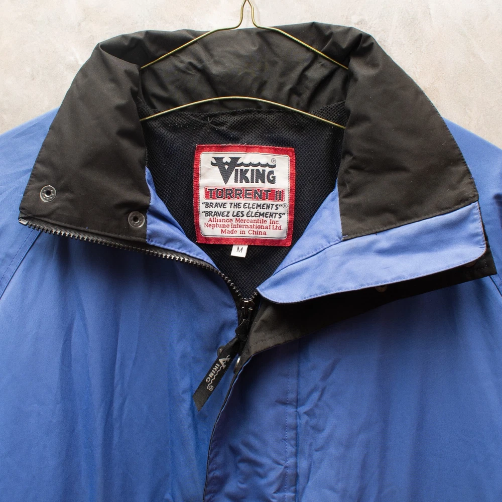 Vintage Blue and Black Viking Wind Breaker w/ Zipper and snaps. Size M. Length: 29.75 Pit to Pit: 22.5in Sleeve Length: 30in