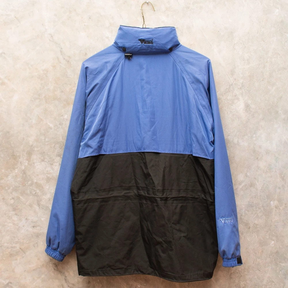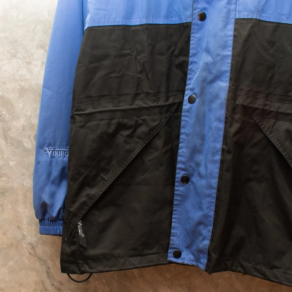 Vintage Blue and Black Viking Wind Breaker w/ Zipper and snaps. Size M. Length: 29.75 Pit to Pit: 22.5in Sleeve Length: 30in...