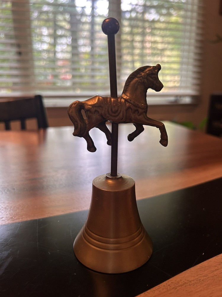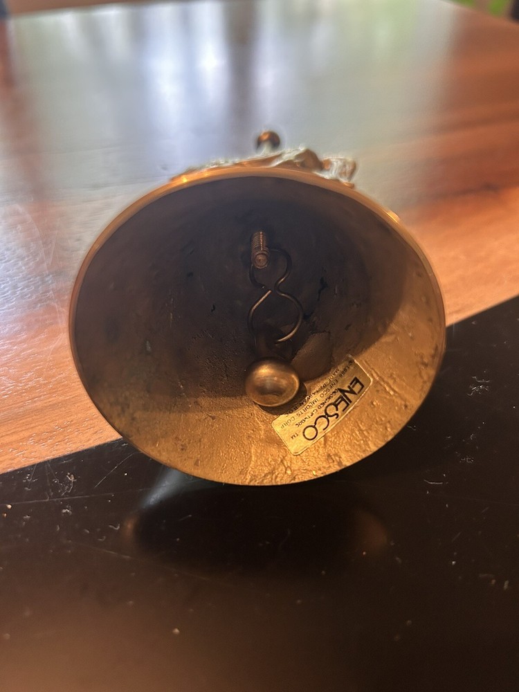 Add a touch of vintage charm to your collection with this beautiful brass bell featuring a horse carousel design. Made by Enesco Design in 1986, this small bell measures 6.5 inches in length and height, and 2.5 inches in width. The metallic finish and brass material give it a unique and original look that will complement any decor. Perfect for all occasions, this one-of-a-kind bell is a must-have for collectors of decorative items. The horse carousel theme adds a touch of whimsy and nostalgia to any room. Get it now and add a touch of Enesco Design to your collection!