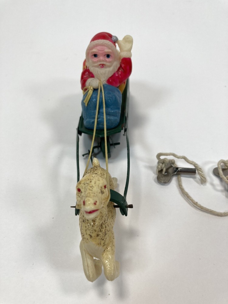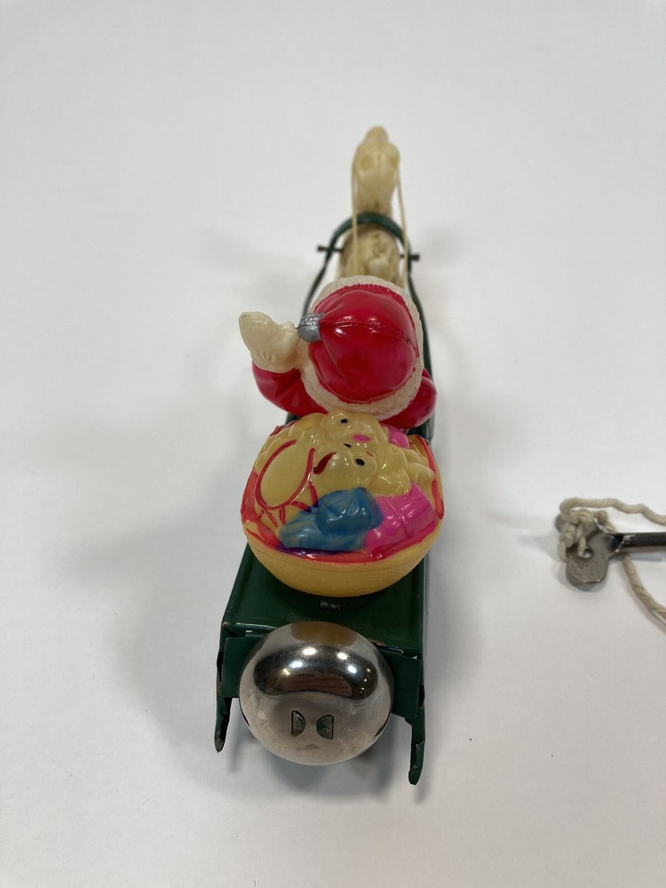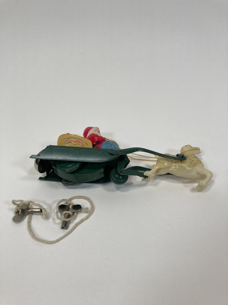 This vintage Christmas figurine features Santa Claus and his reindeer in a sleigh, powered by wind-up movement. Made of celluloid /Steel material, this multicolor figurine is a mid-20th century piece from Occupied Japan. Measuring 8.50 inches in length, it is a perfect addition to any seasonal or novelty collection. This piece is sure to bring joy to any Christmas occasion. *Winds & locks, But no movement*. Come with two key, Reindeer missing antlers. (See Pictures)