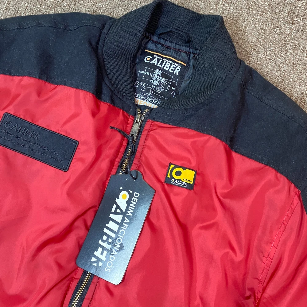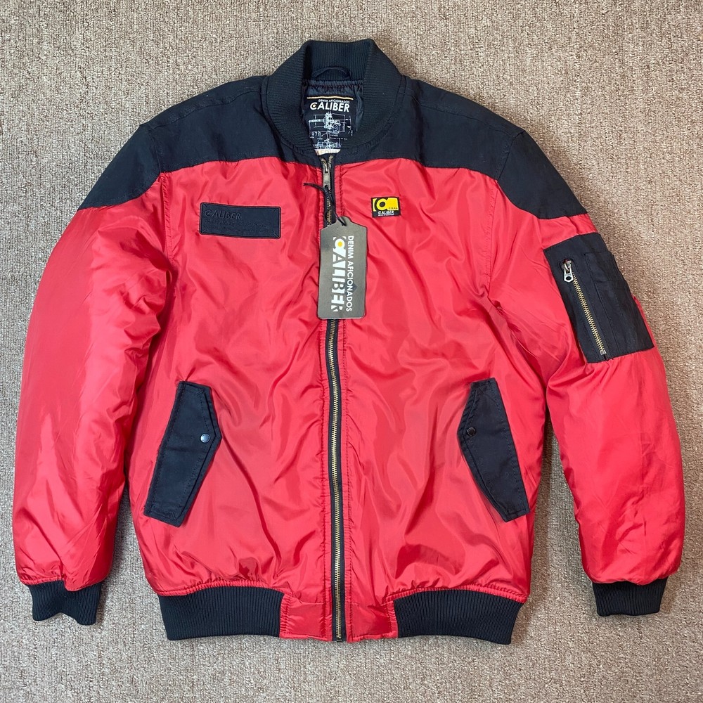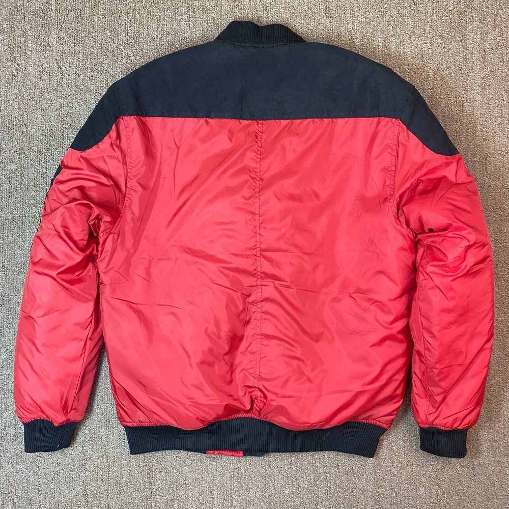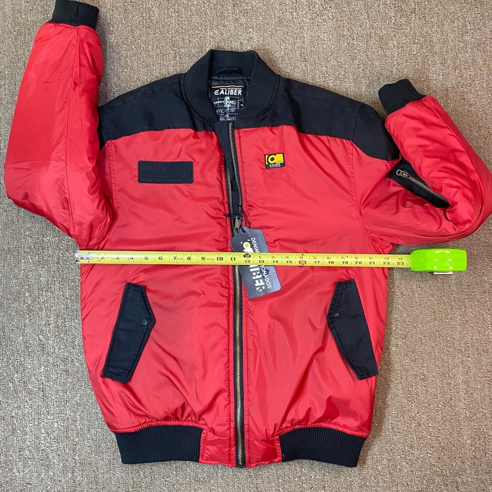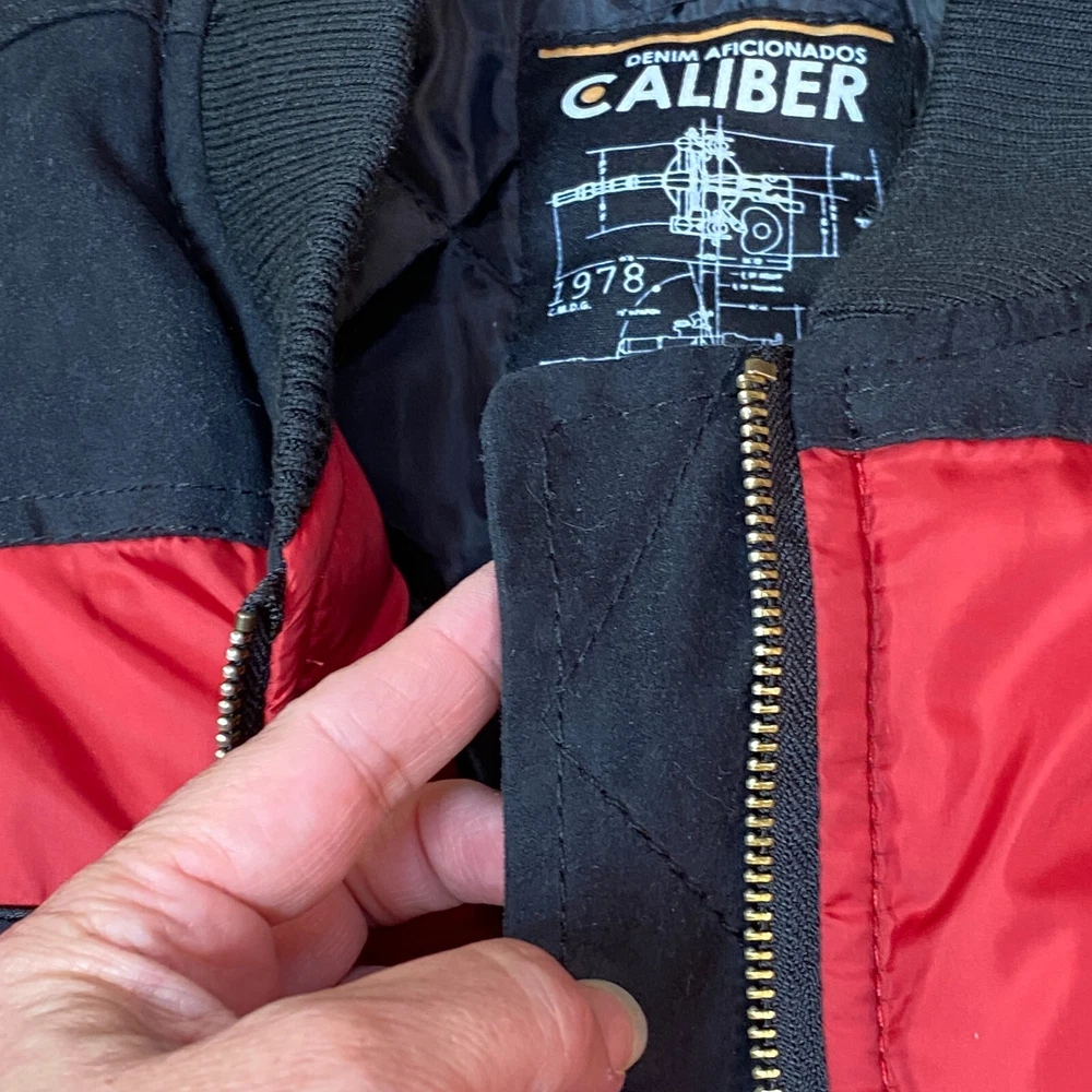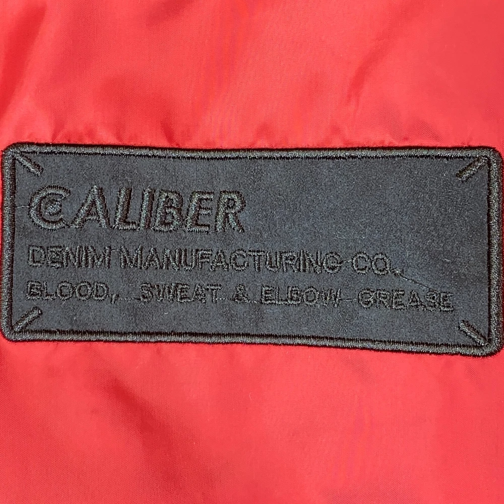 This vintage Caliber Denim MFG Co. bomber jacket is a must-have for any fashion-forward man. The red softshell and black faux suede color block scheme, accented with logo patches and zipper closure, makes it perfect for parties or casual wear. Made with polyester outer shell material and lined with quilted polyester, this jacket is wind-resistant, water-resistant, and insulated for all seasons. The elastic waist and padded design ensure a comfortable fit, while the quick-dry and soft shell features make it perfect for winter, fall, and spring. With zipped pockets and a band collar, this jacket is both practical and stylish. Ideal for those who love the 80s retro style, colorful themes, or motorcycle and ski enthusiasts. Clean, Smoke free home. Ships within 24 hours of payment. Many thanks to great customers like you that support this small business! Cheers!!!