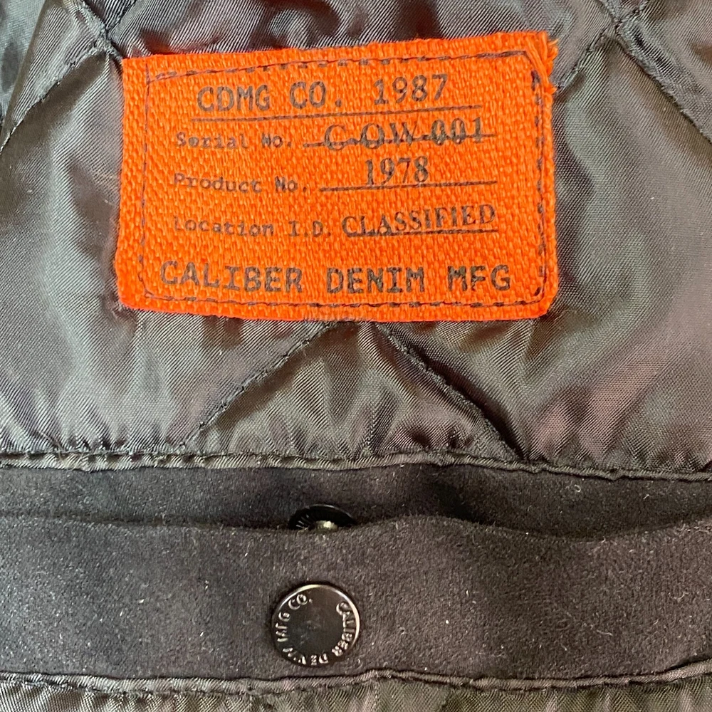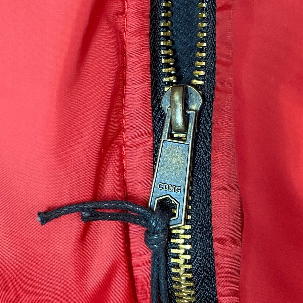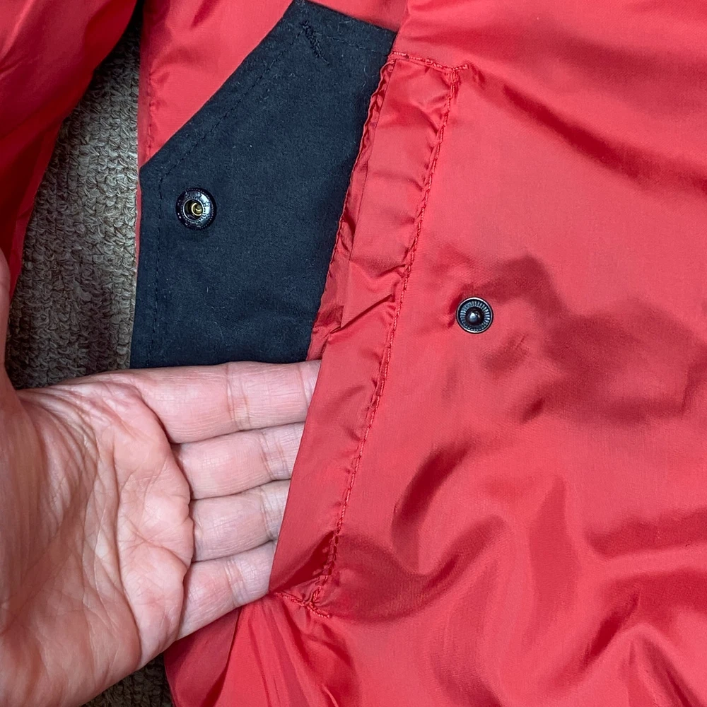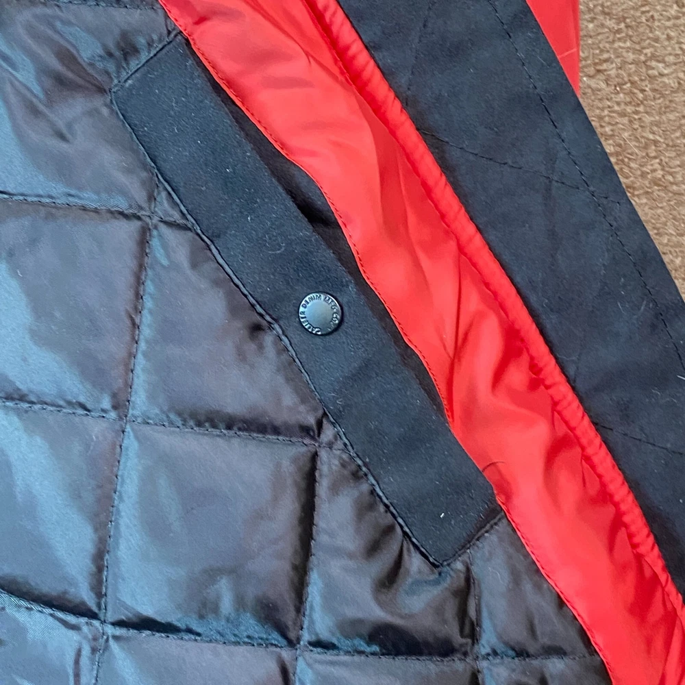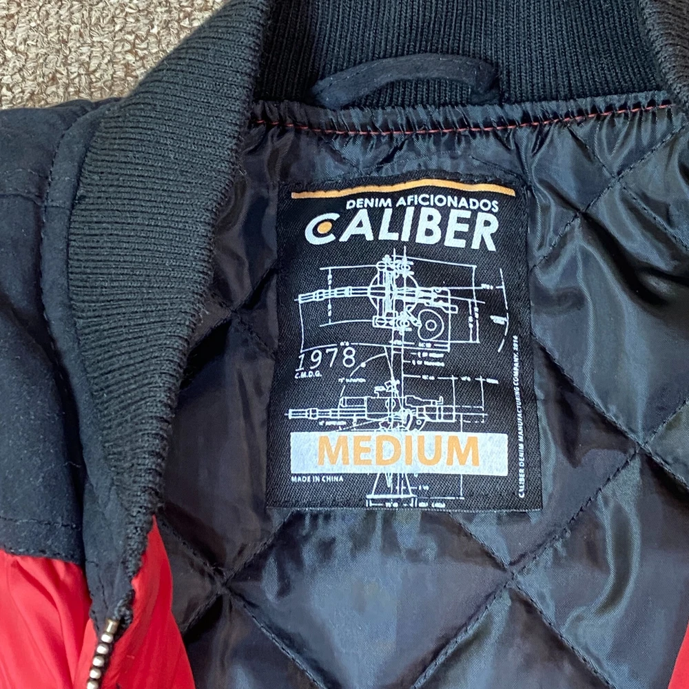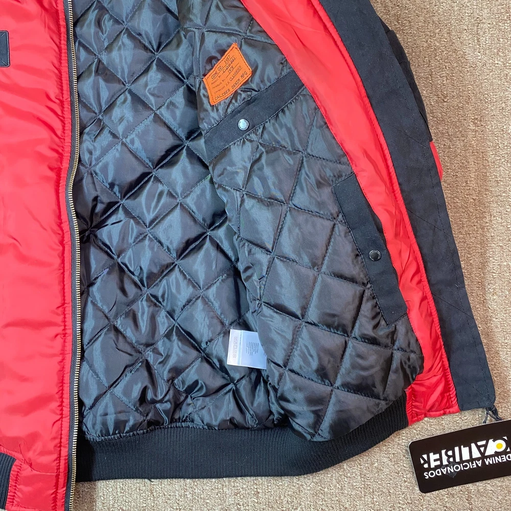 This vintage Caliber Denim MFG Co. bomber jacket is a must-have for any fashion-forward man. The red softshell and black faux suede color block scheme, accented with logo patches and zipper closure, makes it perfect for parties or casual wear. Made with polyester outer shell material and lined with quilted polyester, this jacket is wind-resistant, water-resistant, and insulated for all seasons. The elastic waist and padded design ensure a comfortable fit, while the quick-dry and soft shell features make it perfect for winter, fall, and spring. With zipped pockets and a band collar, this jacket is both practical and stylish. Ideal for those who love the 80s retro style, colorful themes, or motorcycle and ski enthusiasts. Clean, Smoke free home. Ships within 24 hours of payment. Many thanks to great customers like you that support this small business! Cheers!!!
