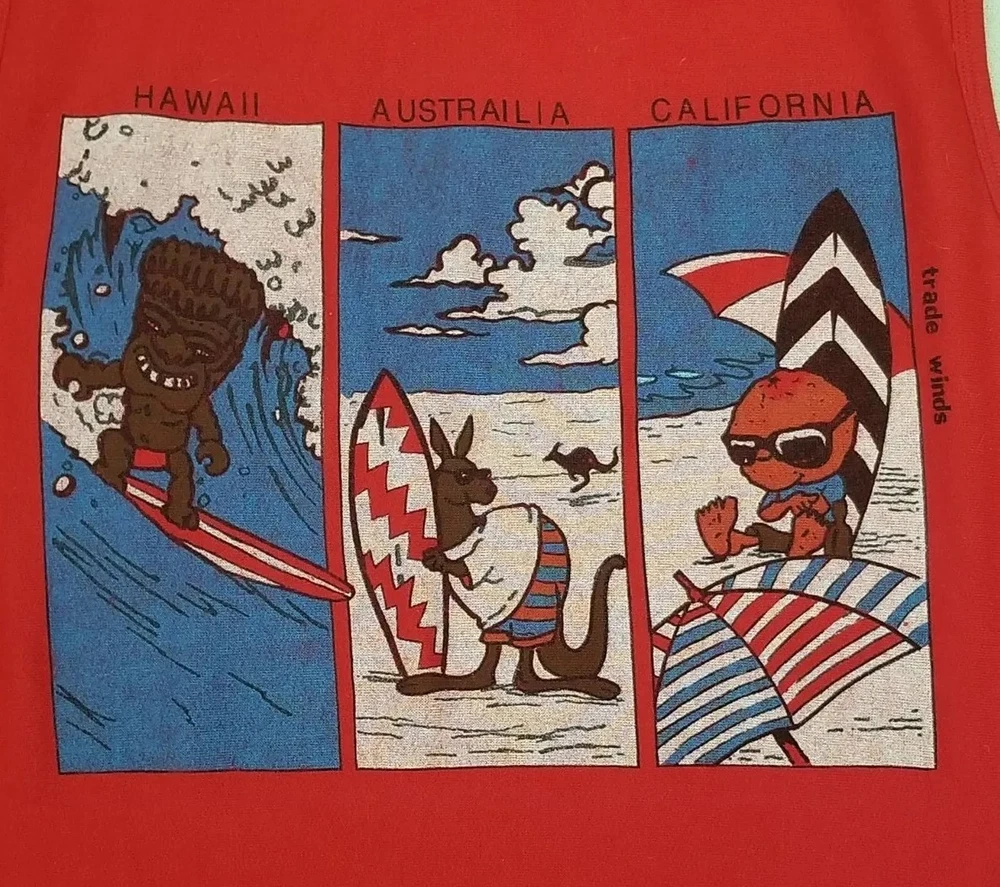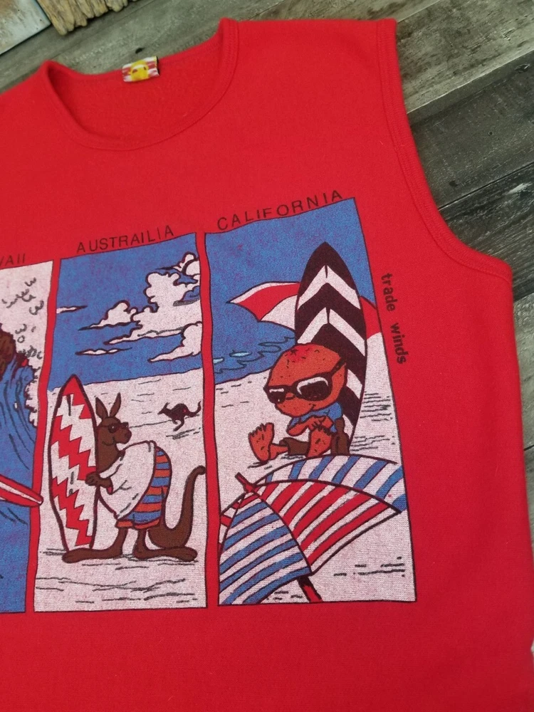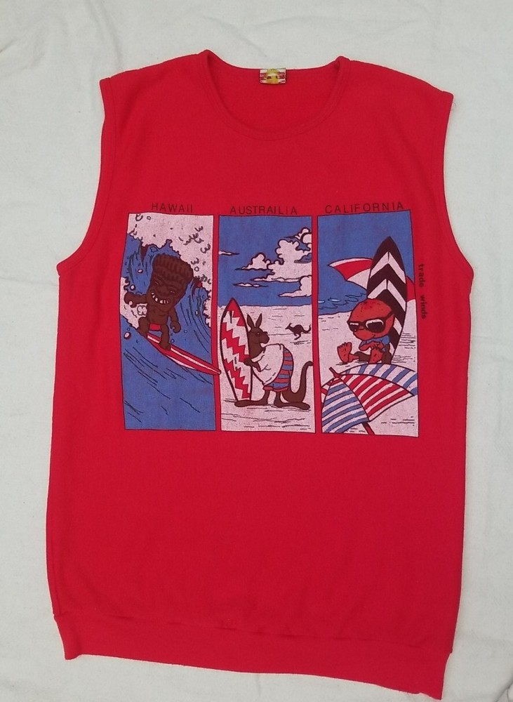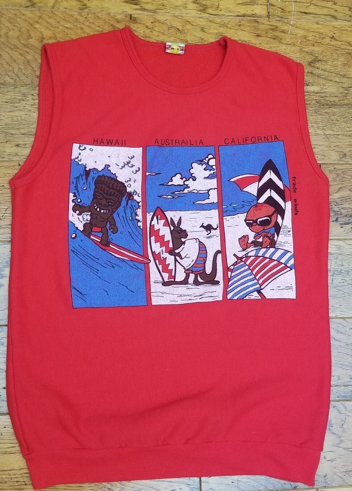VTG Trade Winds Hawaii California Australia Surf Beach Red Sleeveless Shirt. Great looking truly vintage Trade Winds Sleeveless Red Surf Shirt (Notice Australia is misspelled) Preowned but in overall great condition Made in USA Label Size Large Measures Approximately Length 29 inches Pit to Pit 21 inches