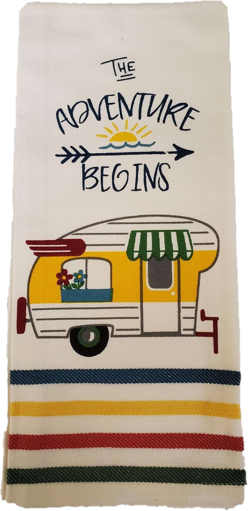 Highlights: Vintage camper coordinating bundle includes 2 tea towels from Kay Dee Designs, 1 set of salt and pepper shakers from Design Imports Get your fill of wanderlust with these exciting camp themed tea towels! These tea towels are perfect for the lodge themed house or cabin, or for those who just love the great outdoors (18 x 28 in) 100% cotton towel sentiment: "Adventure Begins" Loop for displaying, and great for drying dishes and glassware or keeping baked goods warm before serving Earthenware salt and pepper shakers in shape of trailer campers measure approximately 3 x 2 x 2 inch Description: Vintage camper coordinating bundle includes 2 tea towels from Kay Dee Designs, 1 set of salt and pepper shakers from Design Imports. Kay Dee Designs linens bring fun into the kitchen with its unique and creative kitchen linens collections. Their collections include oven mitts, pot holders, towels and more. DII brings you a fresh, innovative line of kitchen products, tabletop items, gifts, and home décor for every season, every holiday, and everyone. Returns: Free 60 Day Returns