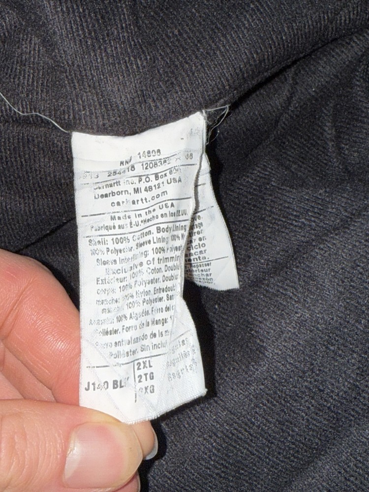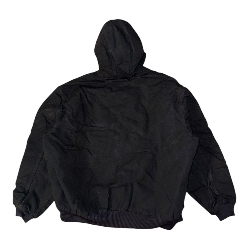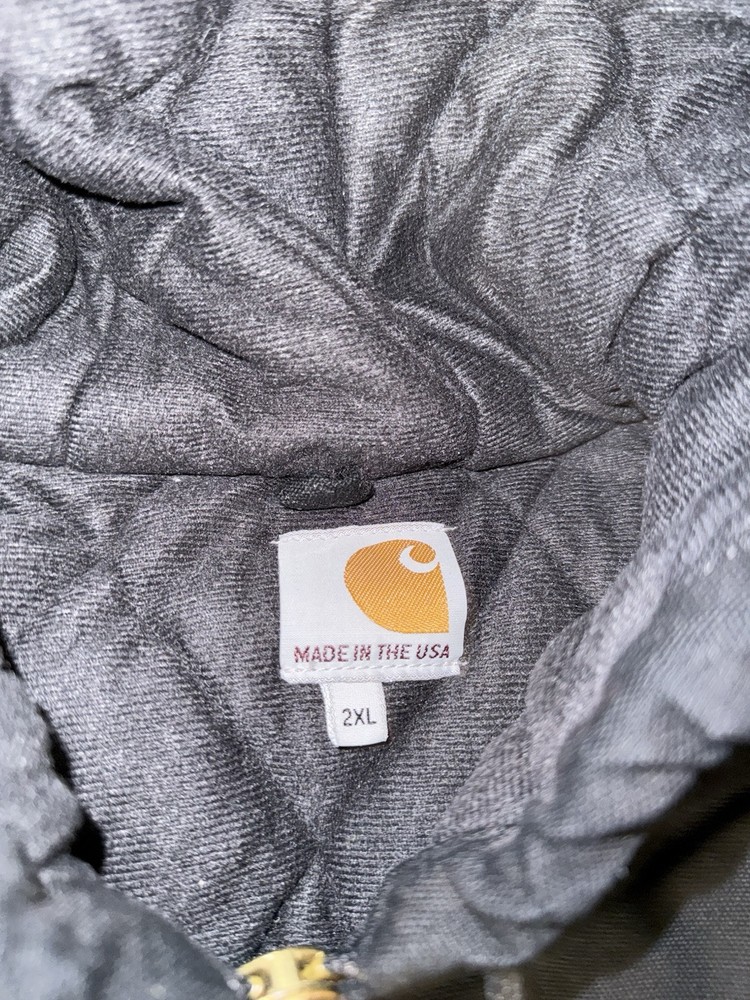 A vintage Carhartt quilted bomber jacket in black, made in the USA, size 2XL. This workwear piece features a cotton outer shell with a polyester lining, full zip closure, hood, and multiple pockets. The jacket is windproof and wind-resistant, suitable for all seasons. With a relaxed fit and classic design, this Carhartt J140 model embodies a hipster, outdoor, and retro theme. Light marking as shown in photo Size is recommended please use measurements