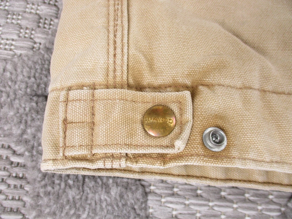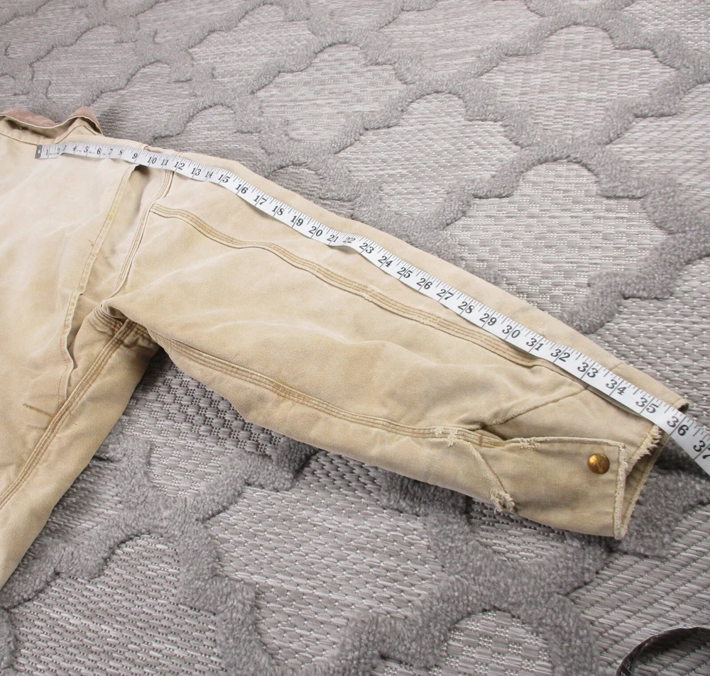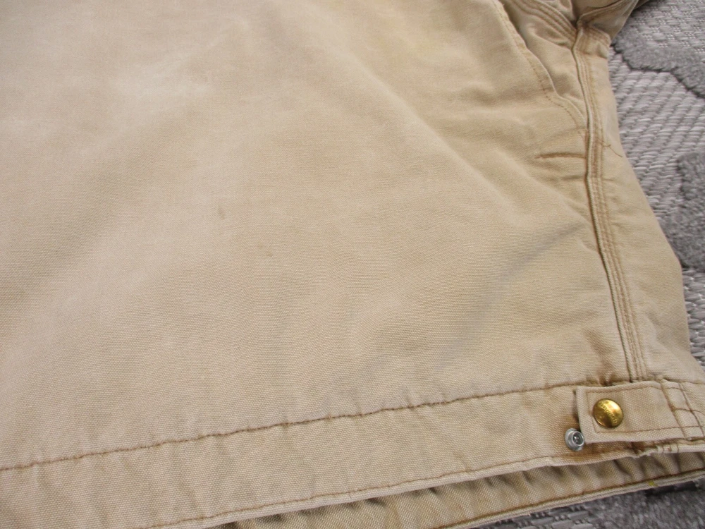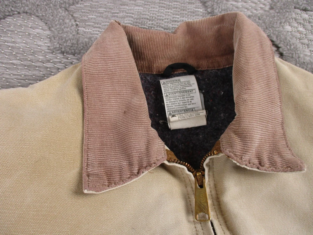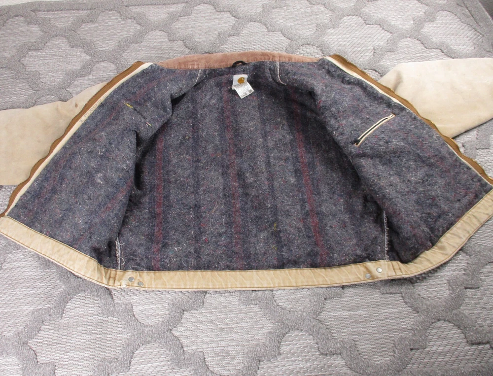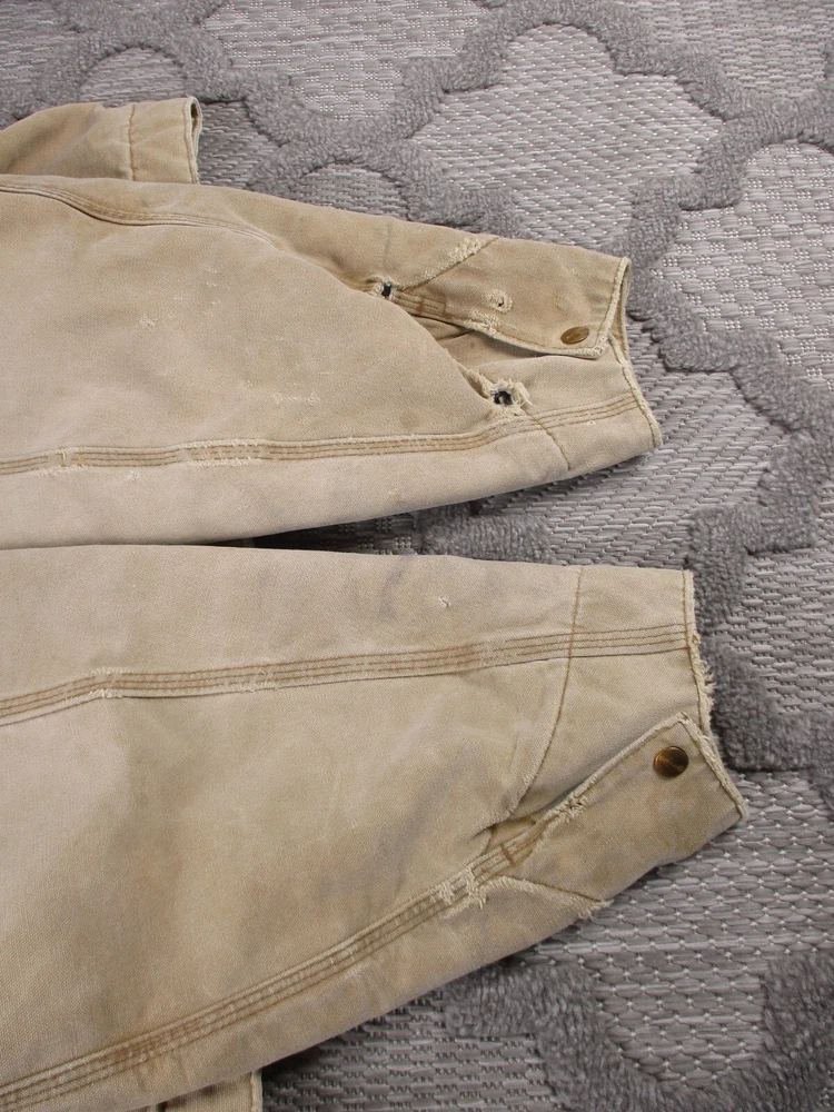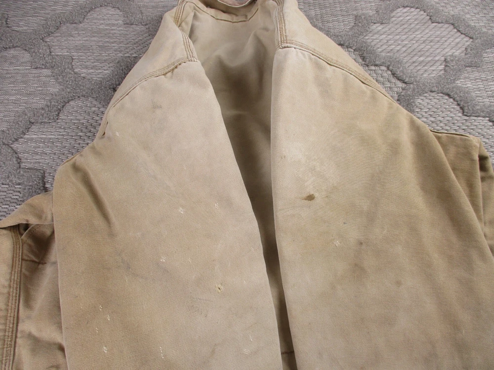 Vintage Carhartt Jacket Mens 52 Beige Detroit Blanket Made In USA Distressed J02 Has some light stains and light surface tears near pockets, some spots on bottom and mid/upper back (photos 8-10). Some spots and surface tears on sleeve, as well as small/moderate holes near wrist area (photos 13-16). Also has former owners names near zipper area on inside as well as some light wear on collar area (last 3 photos). Otherwise, jacket is in good clean condition. Please see photos for details and measurements. Compare measurements to your favorite jacket to ensure proper fit.