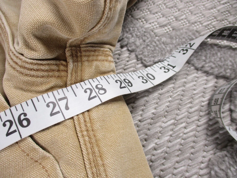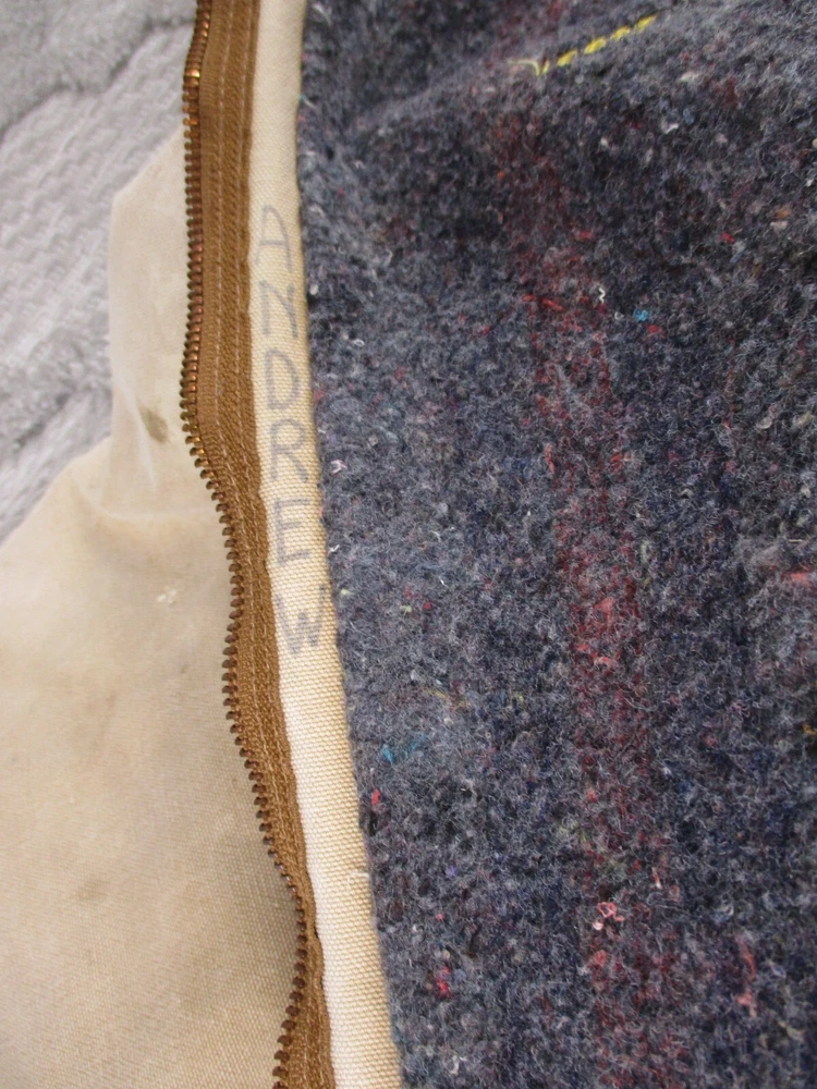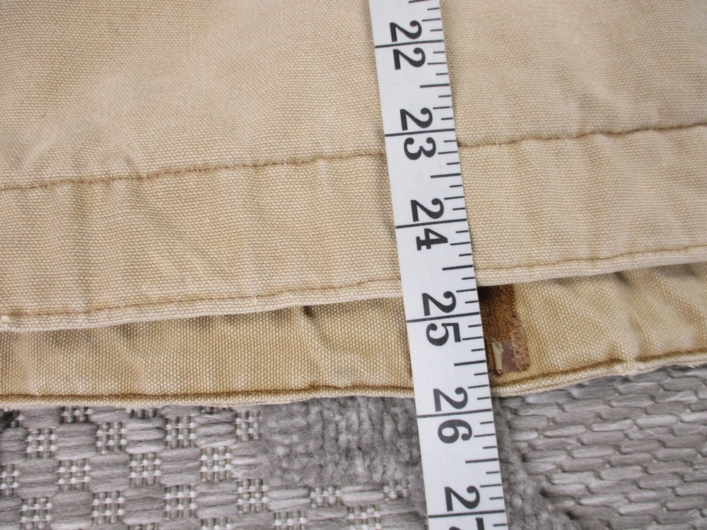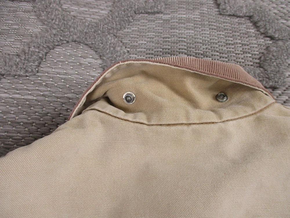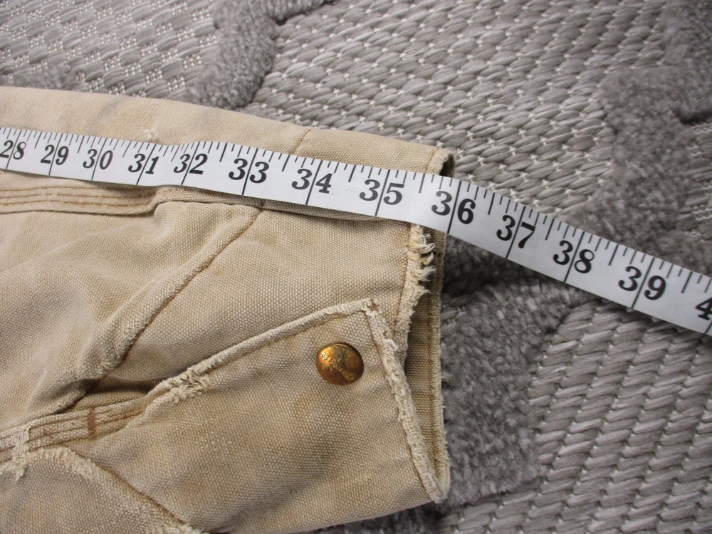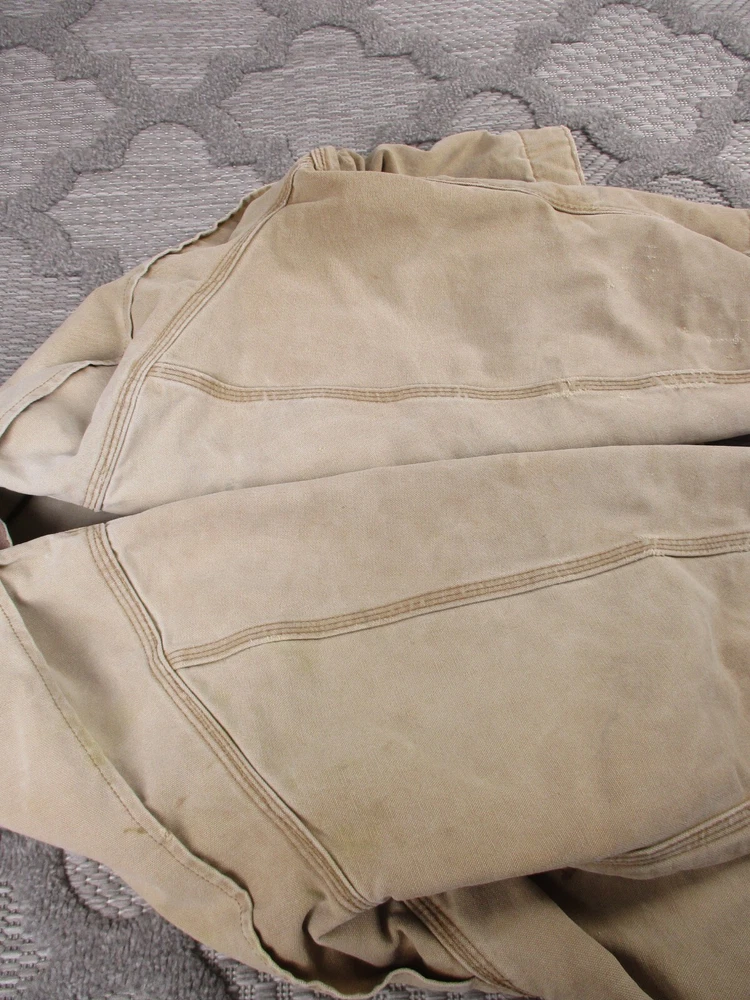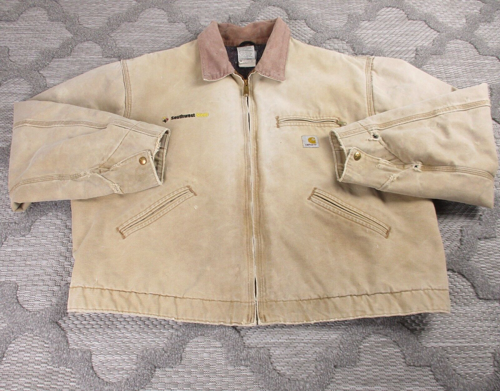 Vintage Carhartt Jacket Mens 52 Beige Detroit Blanket Made In USA Distressed J02 Has some light stains and light surface tears near pockets, some spots on bottom and mid/upper back (photos 8-10). Some spots and surface tears on sleeve, as well as small/moderate holes near wrist area (photos 13-16). Also has former owners names near zipper area on inside as well as some light wear on collar area (last 3 photos). Otherwise, jacket is in good clean condition. Please see photos for details and measurements. Compare measurements to your favorite jacket to ensure proper fit.
