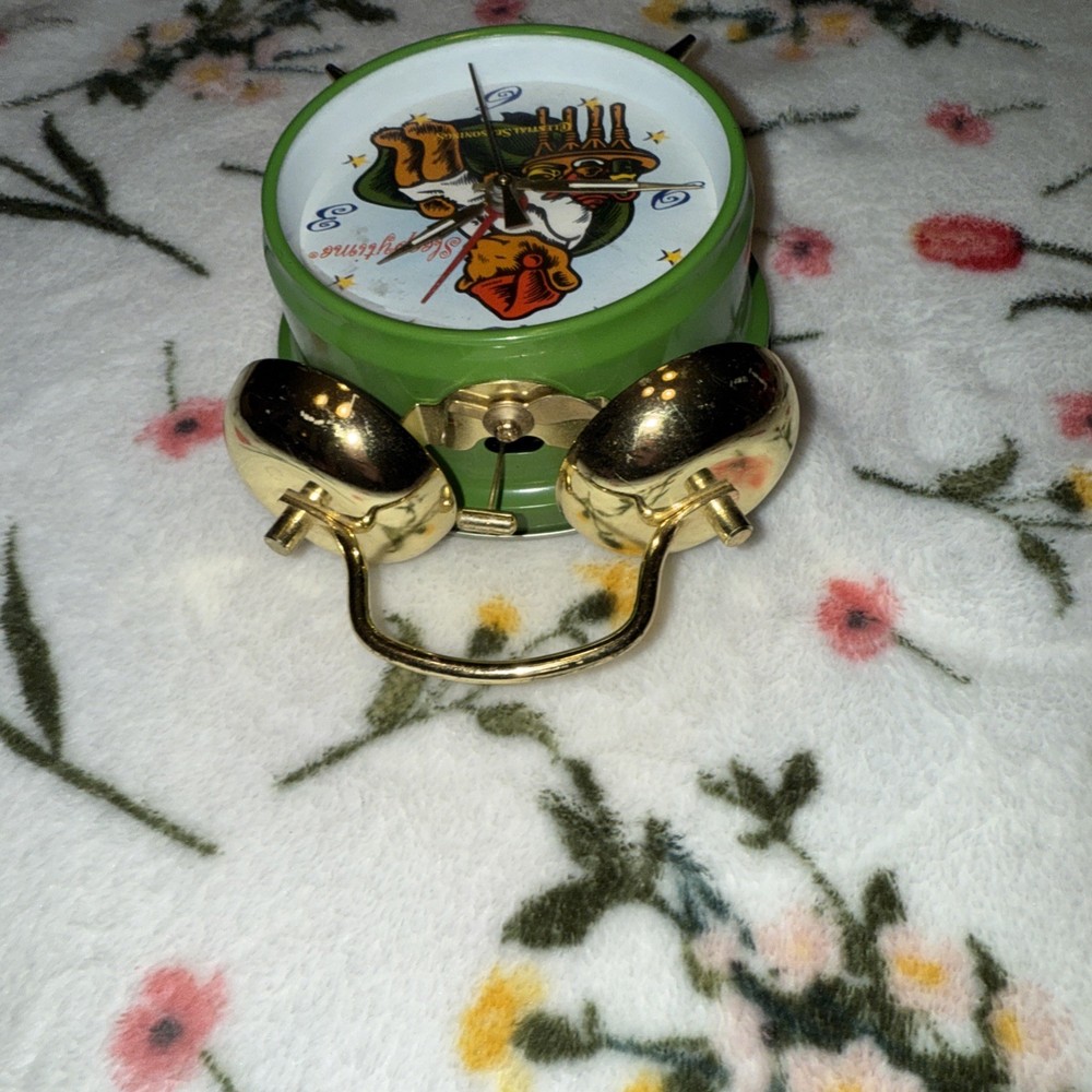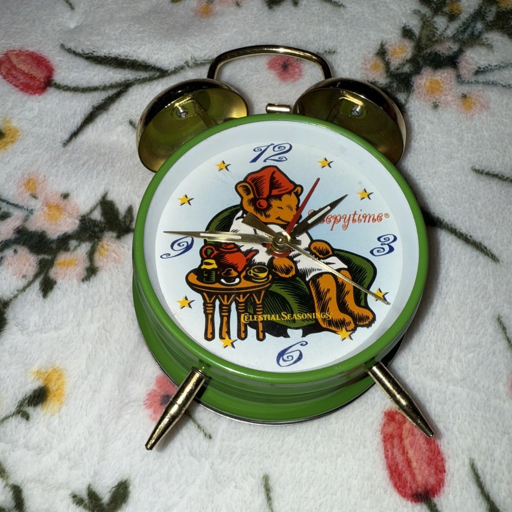 The Vintage Celestial Bear Sleepytime Wind Up Clock is a charming and unique decorative collectible featuring a bear character within a celestial themes design. The clock is powered by winding up the mechanism, making it a nostalgic and whimsical addition to any room. The green color adds a touch of nature to the piece, making it a lovely accent for collectors or those who appreciate vintage decor. This clock is sure to bring a sense of relaxation and nostalgia to its new home. The clock works very well and is in excellent condition, one of my wife’s collection pieces.