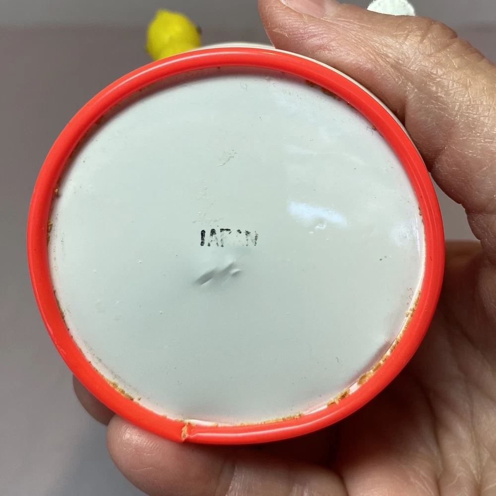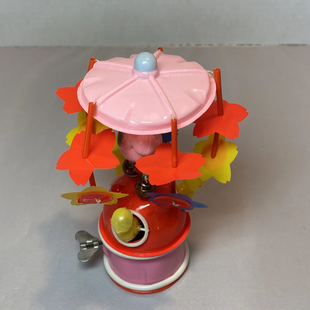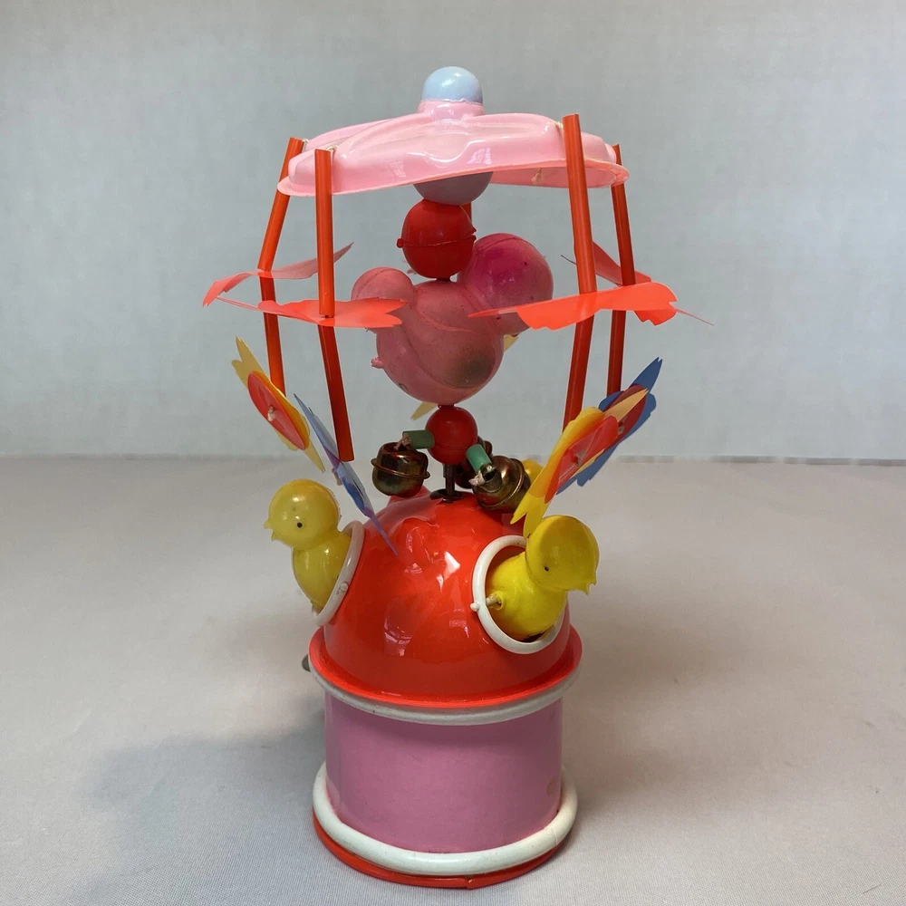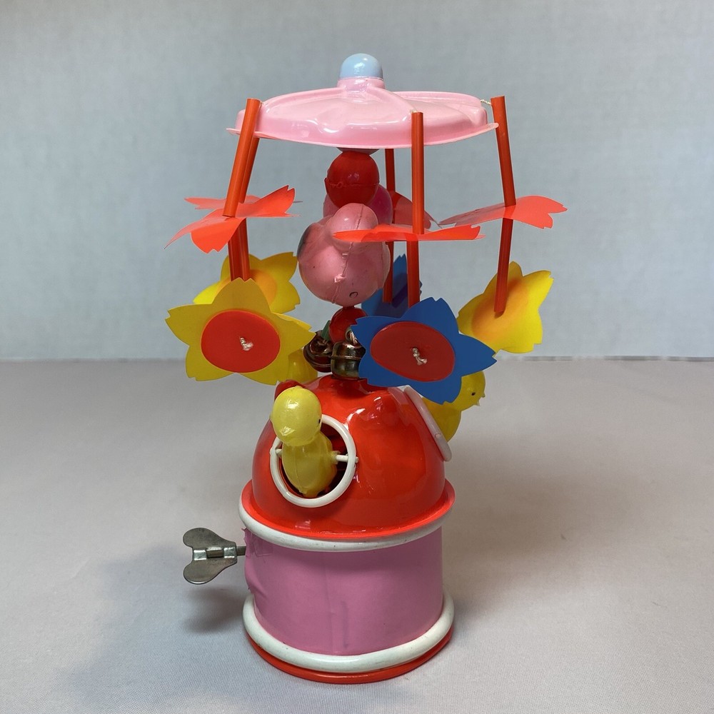 Vintage celluloid wind up mechanical Easter chicks on the carousel. When you wind up the key (included) the chicks heads pop up and down, and the top spins. This piece was made in Japan, c : 1950-60's, sorry original packaging. This piece measures approximately 2 1/2" by 6 1/4" tall and is in wonderful shape . This item was pre-owned. I took pictures from several different angles so you can see the figure(s) from the front and back and the sides. The p ieces may seem or may have some minor paint loss or crazing/damage due to the materials, age, and the prior storage of these pieces. But, please examine ALL the pictures closely as it is the actual items you will receive. If you have any questions, please message before purchasing. I am happy to combine shipping on multiple items, please request an invoice before paying. S hipped with USPS Priority Mail, UPS or FedEx, whichever one is more convenient for you. (#378)
