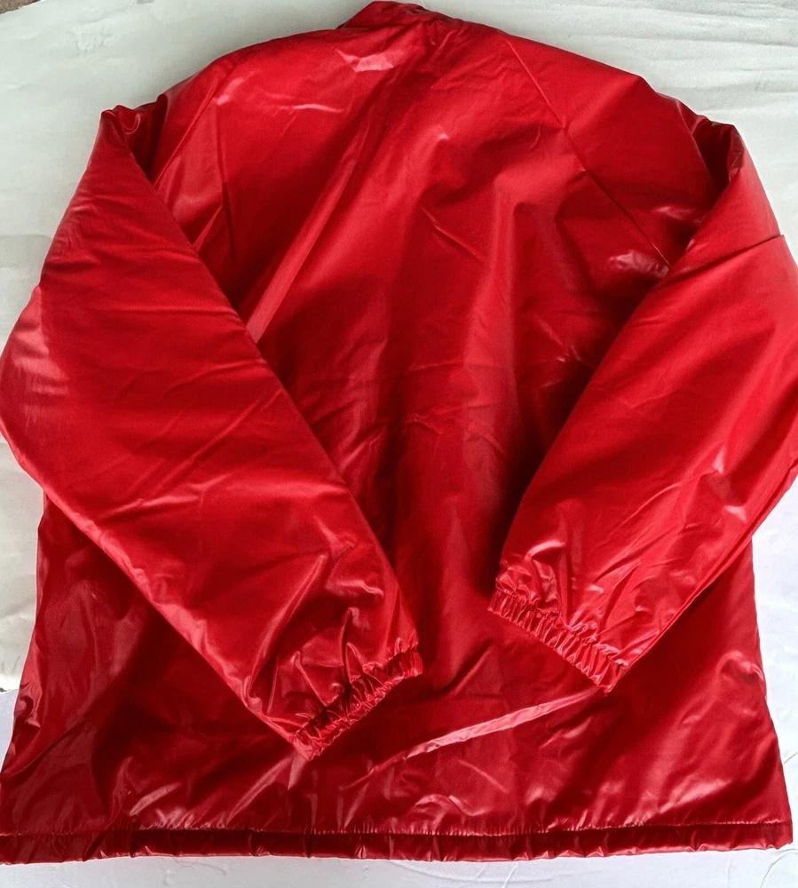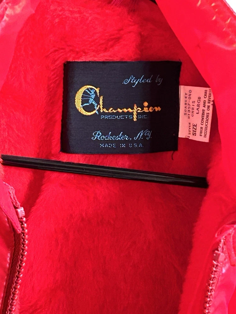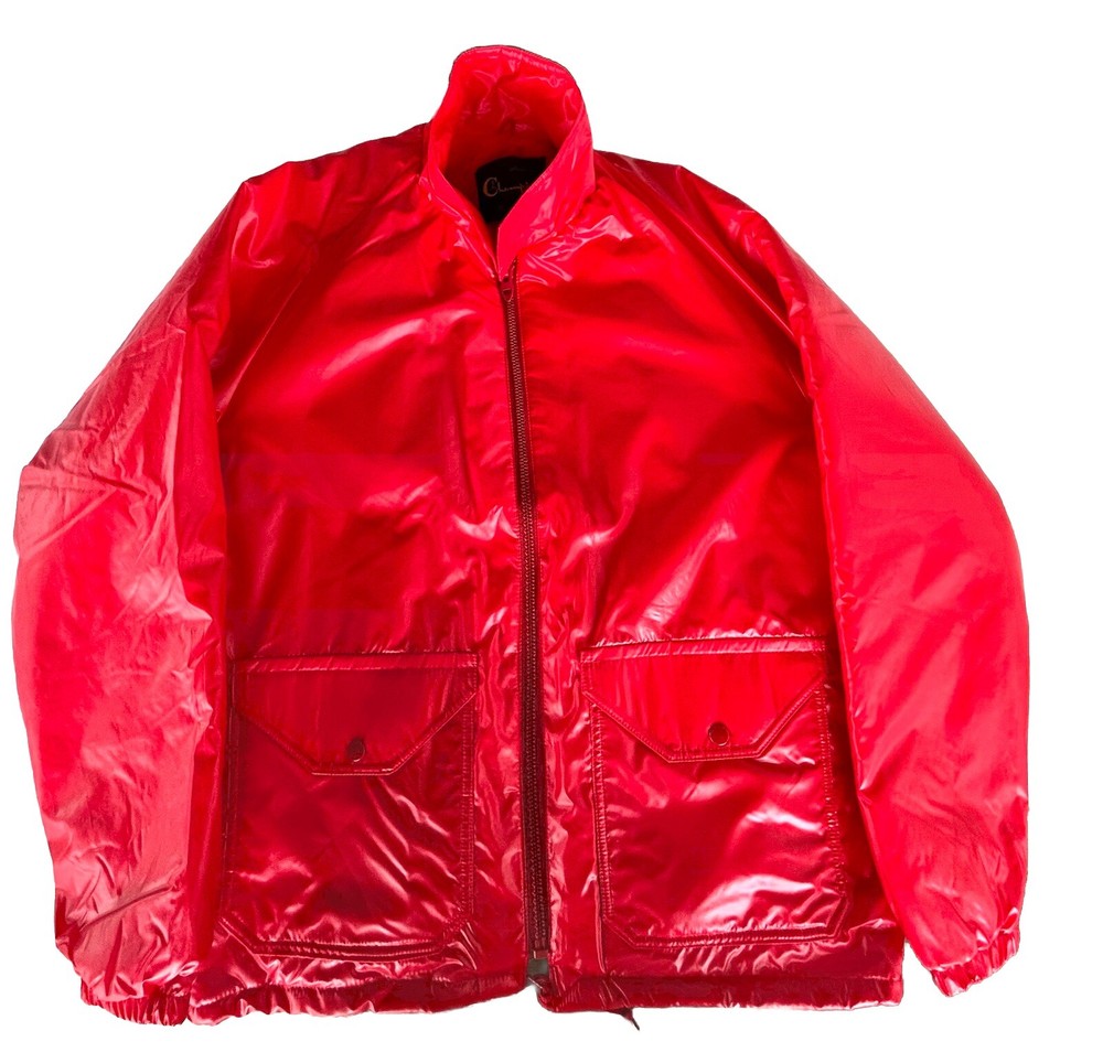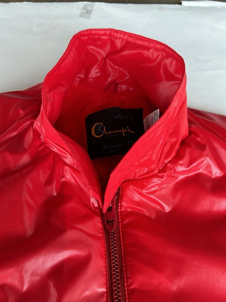 Selling a vintage bright red nylon Men’s running jacket size Large. Jacket looks brand new. Estate find! Made by Champion Products of Rochester, NY. This jacket is lined in red fleece. It measures roughly 20 inches from shoulder to shoulder. No natural shoulder line sleeve flows from neck to end of arm. Chest measurement is 44. Jacket Length is 30 inches. Sleeve measurement roughly 30 inches. Elastic on ends of sleeves. Also draw string closure at waist. 2 button closure at collar or can lay flat. Machine washable hang dry. Champion gained mainstream popularity in the late 80s to early 90s thanks to a wave of hip-hop artists who brought sportswear from the basketball court to the streets. This jacket is definitely from the era. See pictures.