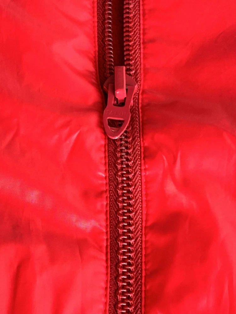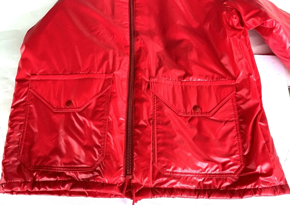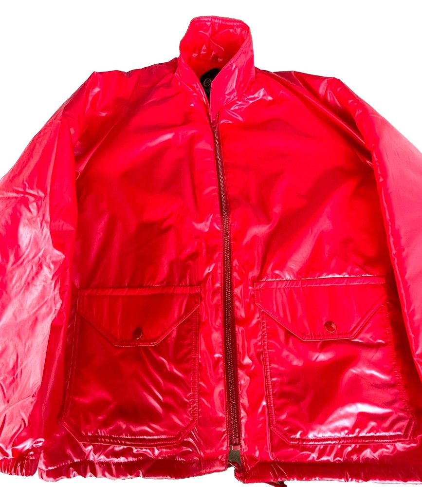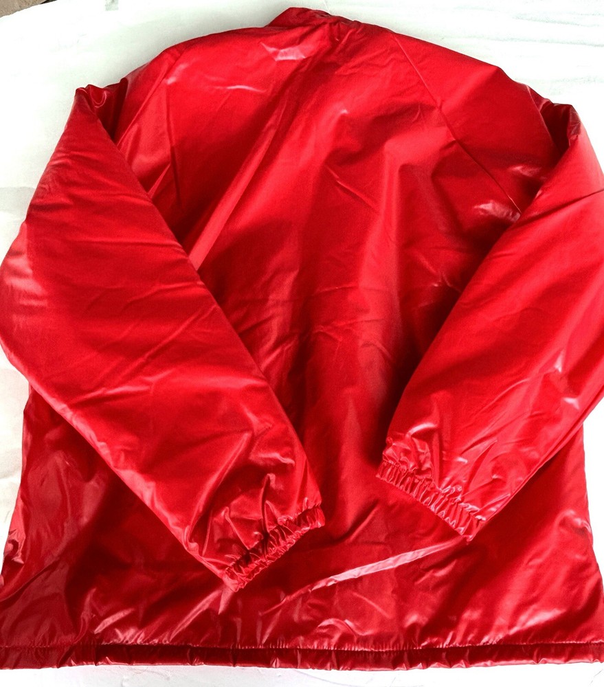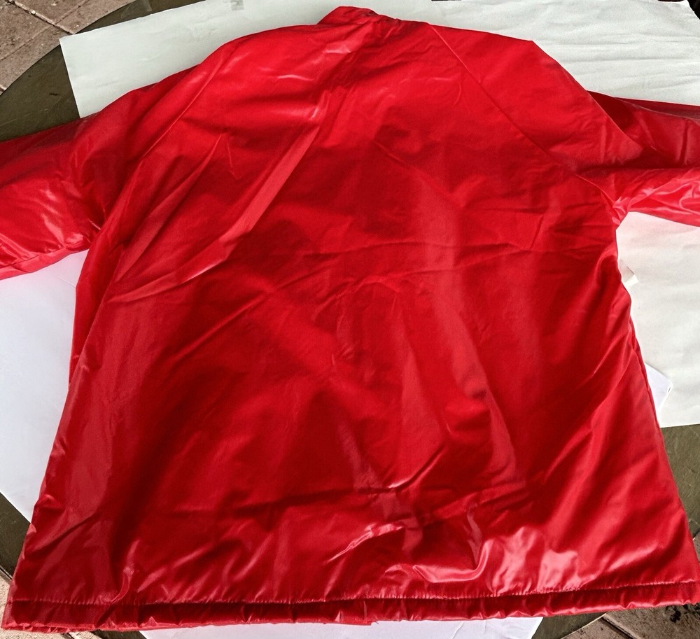 Selling a vintage bright red nylon Men’s running jacket size Large. Jacket looks brand new. Estate find! Made by Champion Products of Rochester, NY. This jacket is lined in red fleece. It measures roughly 20 inches from shoulder to shoulder. No natural shoulder line sleeve flows from neck to end of arm. Chest measurement is 44. Jacket Length is 30 inches. Sleeve measurement roughly 30 inches. Elastic on ends of sleeves. Also draw string closure at waist. 2 button closure at collar or can lay flat. Machine washable hang dry. Champion gained mainstream popularity in the late 80s to early 90s thanks to a wave of hip-hop artists who brought sportswear from the basketball court to the streets. This jacket is definitely from the era. See pictures.