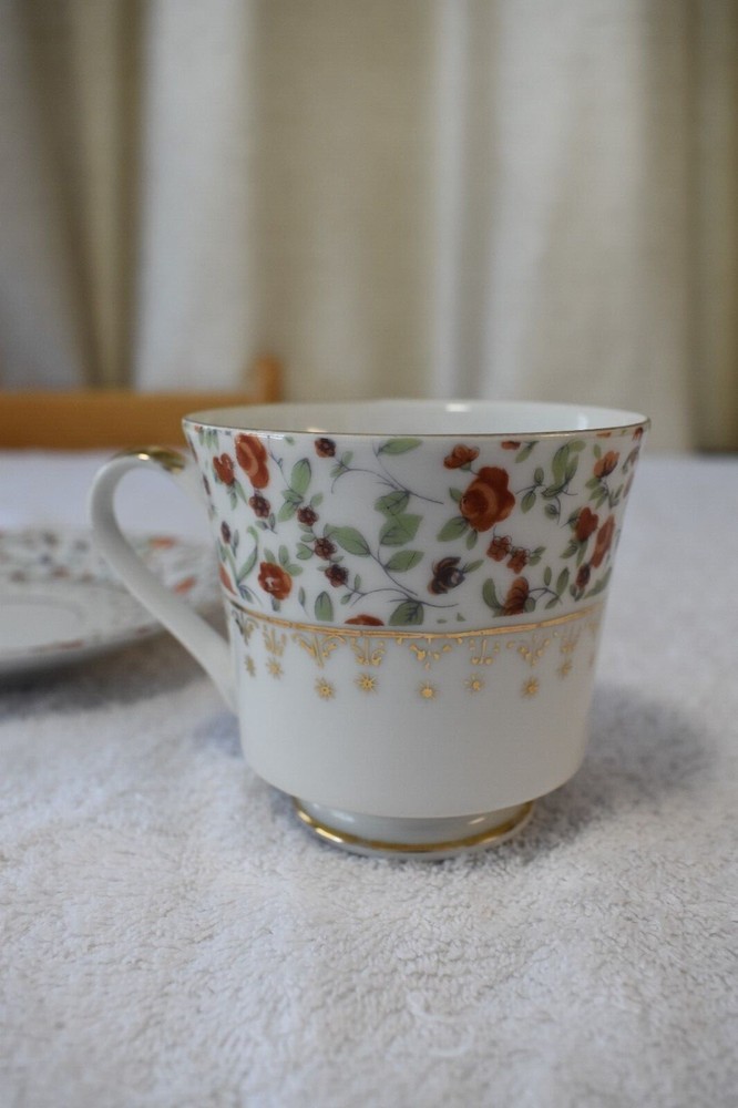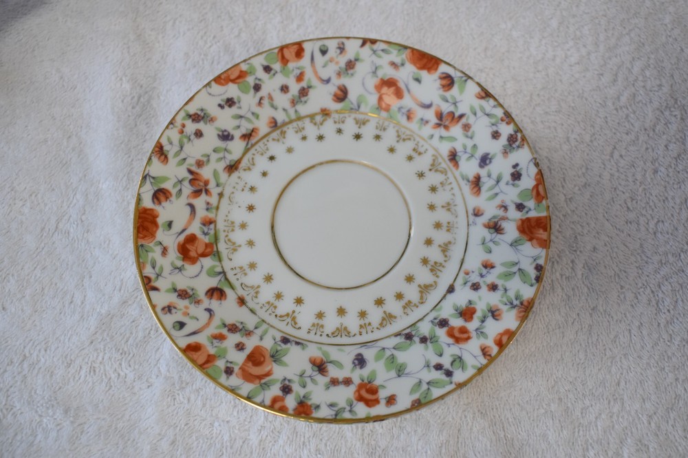 Vintage Choice Imports Japan Tea Cup Saucer Orange Rose Design w/ Gold Trim. Vintage Choice Imports Tea Cup and Saucer in an orange rose design with gold trim. Made in Japan. Seems to be in good condition, see images for condition. Dimensions of cup (approximately): height: 3 inches, length: 4 1/2 inches, and width: 3 1/2 inches. Dimensions of saucer (approximately): height: 3/4 inch, length: 6 inches, and width: 6 inches. **No international sales or shipping**