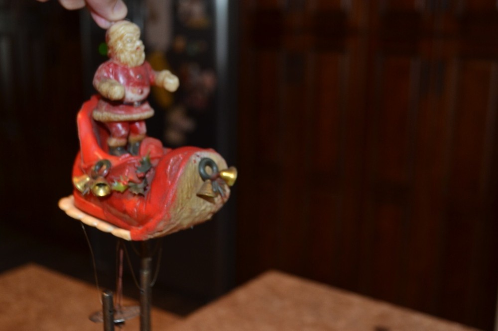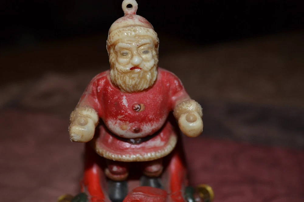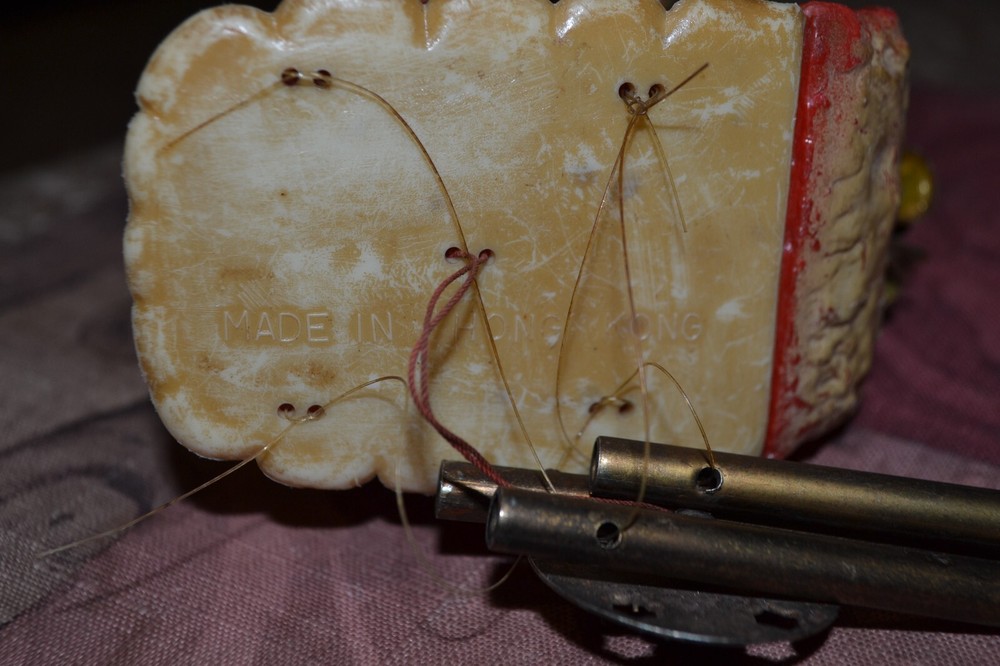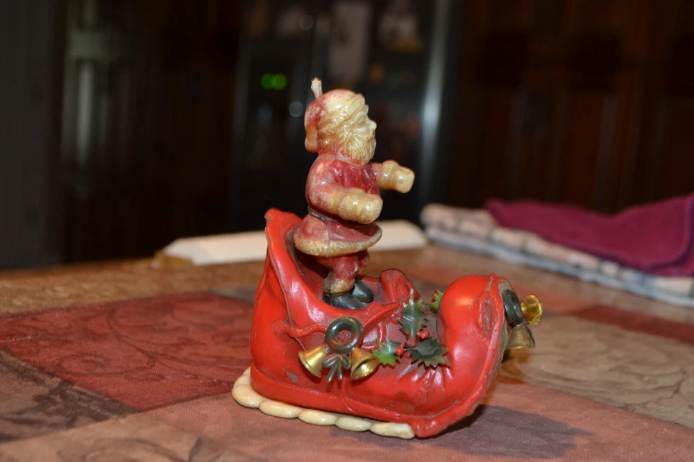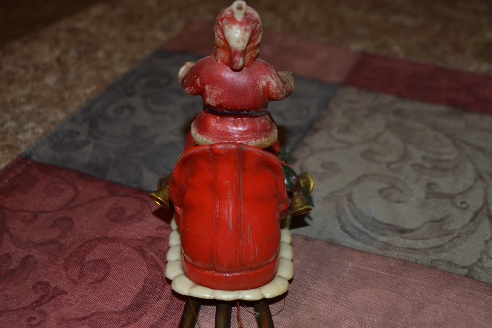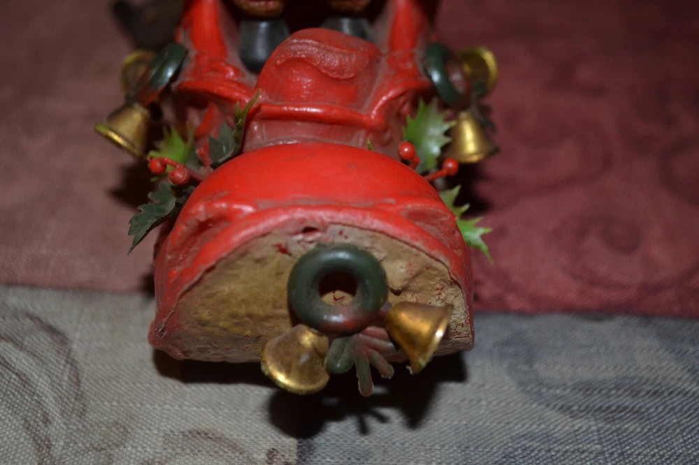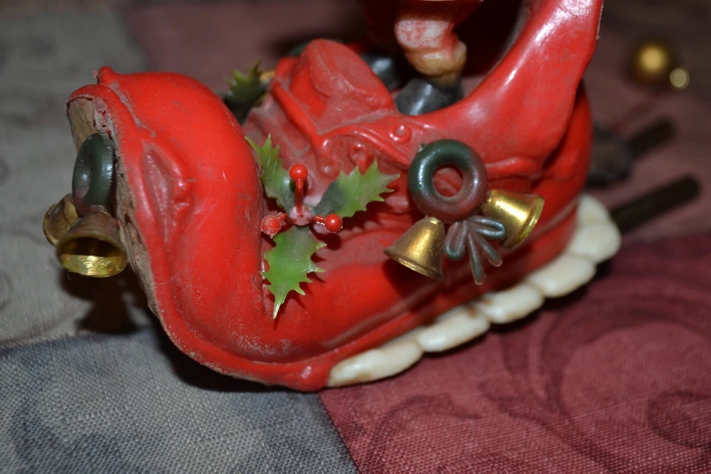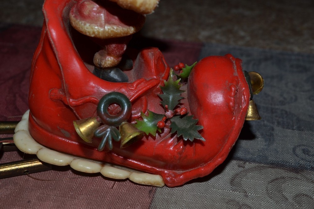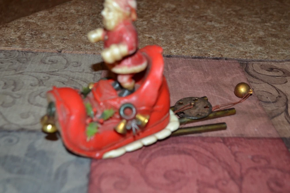 Old sleigh windchime. Made in Hong Kong. Measures approx 4" front to back, 4.5" tall with additional 6.5" from bottom of boot to ball chime. Thanks for Shopping!