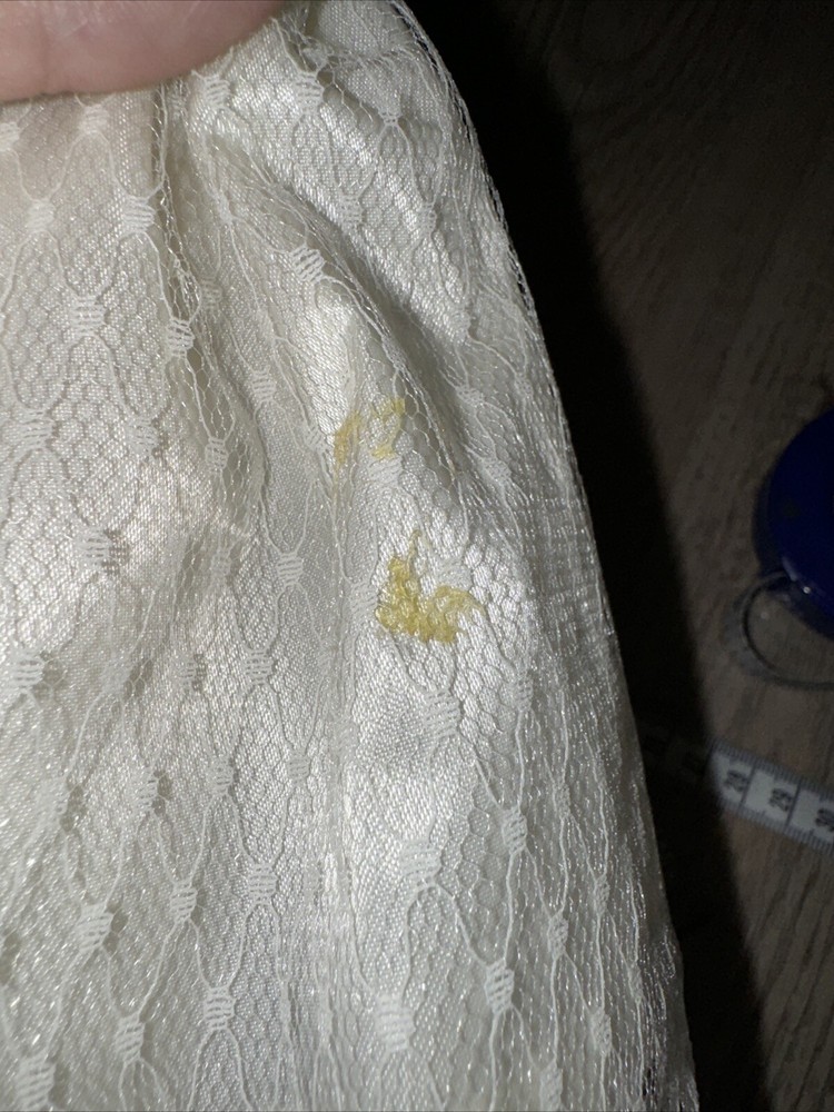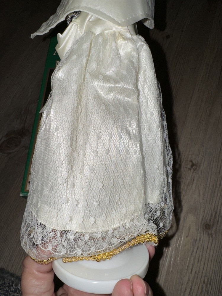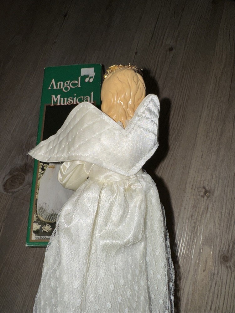 Wind up base musical angel with porcelain face and arms and lace dress Never used, taken out to test and works perfectly. Small glue spot from manufacturer on dress which has turned yellow due to age. See last photo.