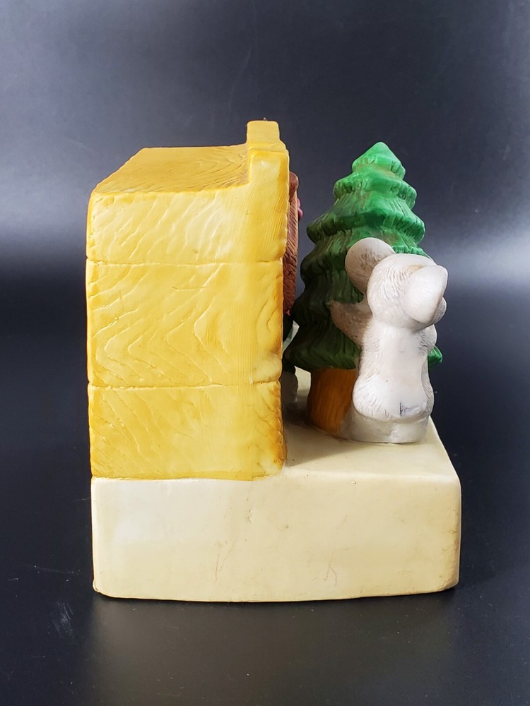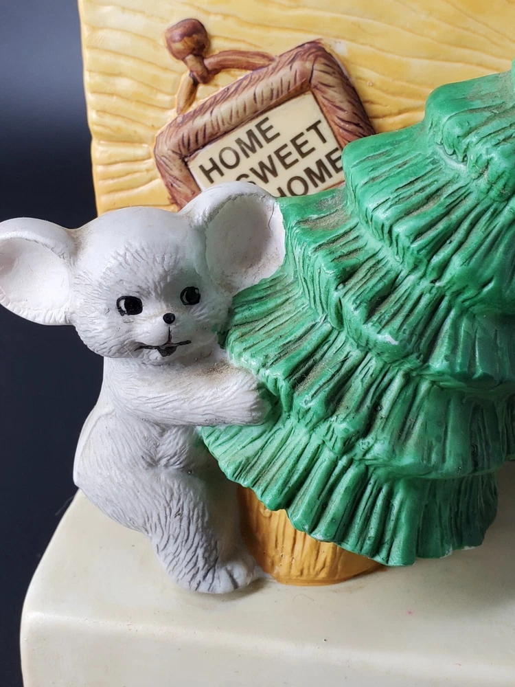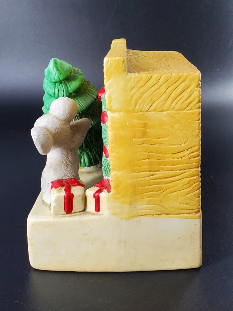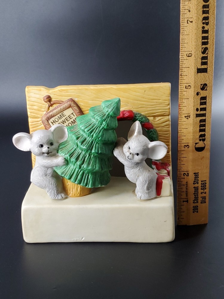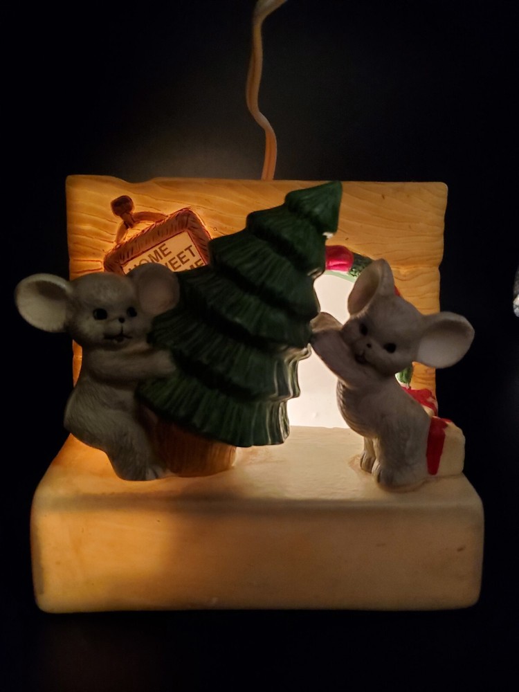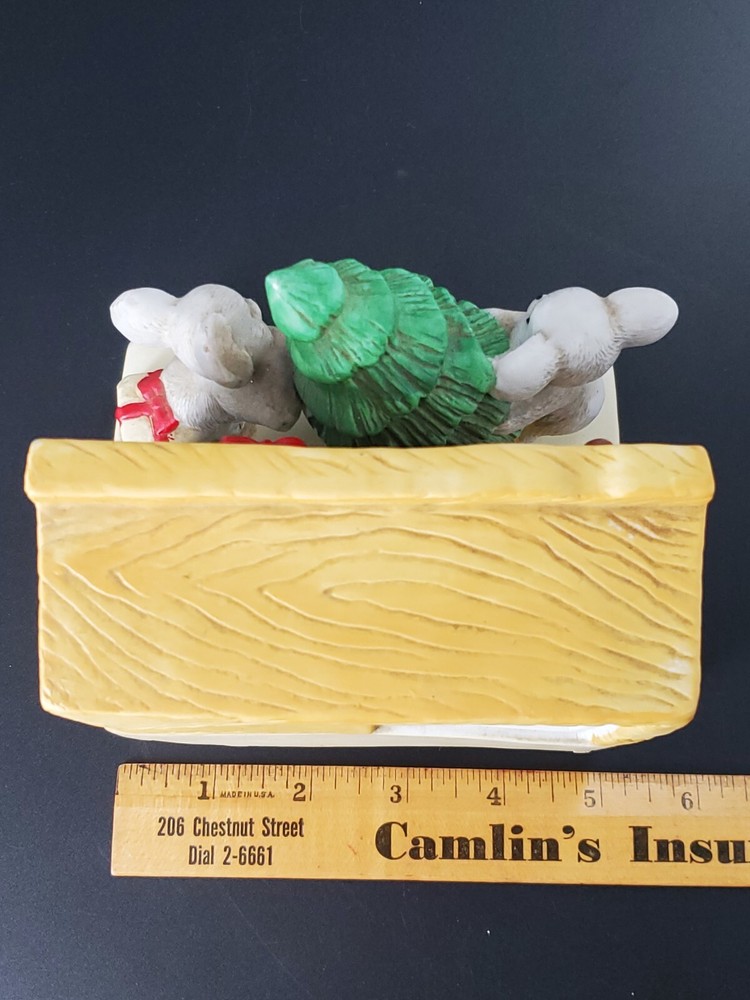 Vintage Christmas House of Lloyd YULETIDE MICE MUSIC BOX has the cutest pair of little creatures setting up a tree. To play music, wind it up and let it play. While the light is not included, such lights are easily purchased -- enjoy this ceramic holiday decorating with our without! No chips or cracks.