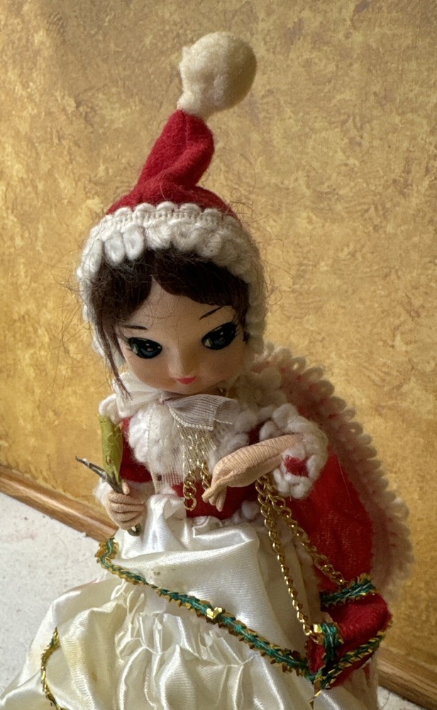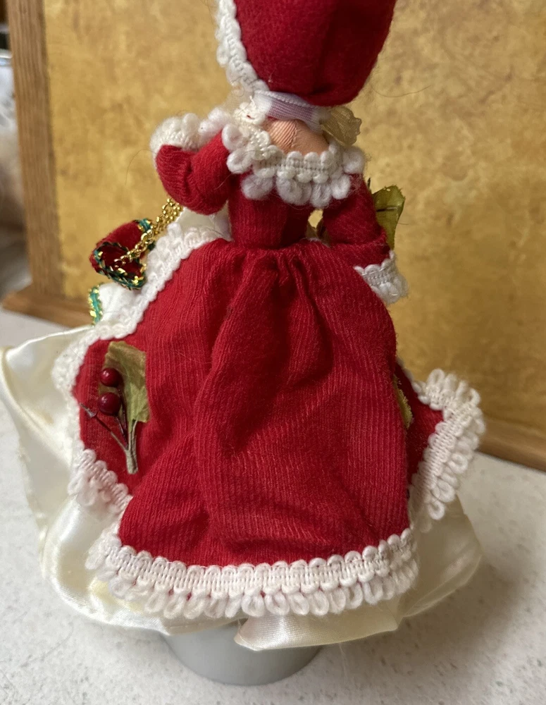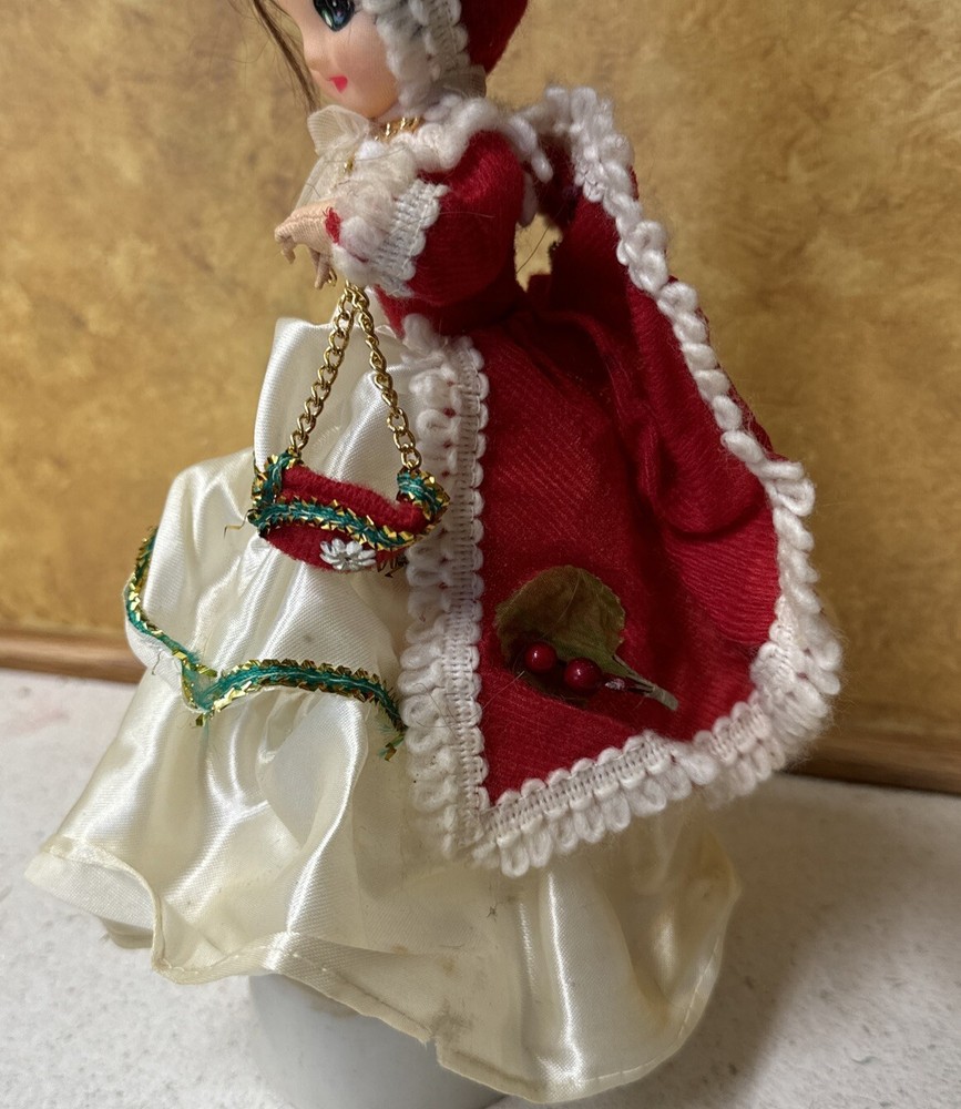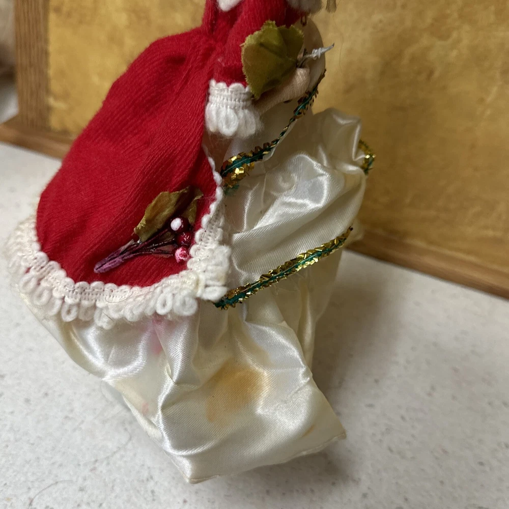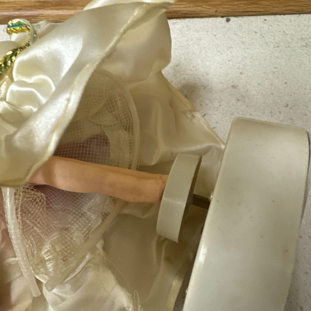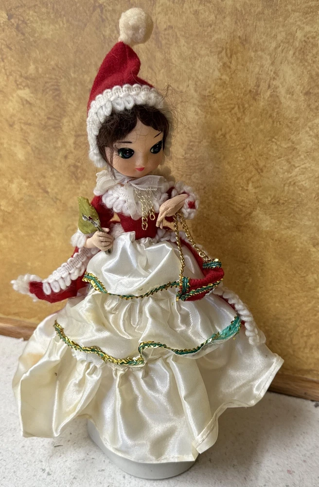 This vintage Christmas figurine is a must-have for collectors and fans of holiday decor. Featuring a classic design of a dashing through the snow, this wind-up musical doll figurine is sure to bring joy to any room. The white color and intricate details make it a perfect addition to any Christmas display. With a wind-up, this figurine is perfect for collectors who appreciate the charm of vintage Christmas decorations. The musical feature adds an extra touch of whimsy, making it a great gift for anyone who loves Christmas. Add this charming piece to your collection today! Figure turns with the music. Has some age stains on bottom of dress