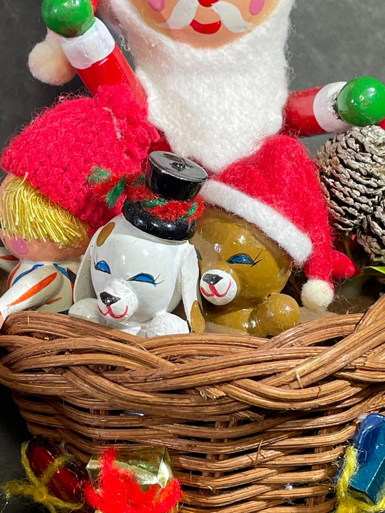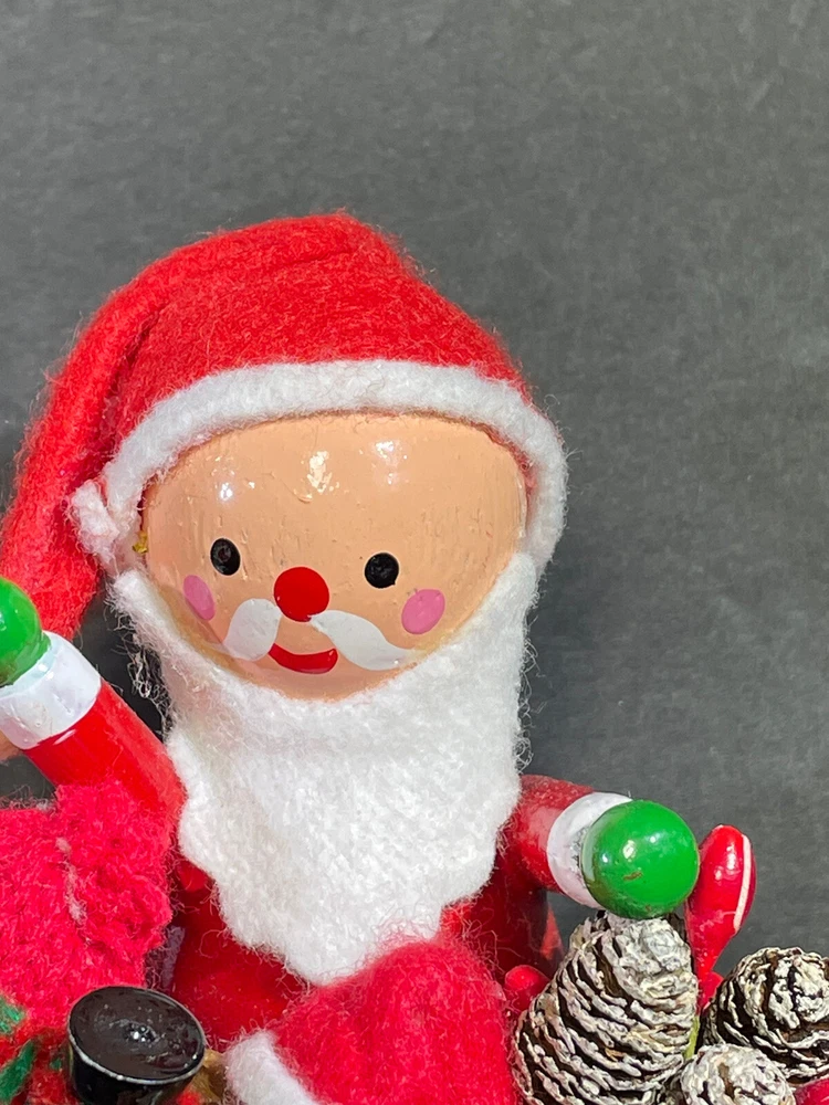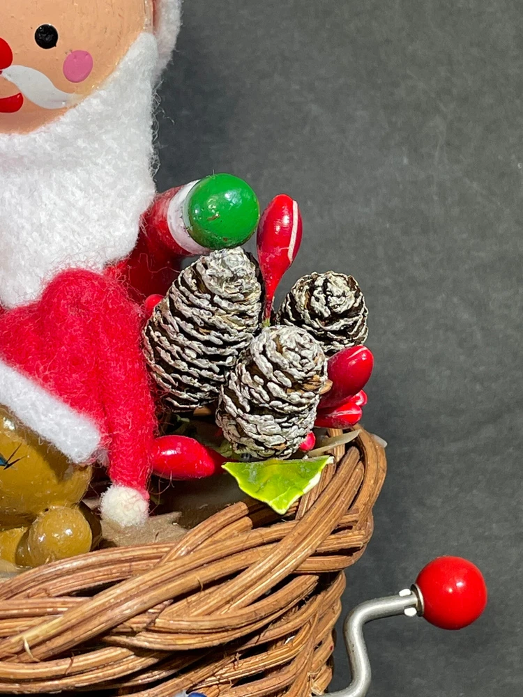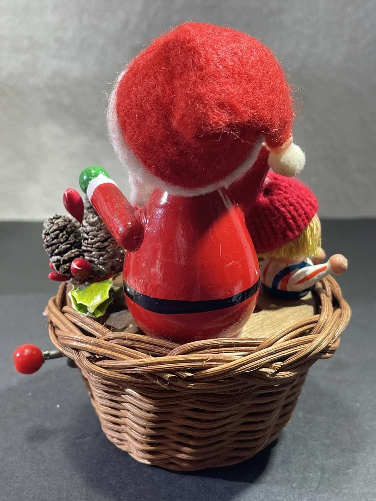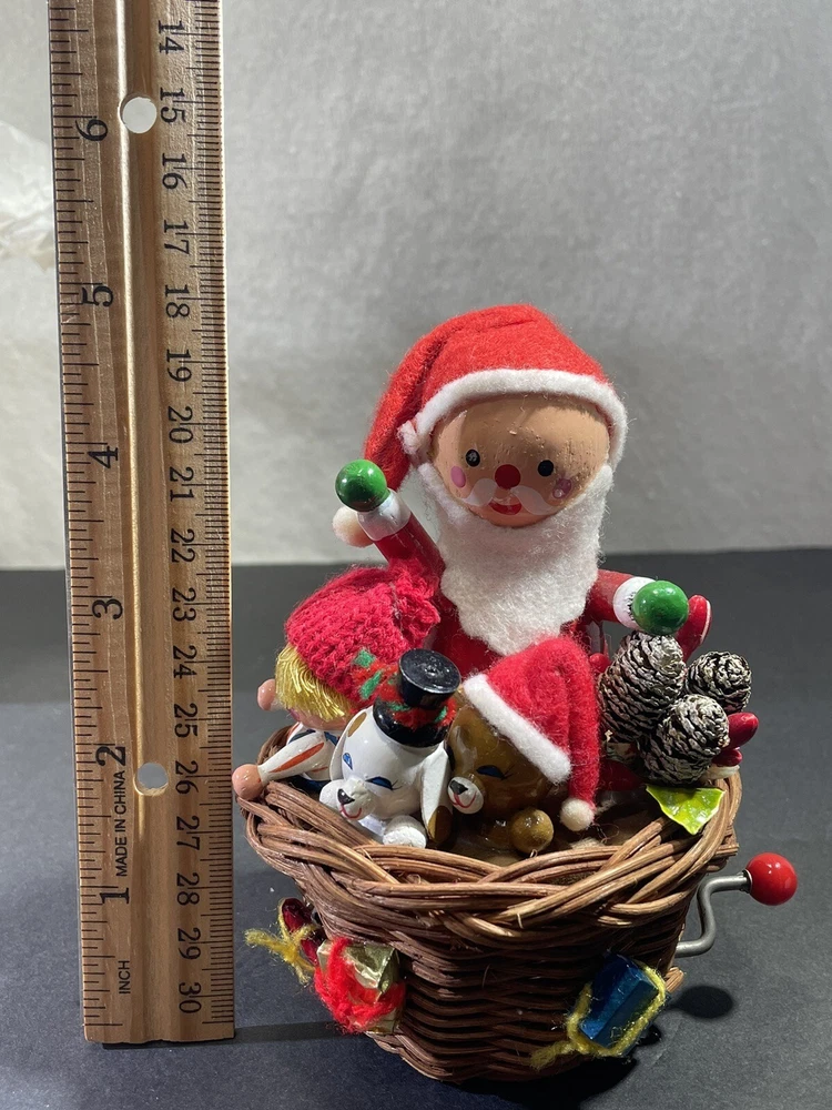 In good condition. About 5 inches tall. Not a wind up- you turn the metal handle and it plays a Christmas song- Here comes Santa Claus. We strive to offer great customer service. Please contact us if you have any questions.