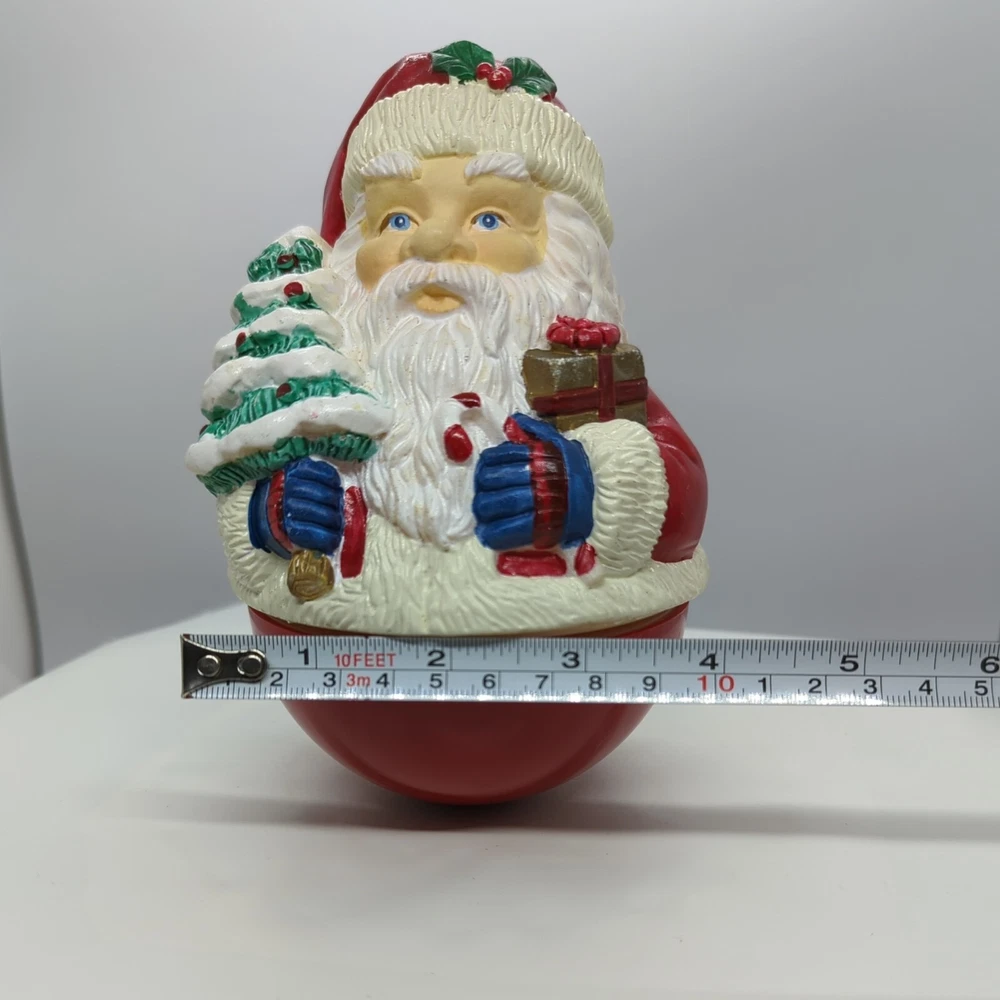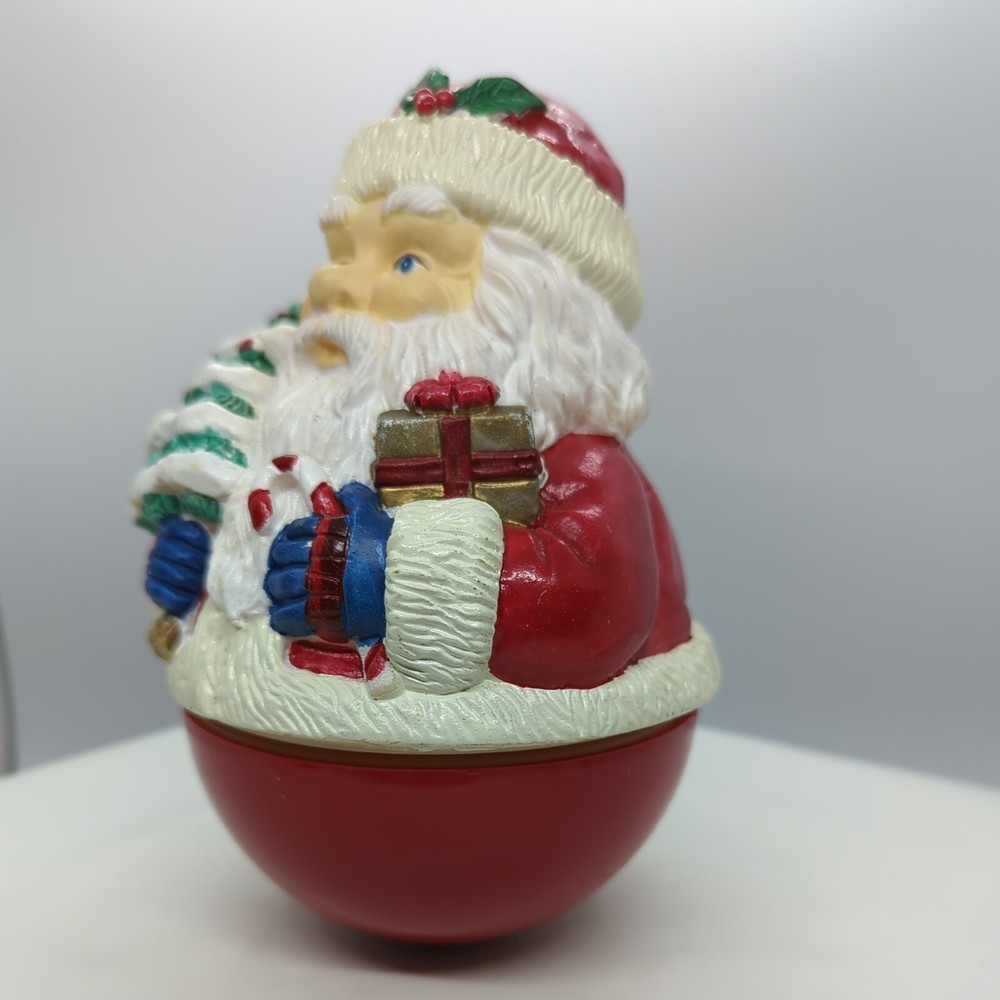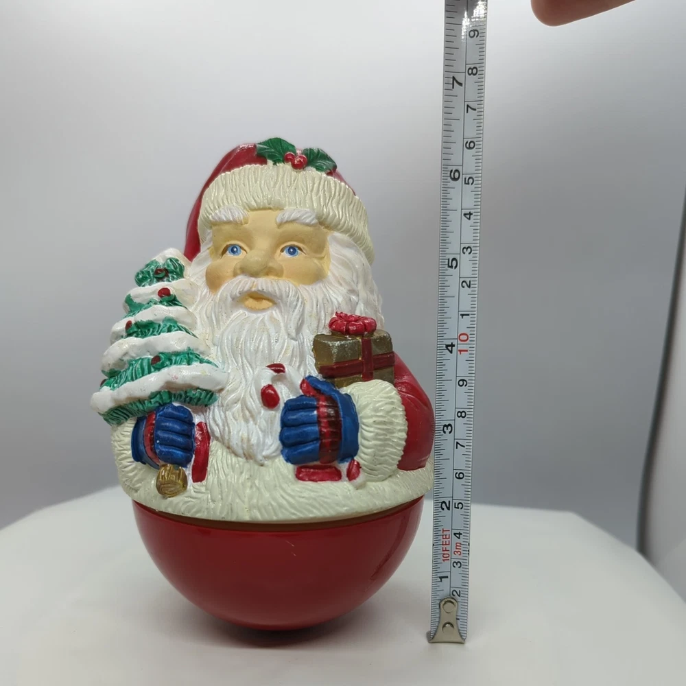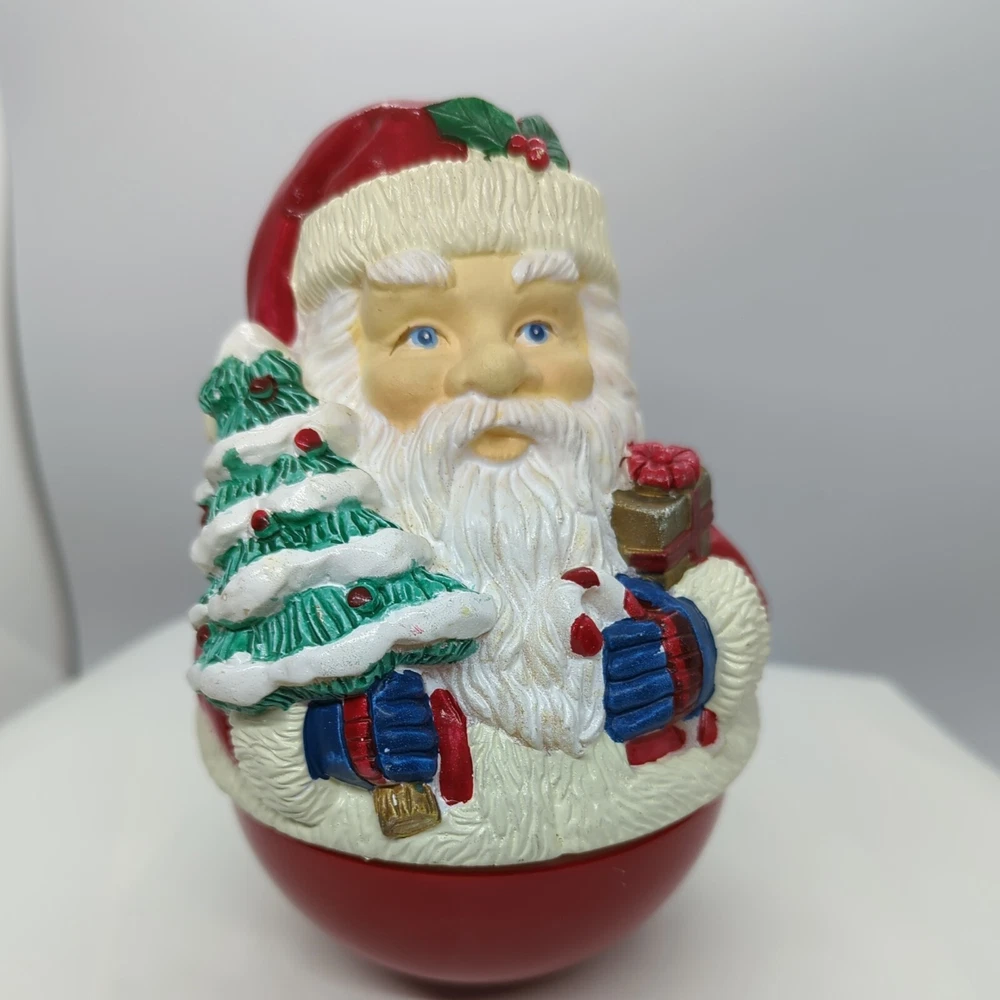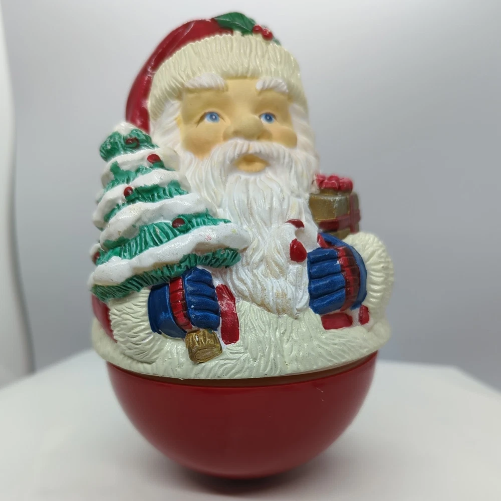 Vintage Christmas Roly-poly Santa Claus Wind up Music Box Christmas Tree Gifts. Pre-owned but in great working condition. Very heavy. Painted very nicely. Look at that face and his blue eyes. When you wind it up, it rotates and plays Jingle Bells. Please refer to the pictures for the item condition and size. Shipped with USPS Priority Mail. X1 - L