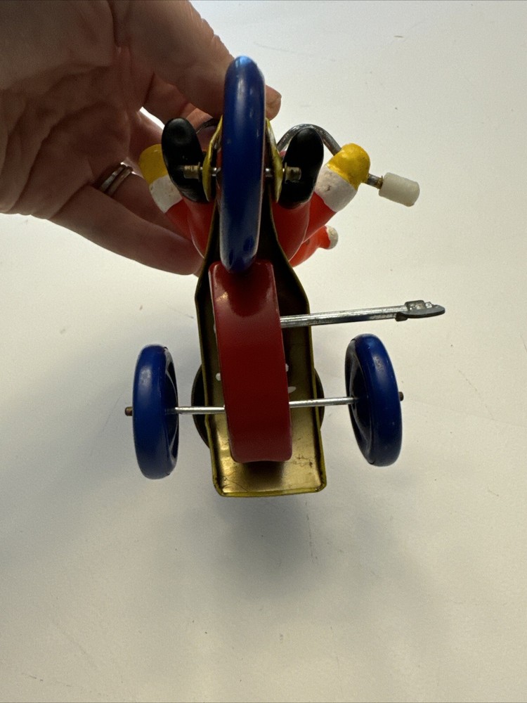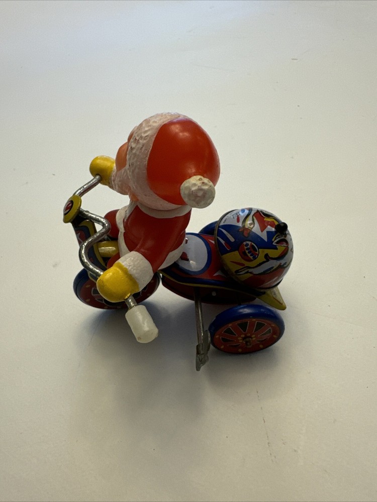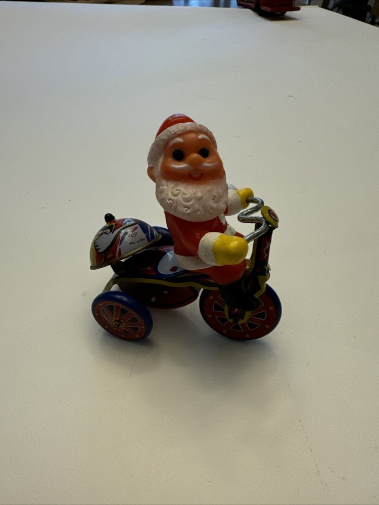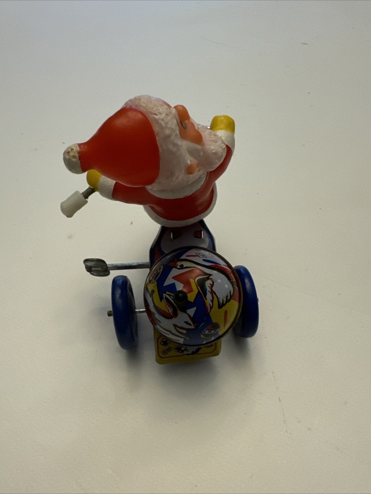 Bring back memories of childhood Christmases with this vintage windup toy featuring Santa Claus riding a tricycle. The multicolored tin figurine stands at 5 inches tall and has a metallic finish. Perfect for collectors or as a holiday gift for a loved one. The pattern and design are sure to bring a smile to anyone's face. Add this original piece to your collection today!