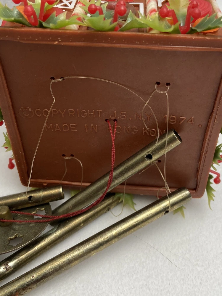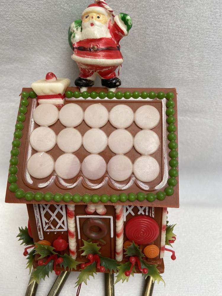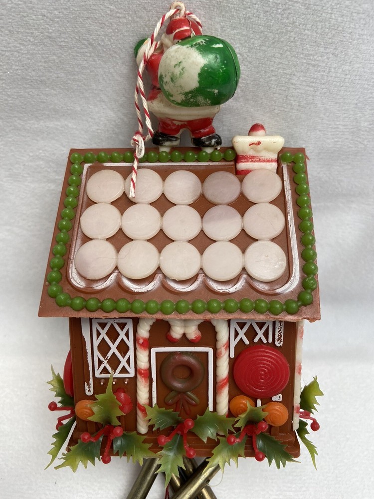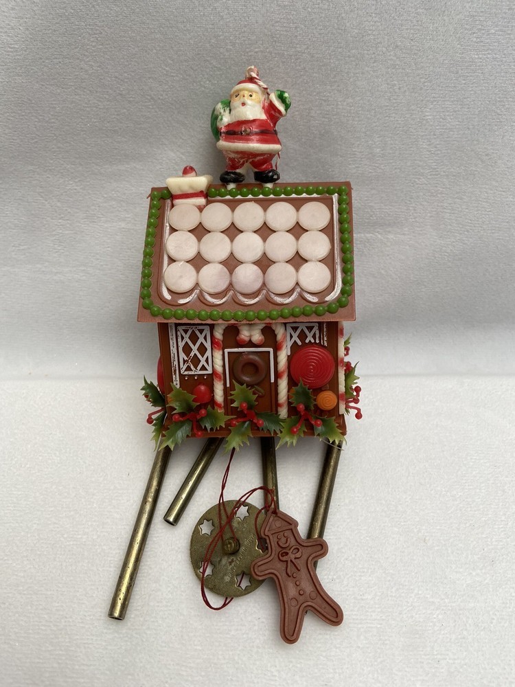 Vintage gingerbread house wind chime Faded color and Santa is missing some paint as seen in photos Due to age and use it is in used condition Paint is missing and faded on the house as well
