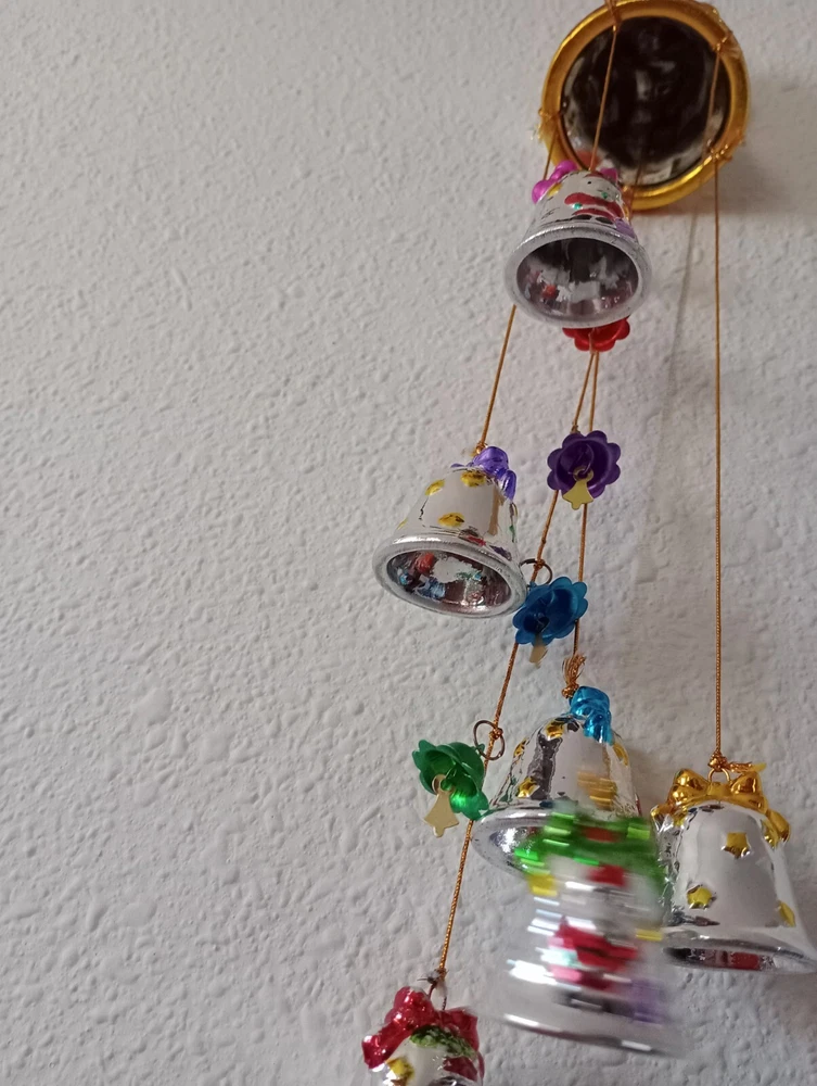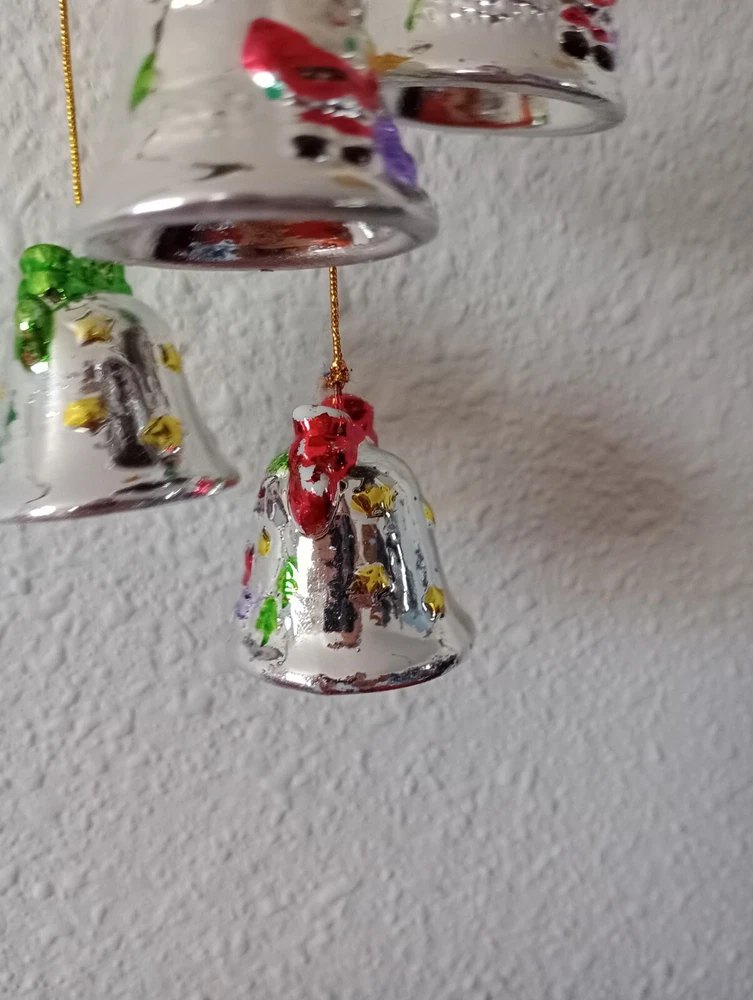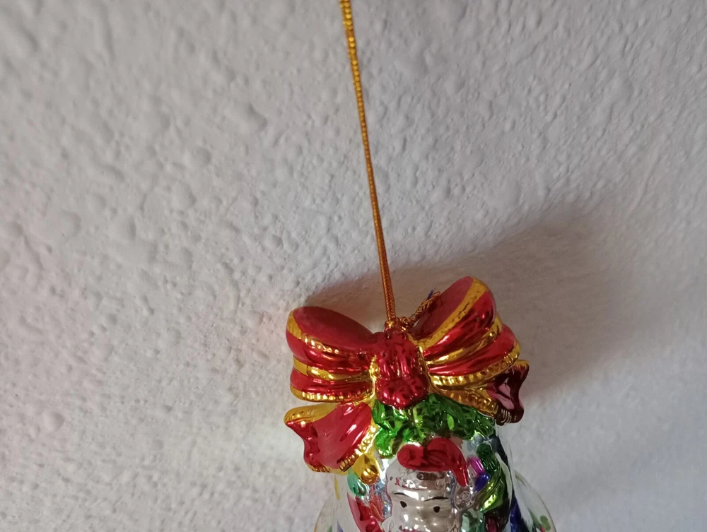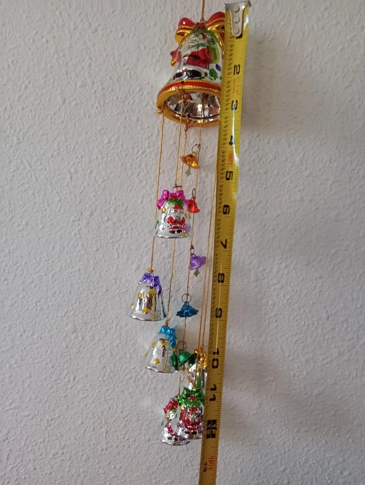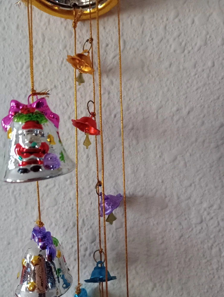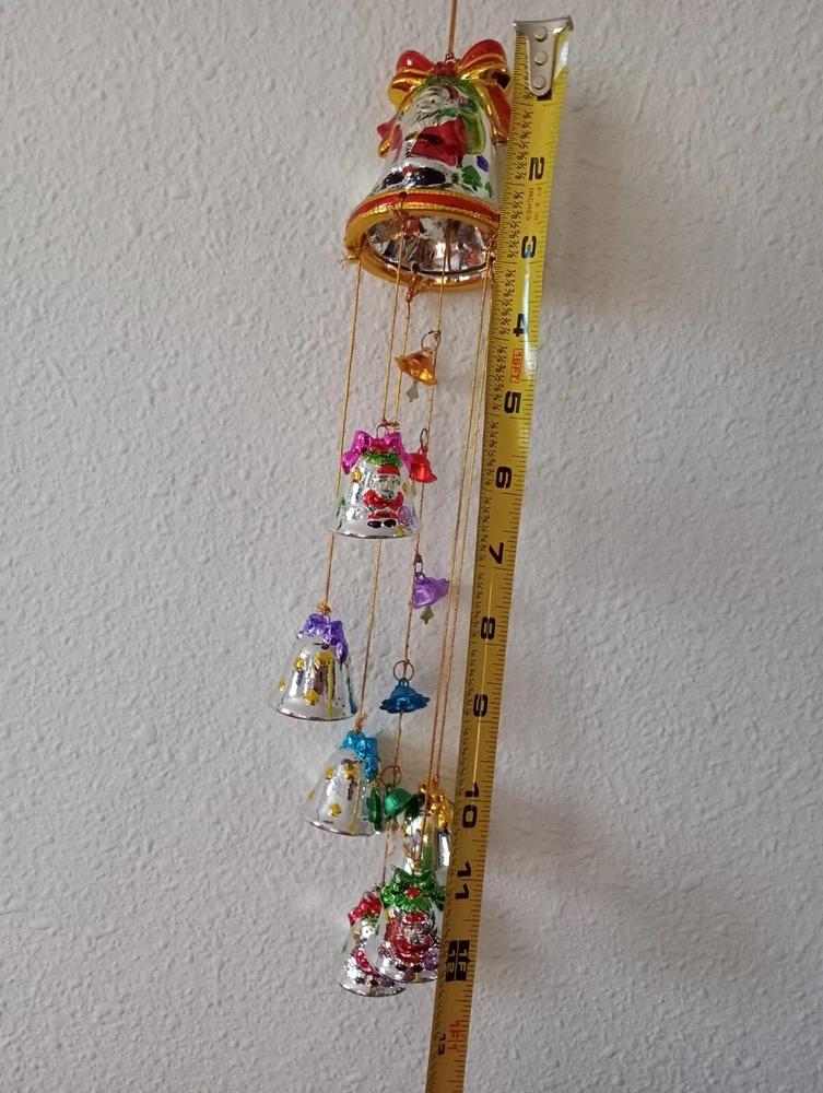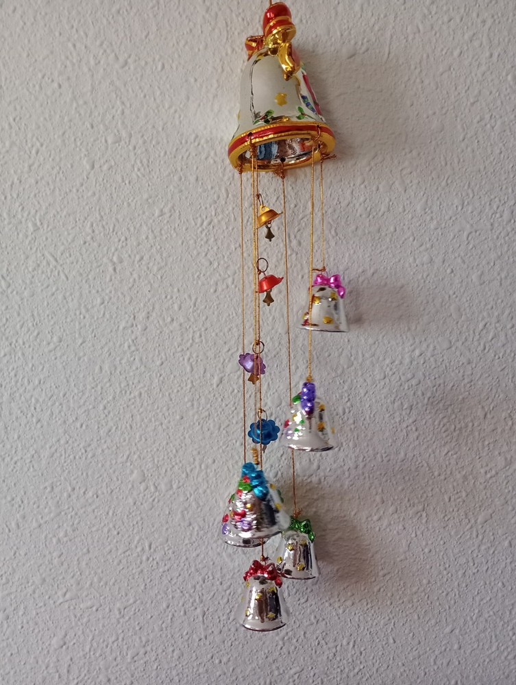 This charming vintage Santa wind chime adds festive cheer with its hand-painted ceramic bells and mercury glass stars. Though it has minor wear like a bit of missing paint, the character shines through—perfect for nostalgic holiday decor. The gentle jingle creates a magical atmosphere. Great find for collectors!