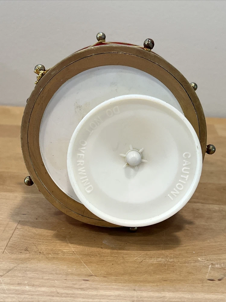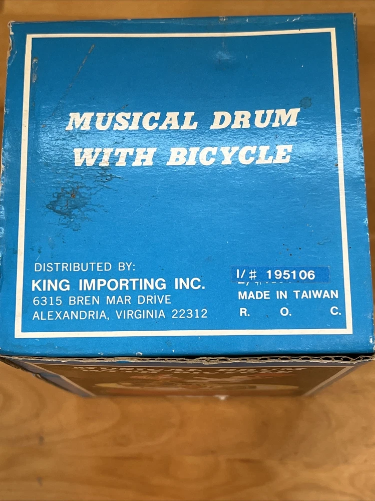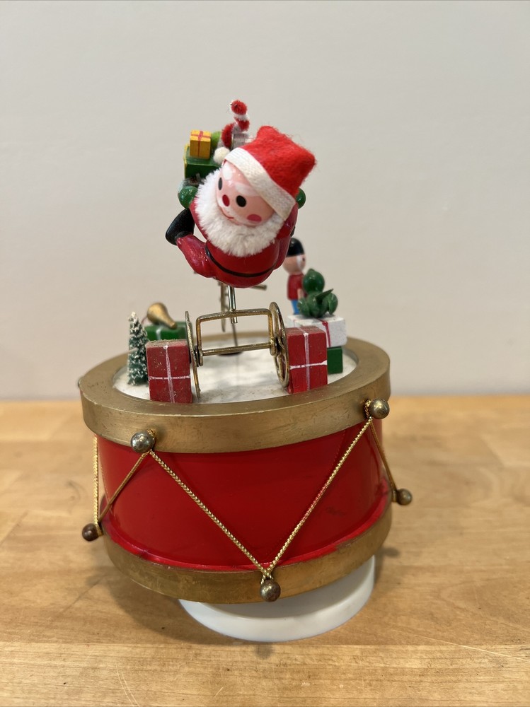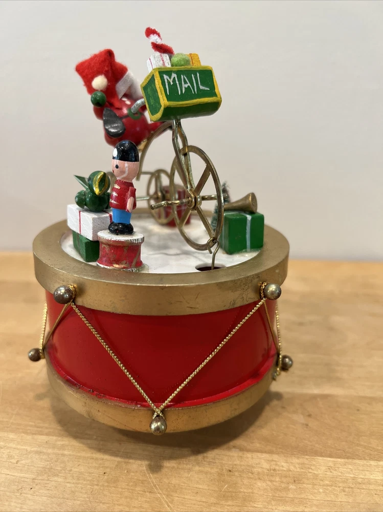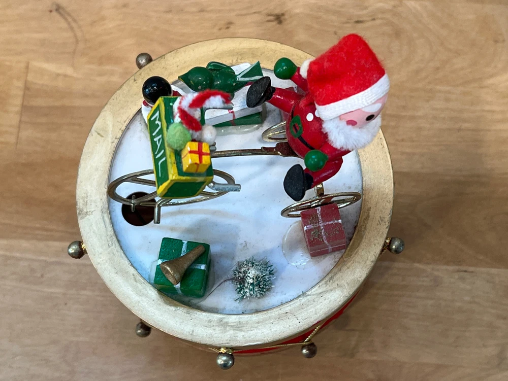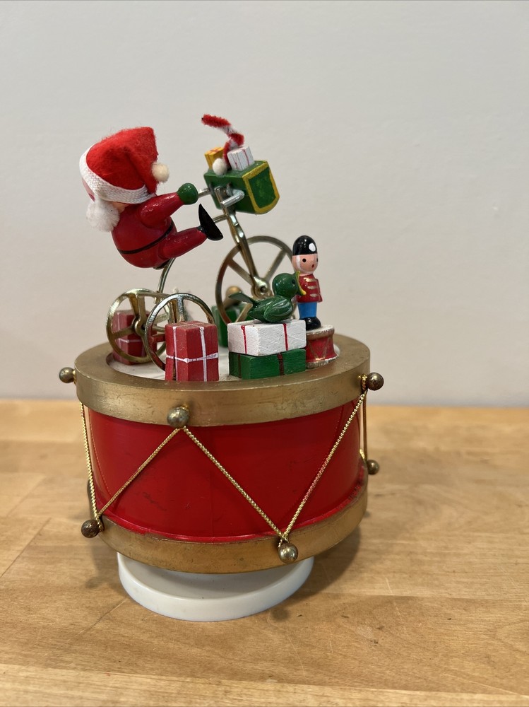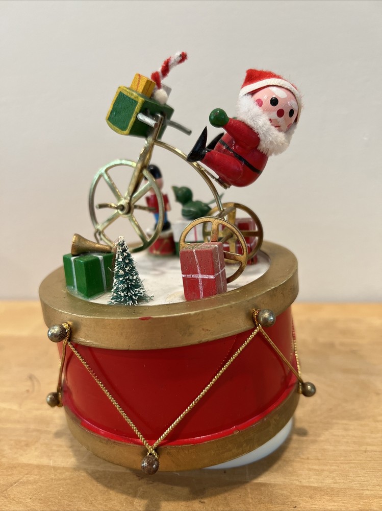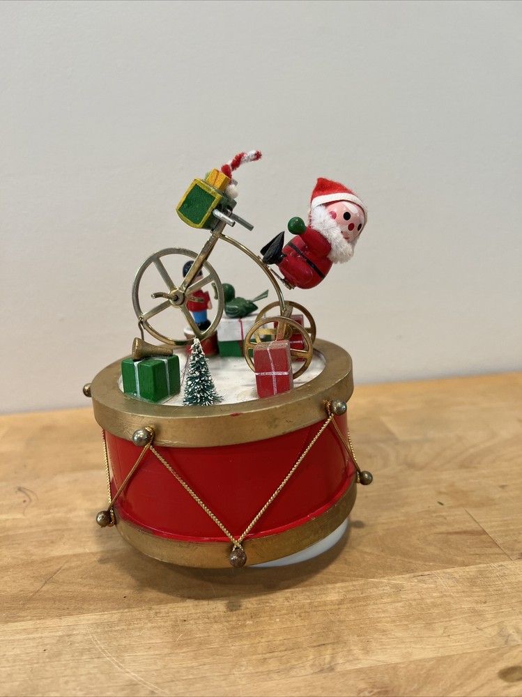 Vintage Christmas Wooden Santa on Metal Bicycle Whimsical Wind Up Musical Decor Music Box. Comes with original box. Nice pre-owned condition. Plays Rock-a-bye-baby. Works great. Adorable- the bike goes up and down as the drum base turns round.