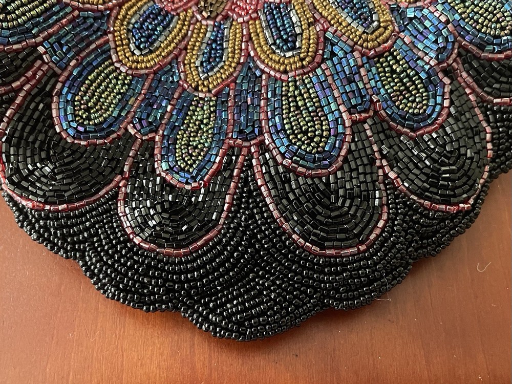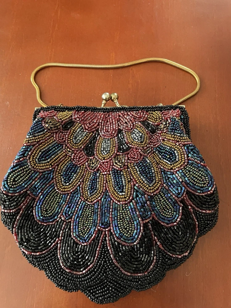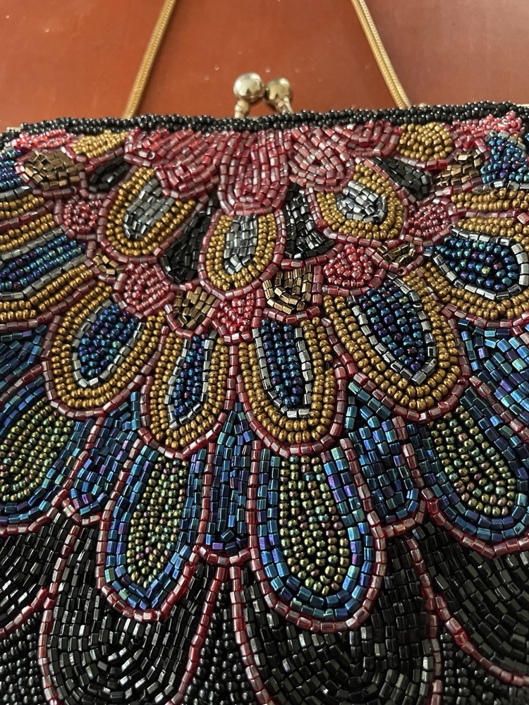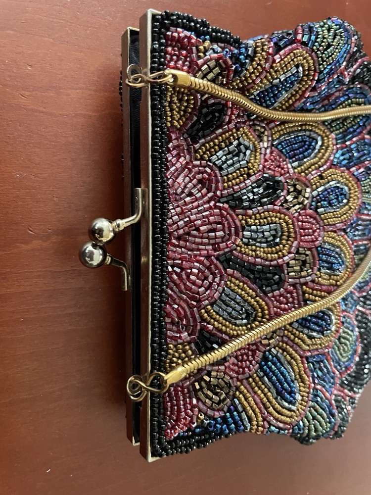 The bag features a mix of colorful beads, including gold, red, blue, and black, creating a vibrant and intricate pattern. The bag is designed with a clasp at the top and strap. The bag is 6 1/2“ x 6“....