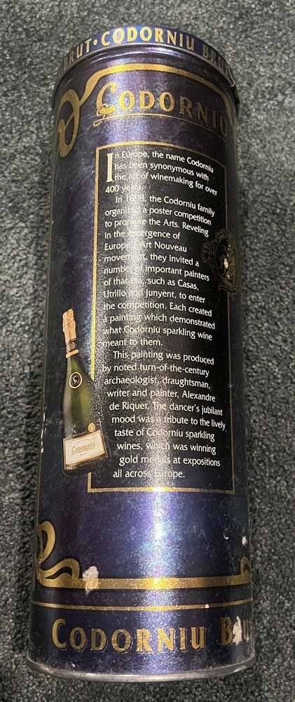 This vintage Codorniu Brut tin features a beautiful Art Deco design that will make a great addition to any collection. Measuring 12.5 inches, this tin was made in the United States and showcases the brand of Medallion Wine Imports. The colorful design is eye-catching and will add a pop of color to any room. Perfect for collectors of advertising and memorabilia tins, this piece is a must-have for wine enthusiasts. It is in used condition and has a history that makes it all the more special. Don't miss out on the chance to own this unique and beautiful vintage tin.