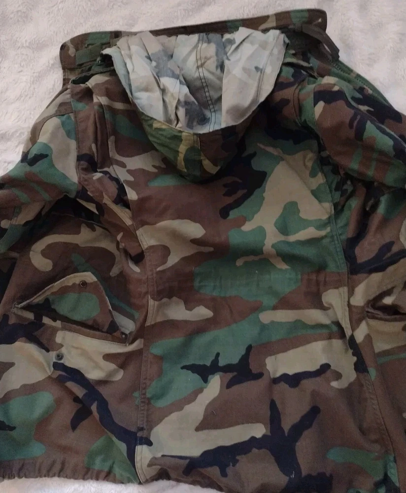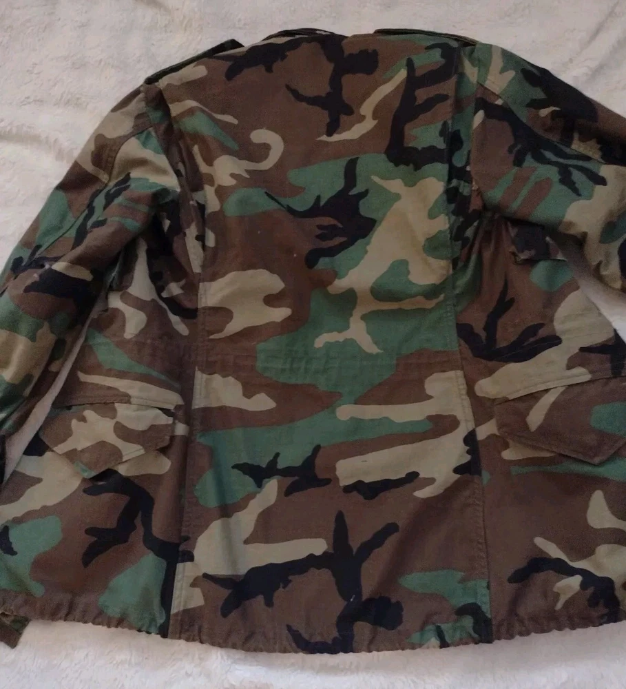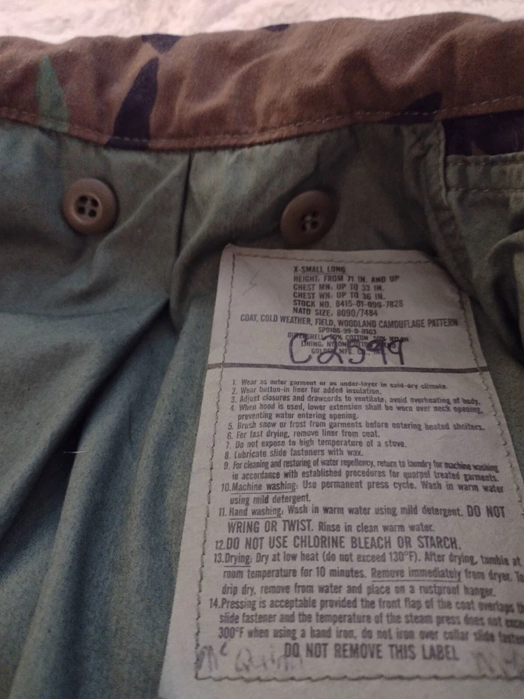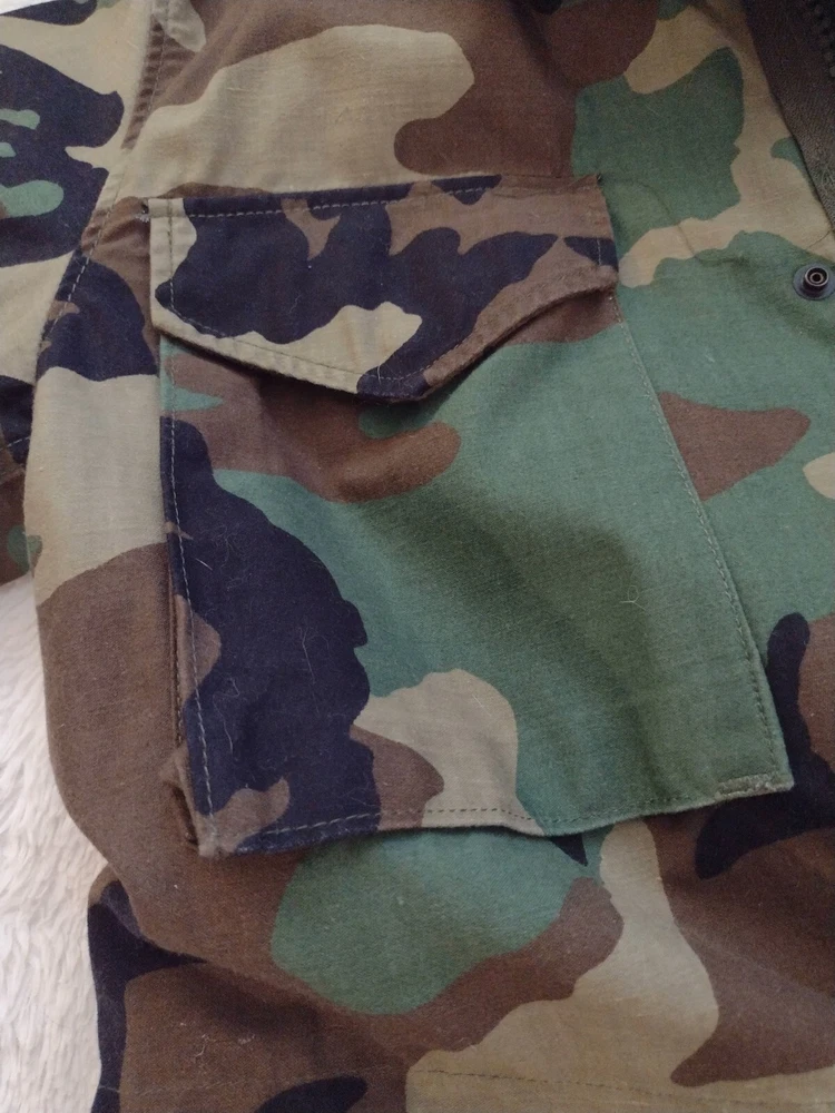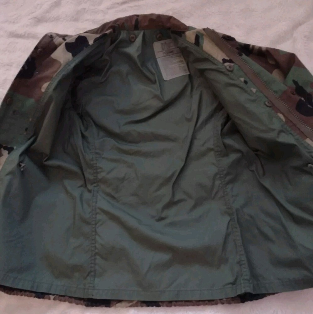 This is a U.S. Military issue Army Cold Weather Coat in woodlands / camouflage pattern, size XS long. It is a mid-length jacket featuring a button and zipper closure, drawstrings, and a cotton lining. The jacket has a band collar and is designed for unisex adults. It includes accents like pockets, a zip away hood, and is wind-resistant, suitable for all seasons. Made of nylon/cotton blend, it is machine washable and suitable for chest sizes up to 33 inches for men and 36 in for women. This jacket is in excellent condition. Please see photos for condition details.