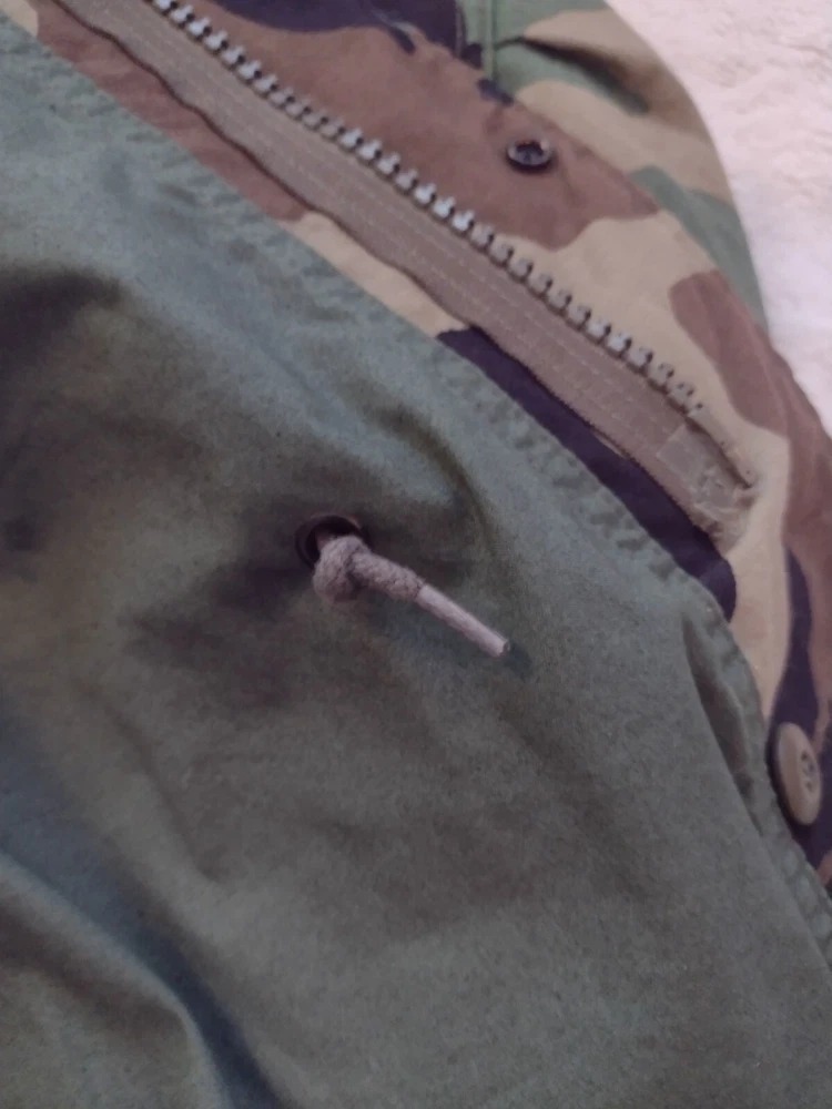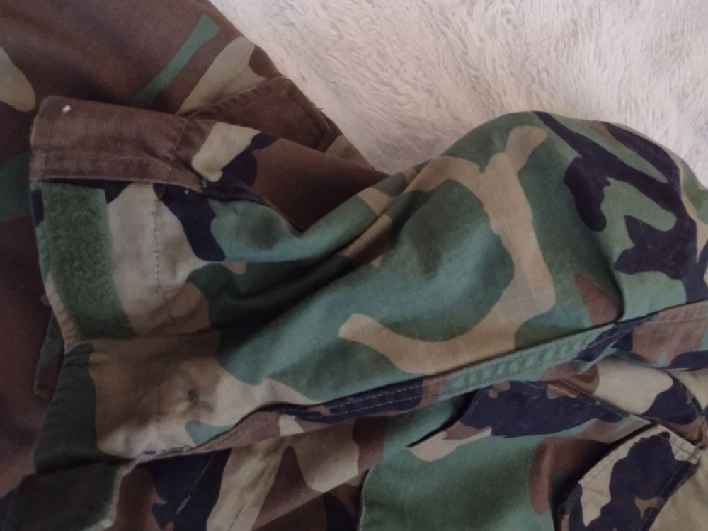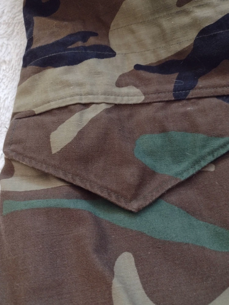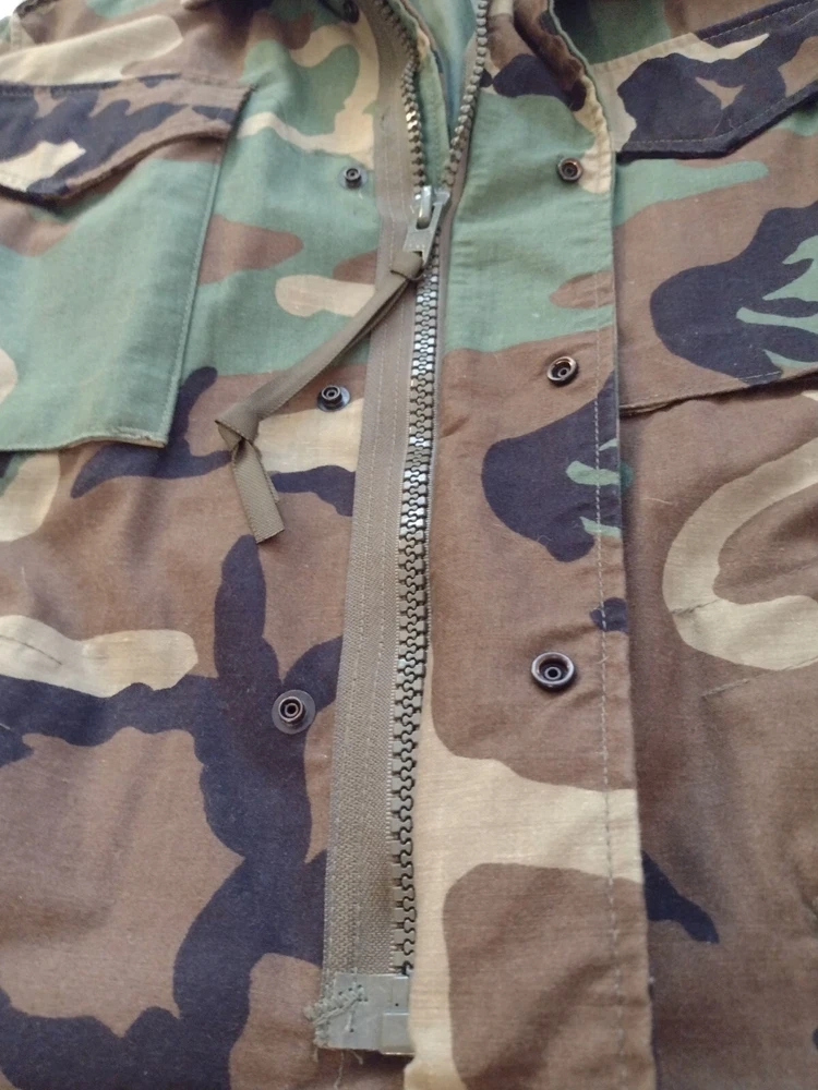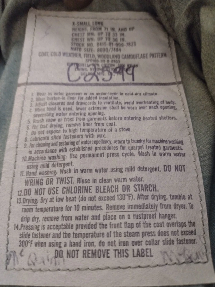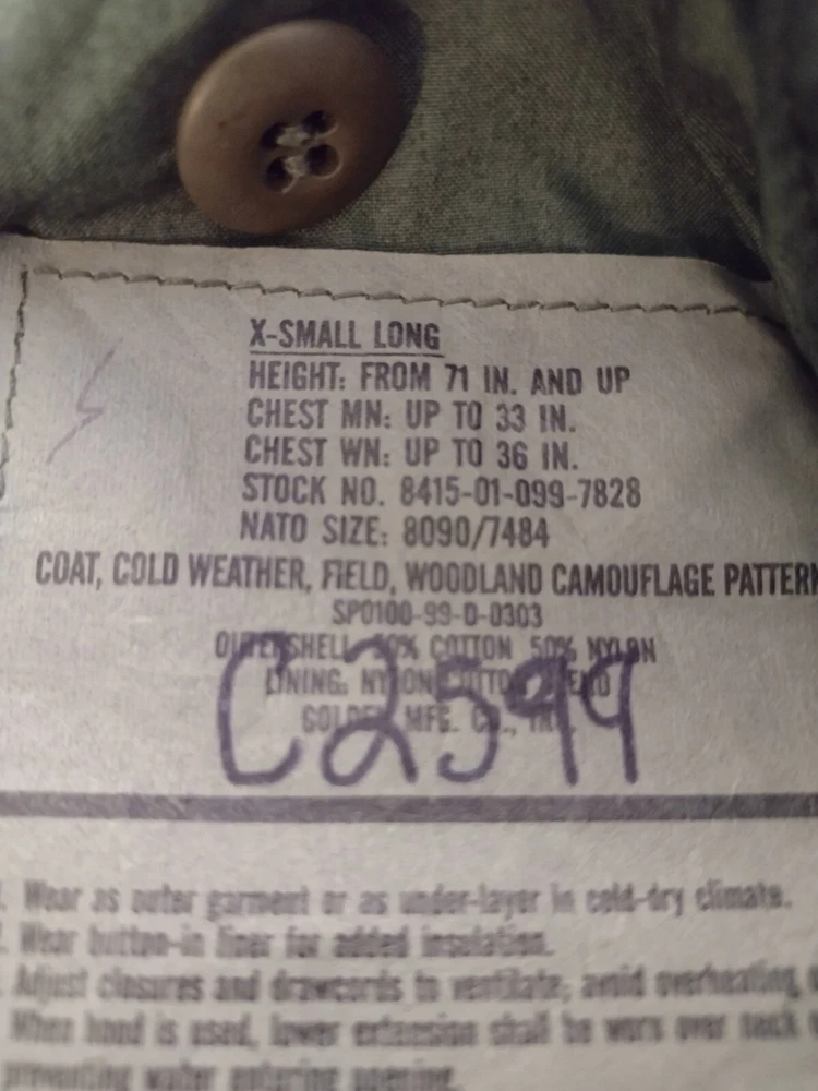 This is a U.S. Military issue Army Cold Weather Coat in woodlands / camouflage pattern, size XS long. It is a mid-length jacket featuring a button and zipper closure, drawstrings, and a cotton lining. The jacket has a band collar and is designed for unisex adults. It includes accents like pockets, a zip away hood, and is wind-resistant, suitable for all seasons. Made of nylon/cotton blend, it is machine washable and suitable for chest sizes up to 33 inches for men and 36 in for women. This jacket is in excellent condition. Please see photos for condition details.