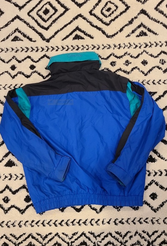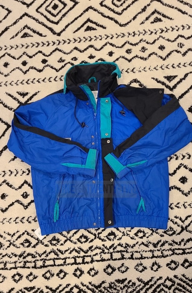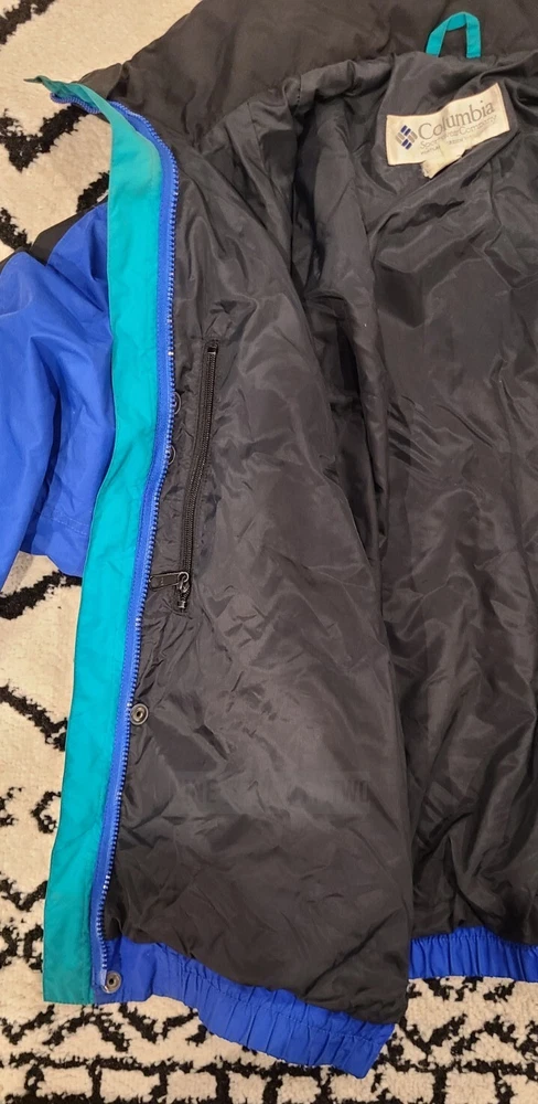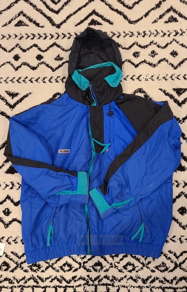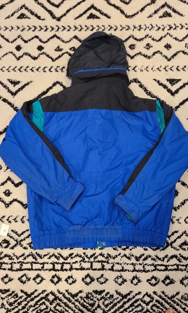 This vintage Columbia 3 in 1 jacket is perfect for any outdoor activity, whether it's skiing, hiking, or simply walking. The jacket is made with a durable nylon outer shell and features a full zip closure with zipped pockets, elastic waist, and a hood to provide extra warmth on windy days. It's perfect for all seasons, especially winter, fall, and spring. The jacket has a relaxed fit and comes in size Large. It's black in color with the Columbia logo accent. It's insulated with wind-resistant polyester and has a knit fabric type. The lining material is made of polyester, and it's machine washable for easy care. This jacket is a classic 90s retro sports style.