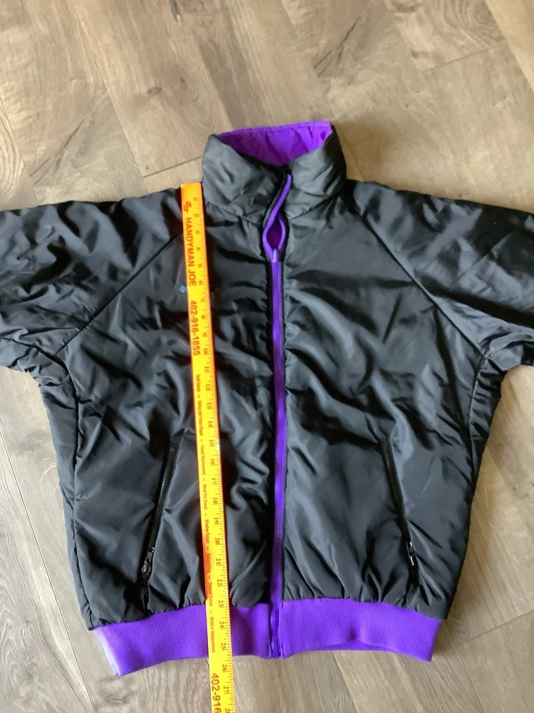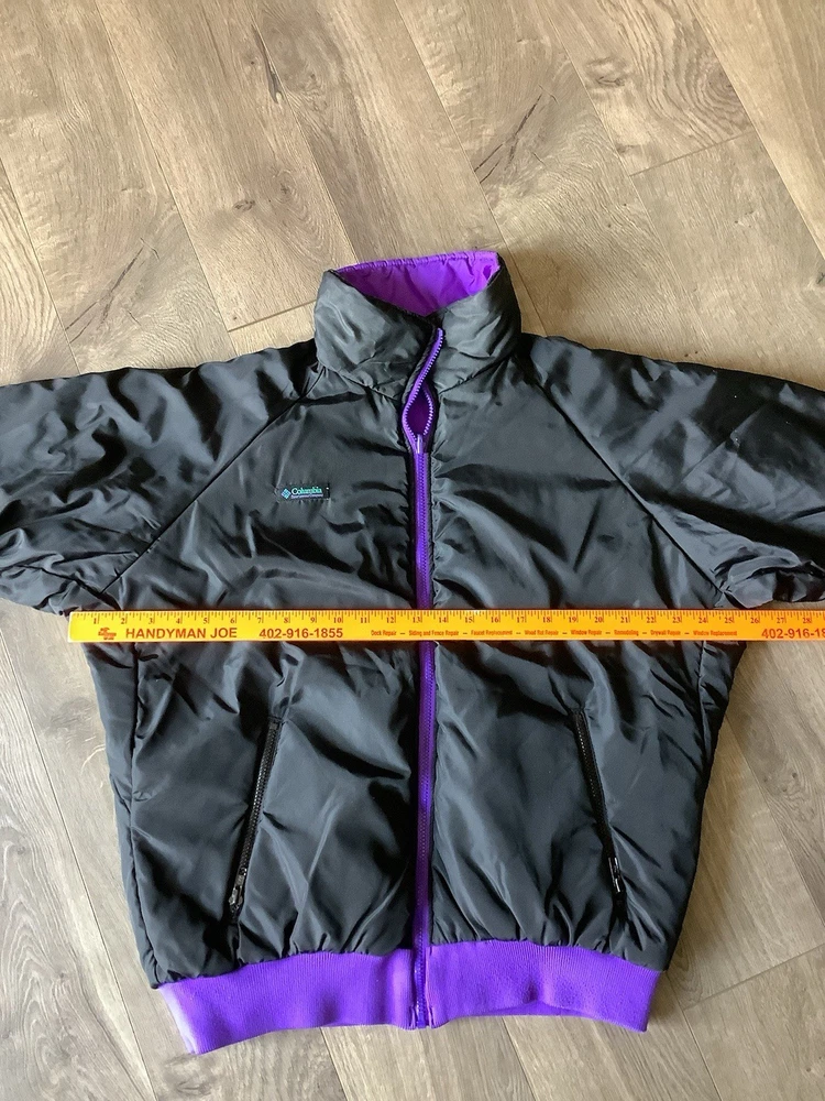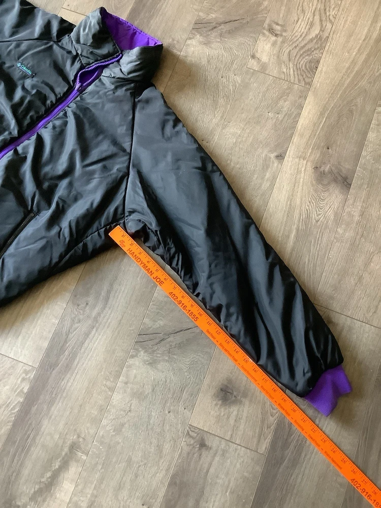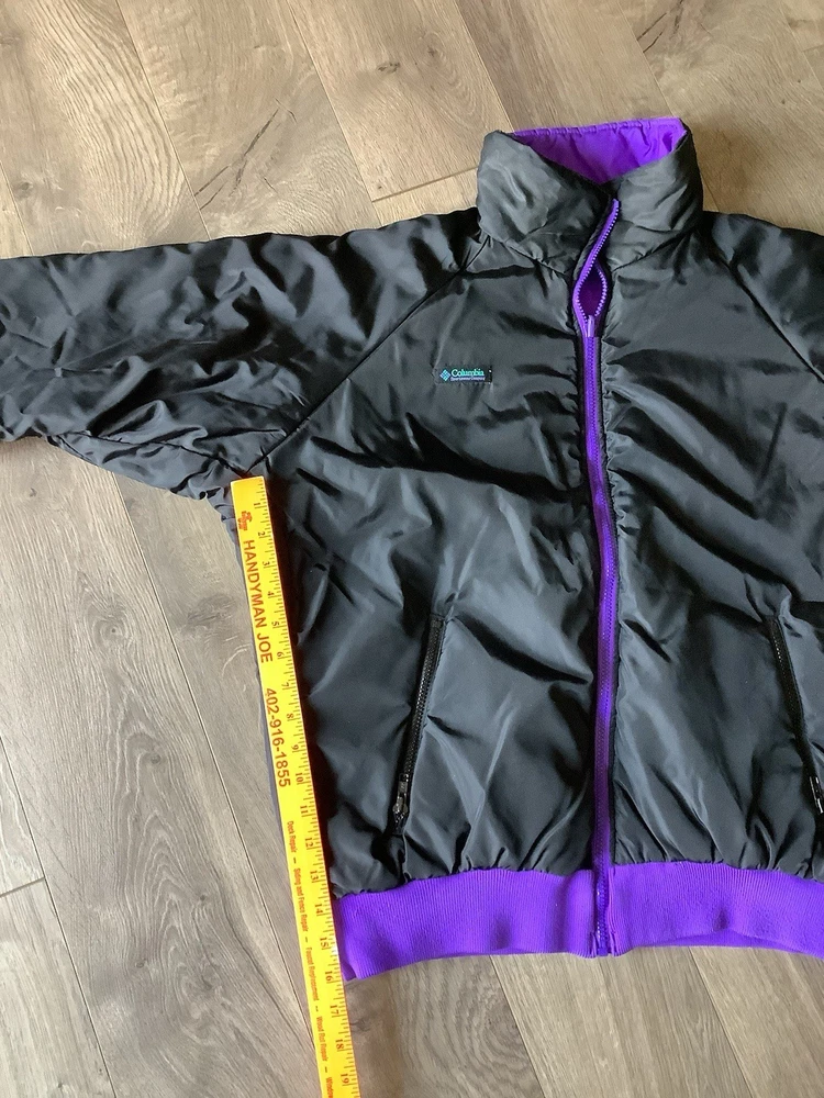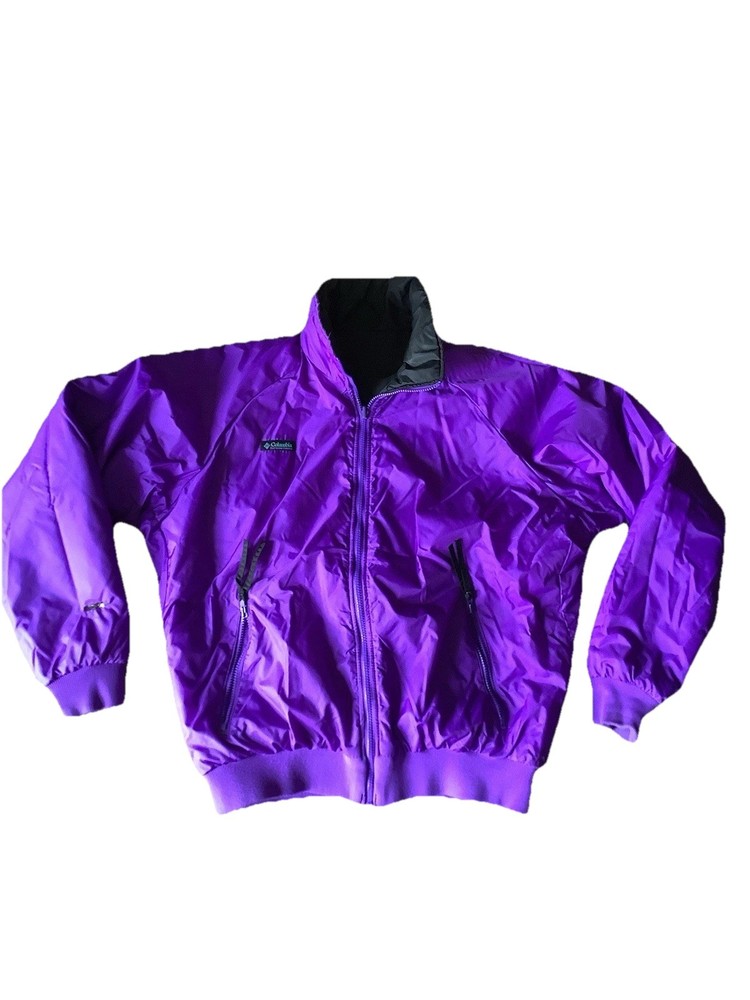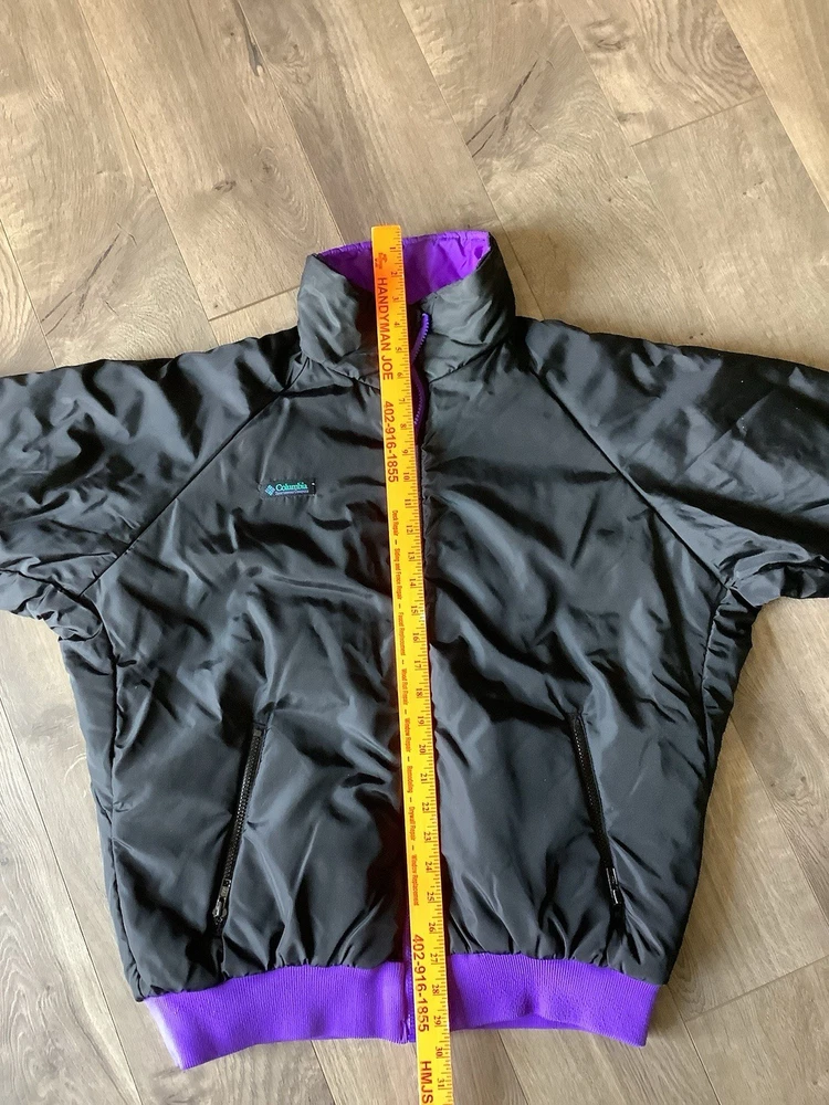 This vintage Columbia jacket is a stylish and versatile addition to any wardrobe. The reversible design allows for two different looks in one garment, perfect for casual outings or outdoor activities. The puffer style provides insulation and is wind-resistant, making it ideal for winter activities such as walking, riding, skiing, snowboarding, and hiking. The jacket is made of durable nylon and polyester materials and features a full zip closure, stand-up collar, and elastic waist for a comfortable fit. The mid-length cut and solid black or purple color make it a timeless piece that can be dressed up or down. This jacket is perfect for those who love the 80s and 90s vintage look and appreciate the functionality of a reversible puffer coat. On the purple size there is one small spot of damage where it appears the nylon was melted. Pet free and smoke free household.