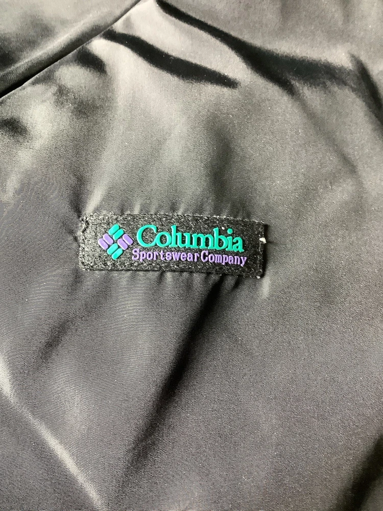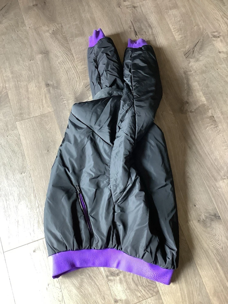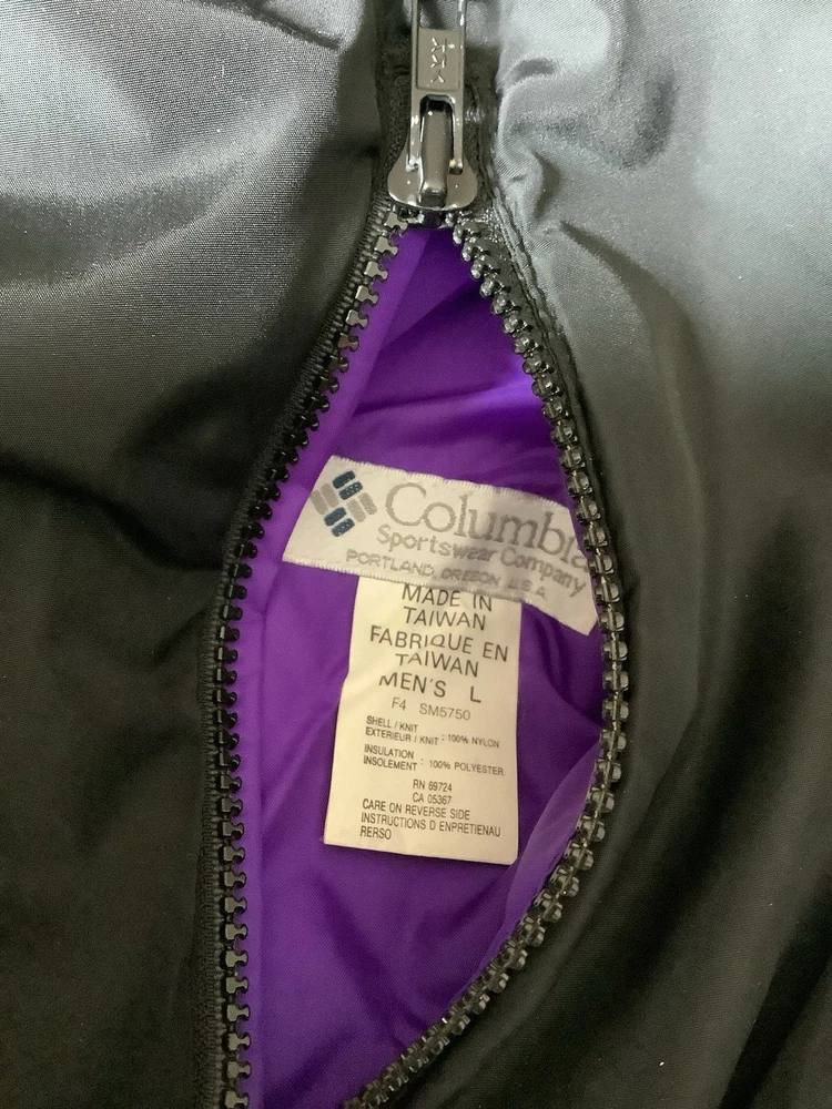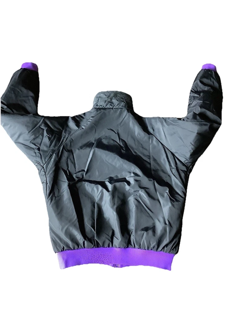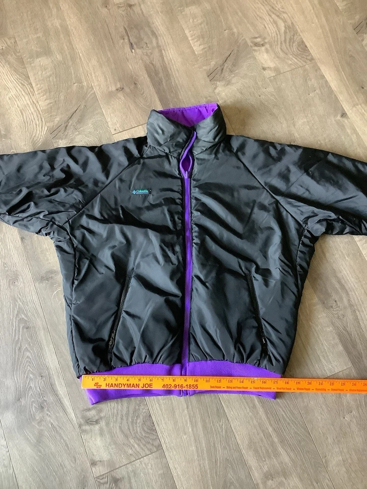 This vintage Columbia jacket is a stylish and versatile addition to any wardrobe. The reversible design allows for two different looks in one garment, perfect for casual outings or outdoor activities. The puffer style provides insulation and is wind-resistant, making it ideal for winter activities such as walking, riding, skiing, snowboarding, and hiking. The jacket is made of durable nylon and polyester materials and features a full zip closure, stand-up collar, and elastic waist for a comfortable fit. The mid-length cut and solid black or purple color make it a timeless piece that can be dressed up or down. This jacket is perfect for those who love the 80s and 90s vintage look and appreciate the functionality of a reversible puffer coat. On the purple size there is one small spot of damage where it appears the nylon was melted. Pet free and smoke free household.