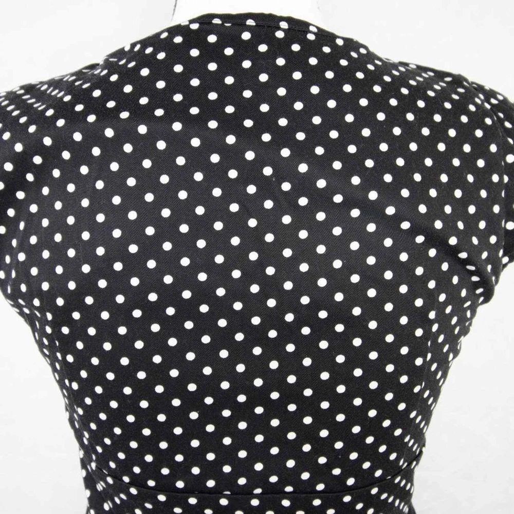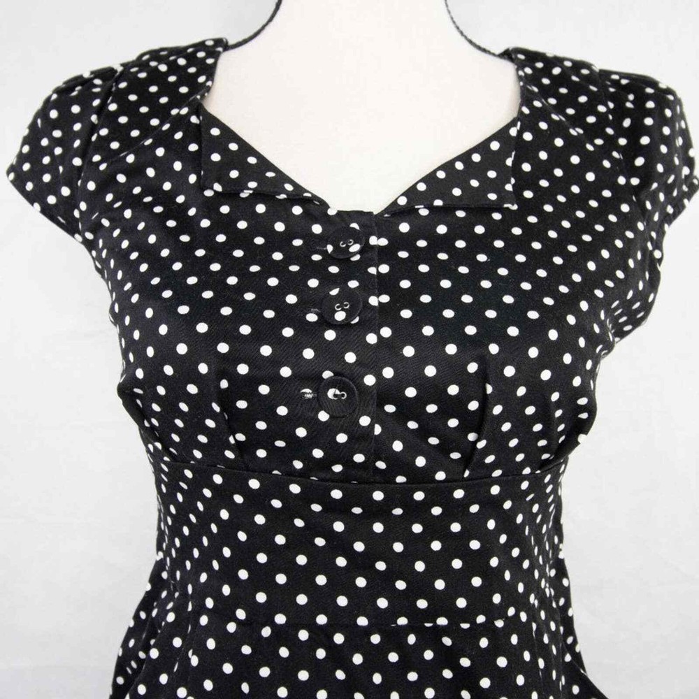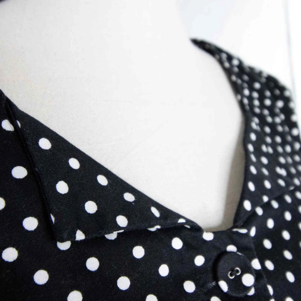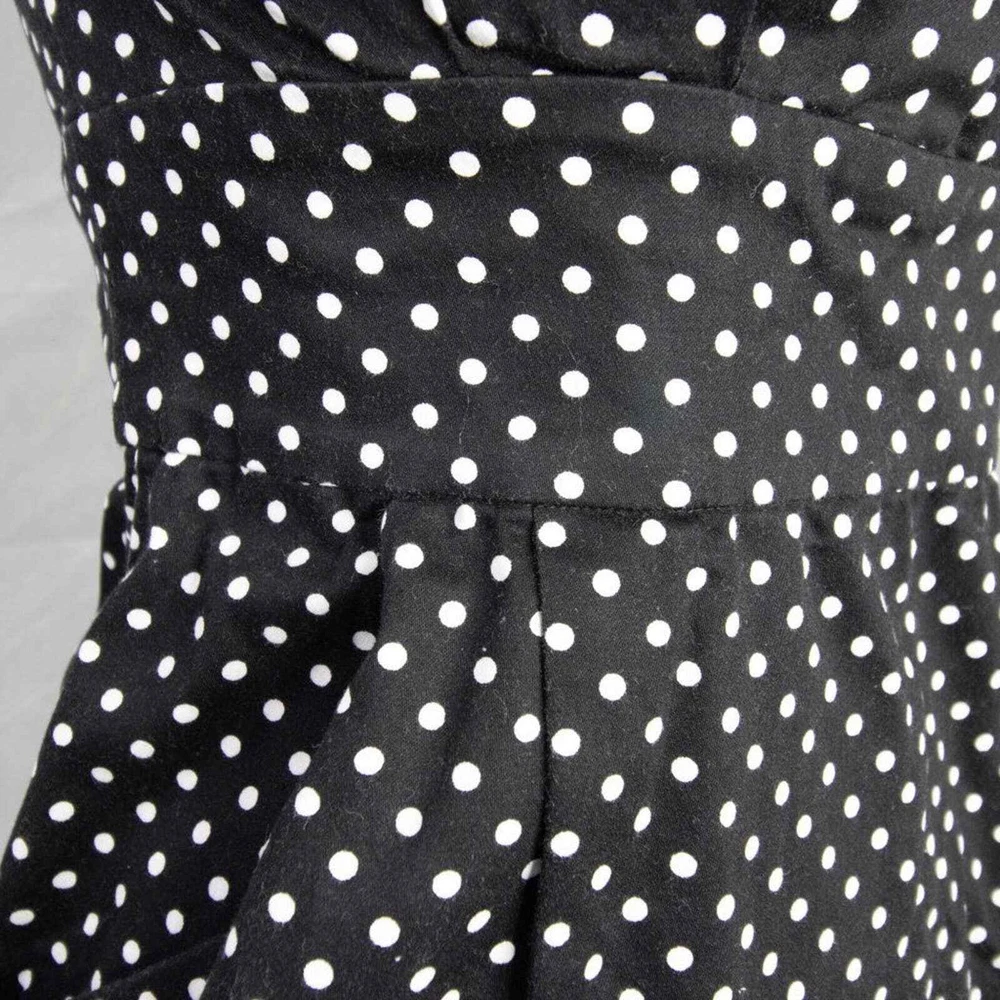 <![CDATA[<div>Vintage Cotton Polka Dot black and white dress -Classic black and white polka dot. -Button up front -Waisted - Beautiful heart-shape neck -Short Bubble sleeves Material: 92% cotton, 2.8% spandex. Tag marked "155/80A", fits like U.S. XXS. Please read approx. laid flat measurements for your best fit: Pit to Pit: 15 1/2 in; Waist: 14 1/4 in; Length from high point of shoulder down: 31 1/4 in.