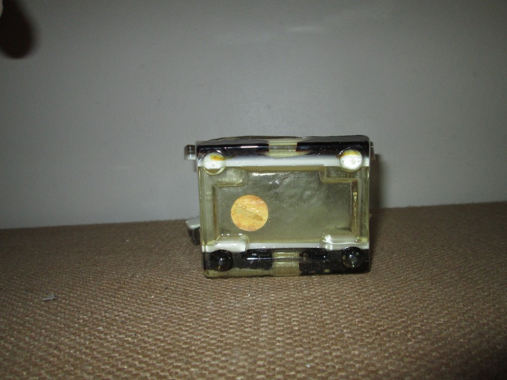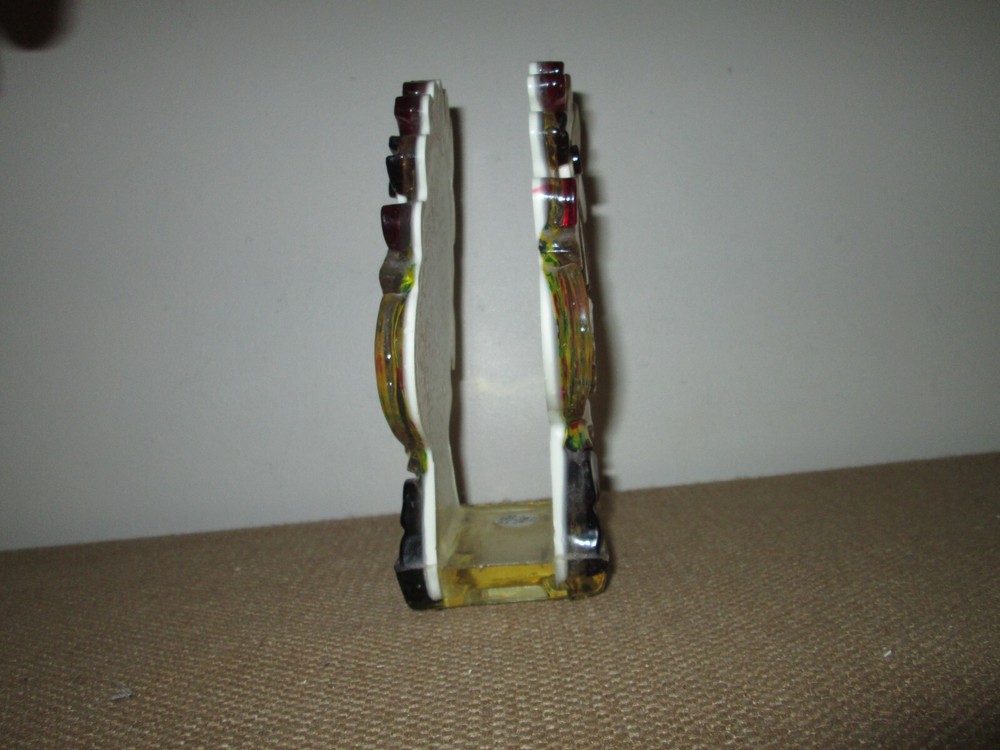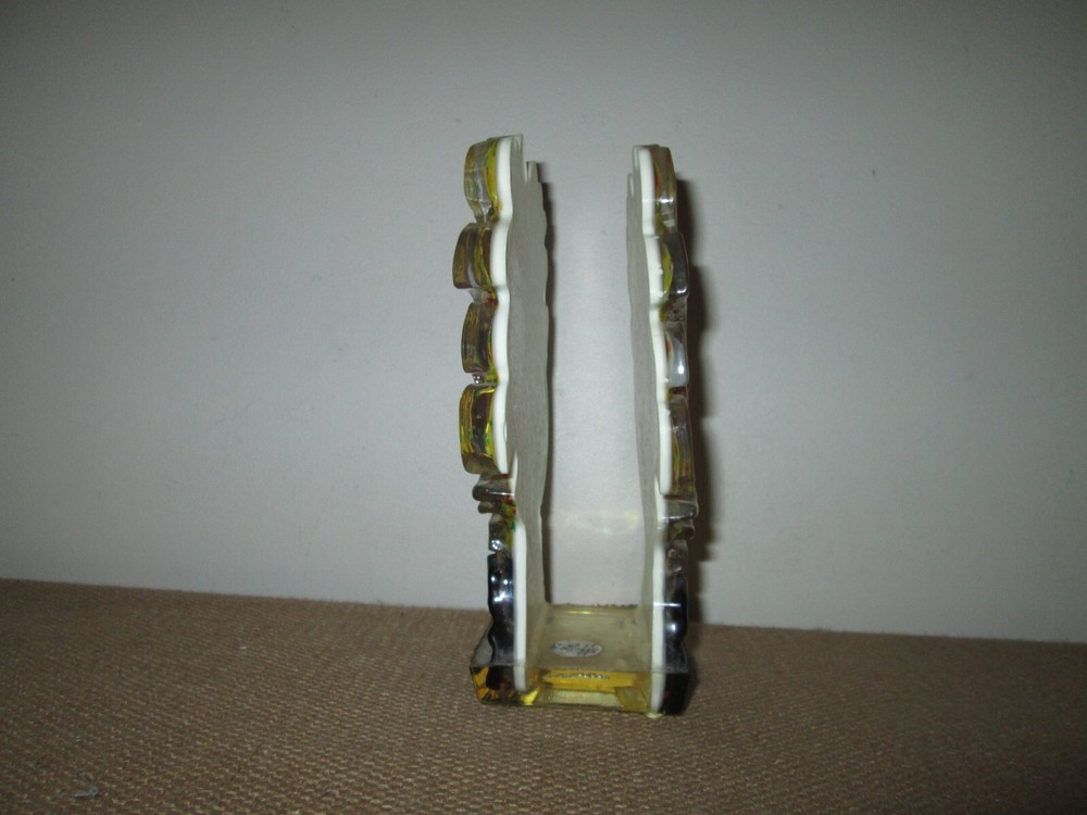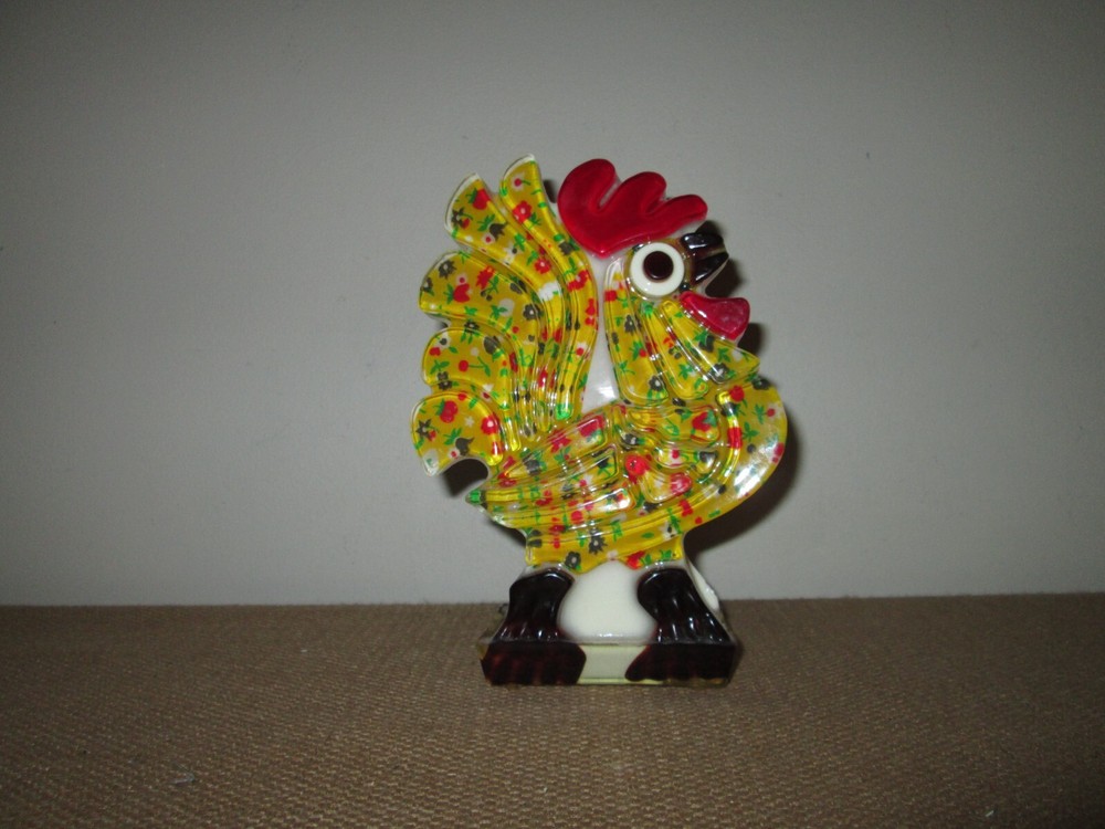 Vintage 70s era lucite rooster/chicken napkin or mail holder. Multicolor, but the main portion is yellow calico. It stands approximately 7.5" tall x 5" wide x 2.5" deep. Excellent vintage condition wi...