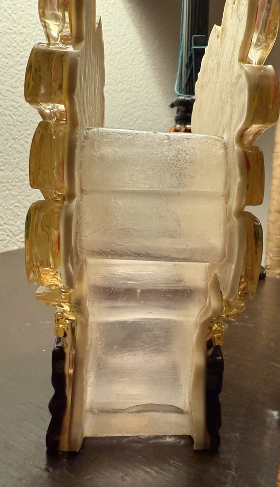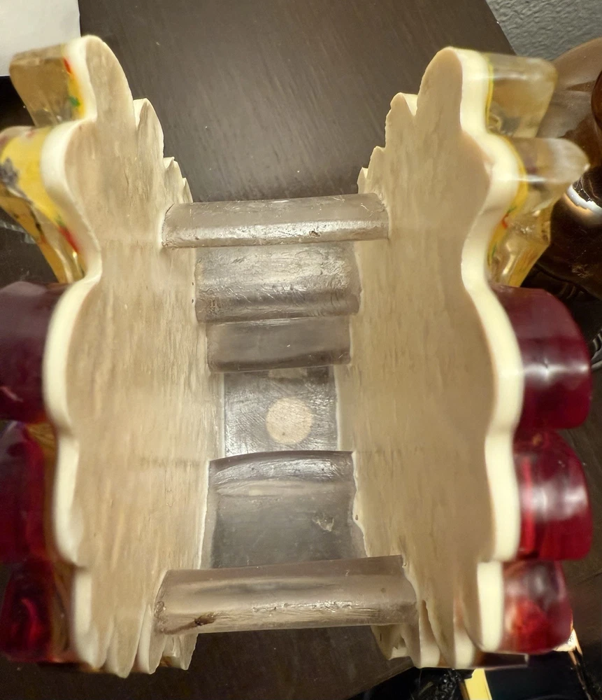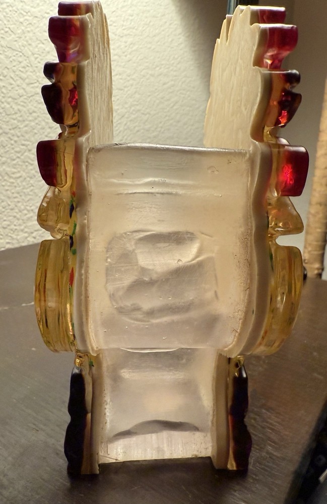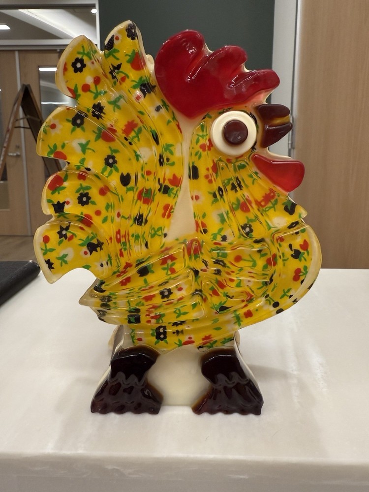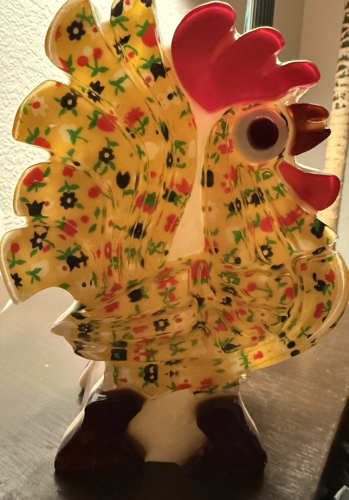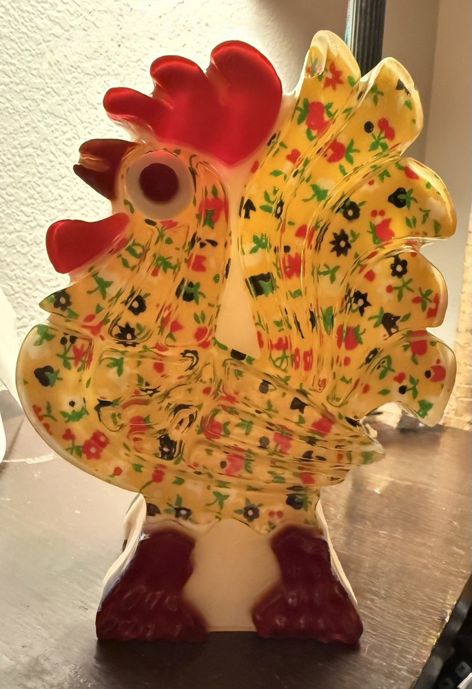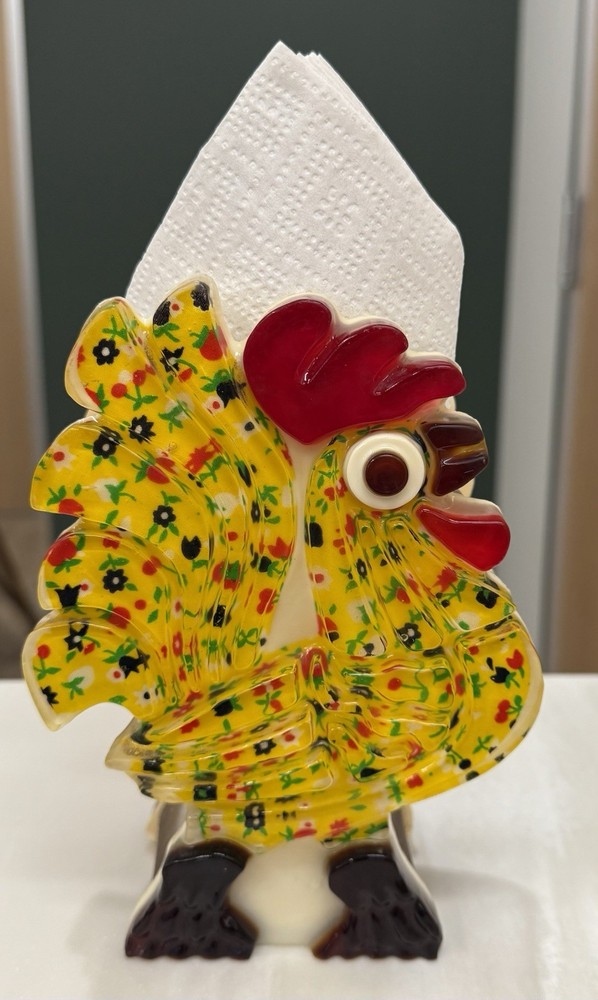 Bring bold color and retro flair to your kitchen or dining area with this fabulous vintage rooster napkin holder! Made of sturdy Lucite, this playful piece features a vibrant yellow calico floral pattern with a glossy red comb and deep brown feet. Perfect for fans of kitschy kitchen décor, mid-century style, or quirky animal collectibles. Use it for napkins, mail, or as a cheerful shelf display. • Approx. 7.5” tall x 5” wide • Great vintage condition with no cracks • Eye-catching 1970s-style pattern
