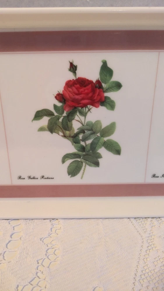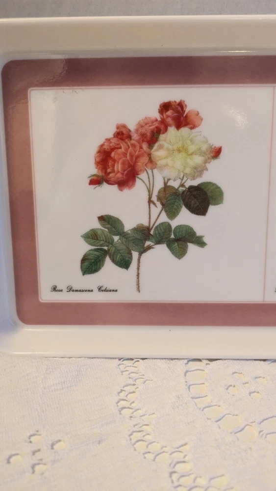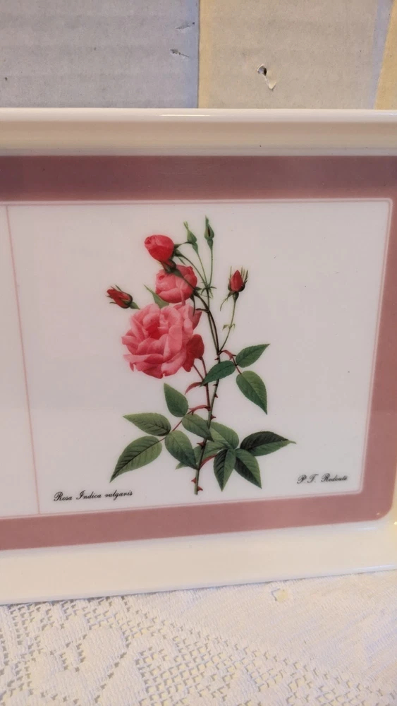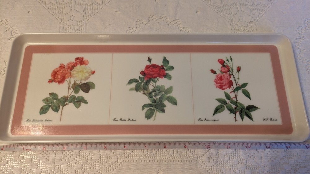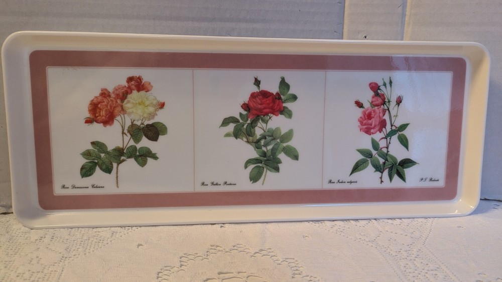 This lovely melamine tray is in excellent pre owned condition Features Rosa Damascena Celsiana, Rosa Gallica Pontiana and Rosa Indica Vulgaris. Signed P T Redoute Design Imports Ltd Providence Rhode Island Made in Italy This beautiful botanical tray will ship free to you from a smoke-free home