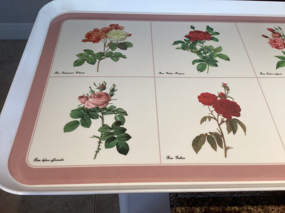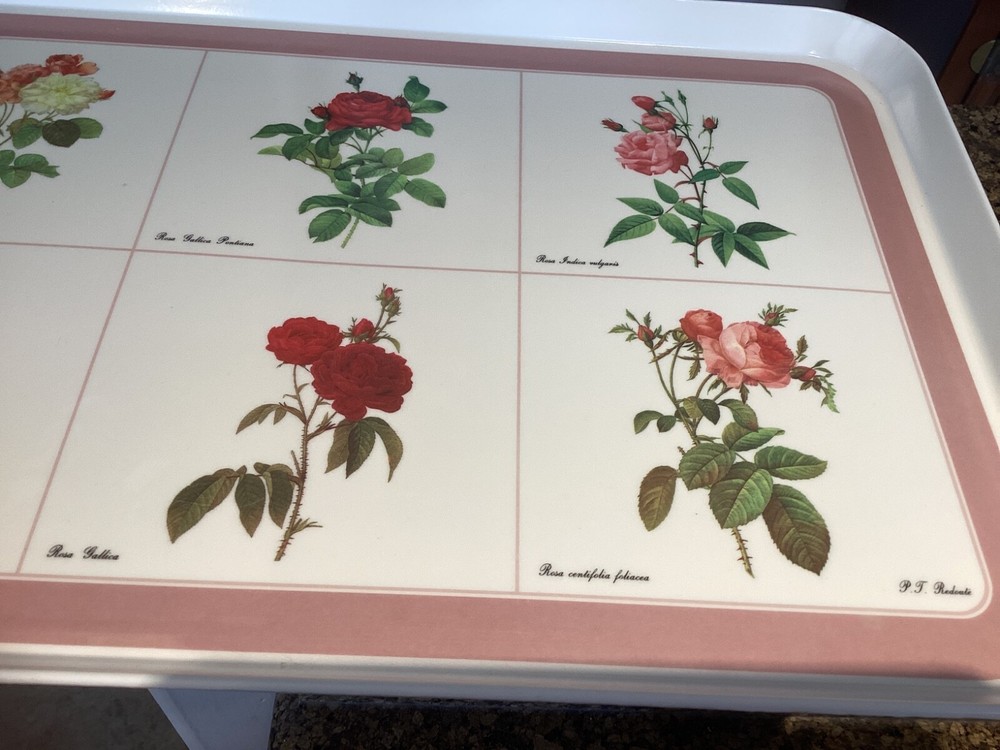 This lovely melamine tray is in excellent pre owned condition Features Rosa Damascena Celsiana, Rosa Gallica Pontiana and Rosa Indica Vulgaris. Signed P T Redoute Design Imports Ltd Providence Rhode Island Made in Italy This beautiful botanical tray is in excellent condition 17.5” X 11 5/8”